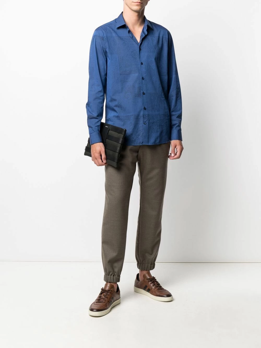 Jacquard à motifs, col classique, manches longues, poignets boutonnés, boutonnière sur le devant. Couleur : bleu. Matière : coton.