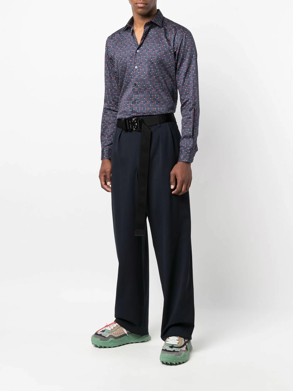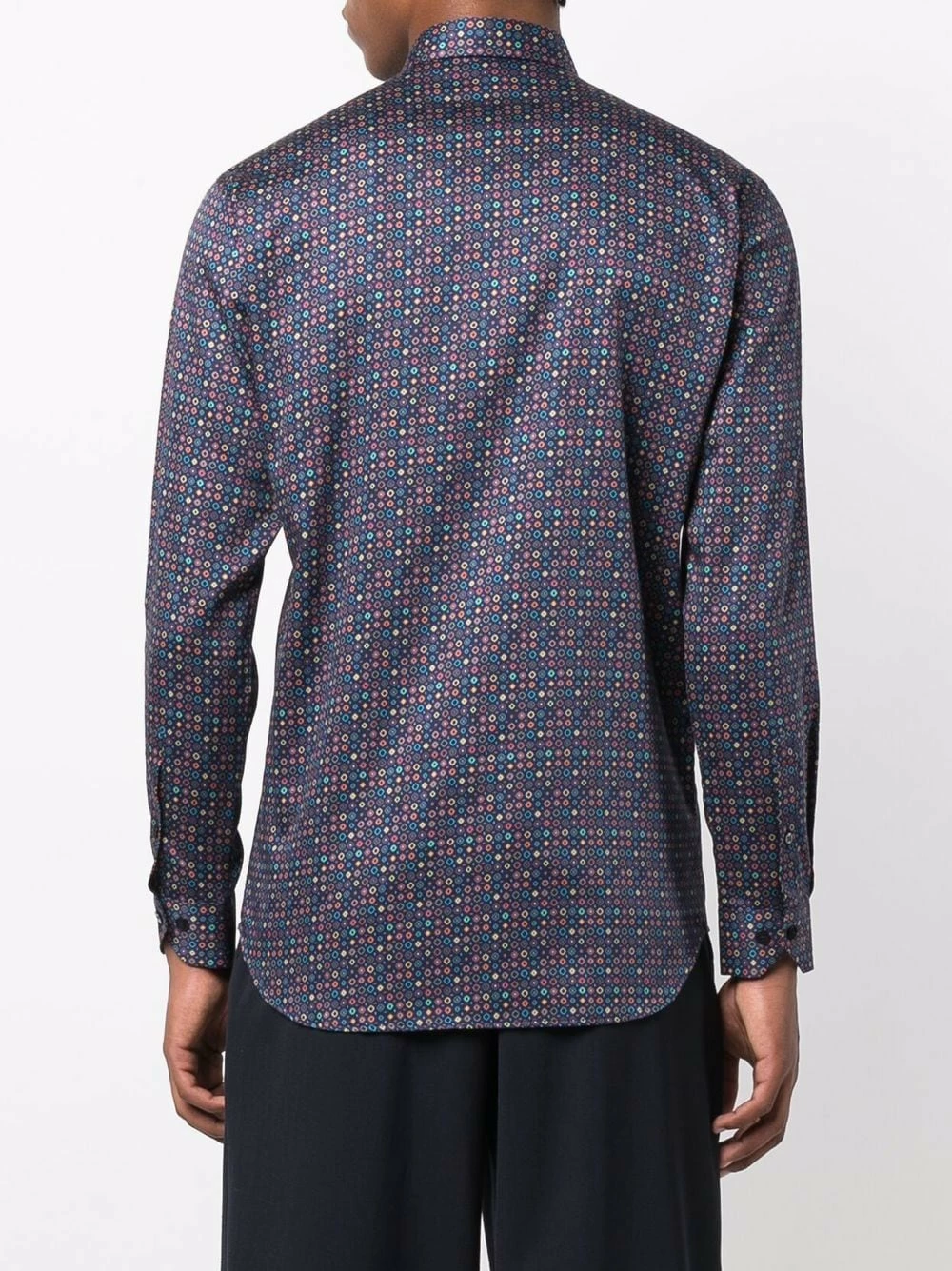 Imprimé à pois, col classique, boutonnière sur le devant, manches longues, poignets boutonnés, ourlet incurvé au dos. Matière : coton.