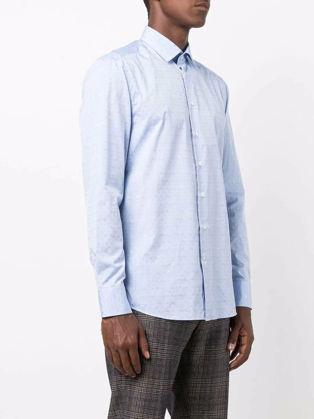 Tête de mort brodée sur l’avant, tête de mort brodée sur l’arrière, col classique, boutonnière sur le devant, manches longues, ourlet incurvé. Couleur : bleu. Matière : coton.