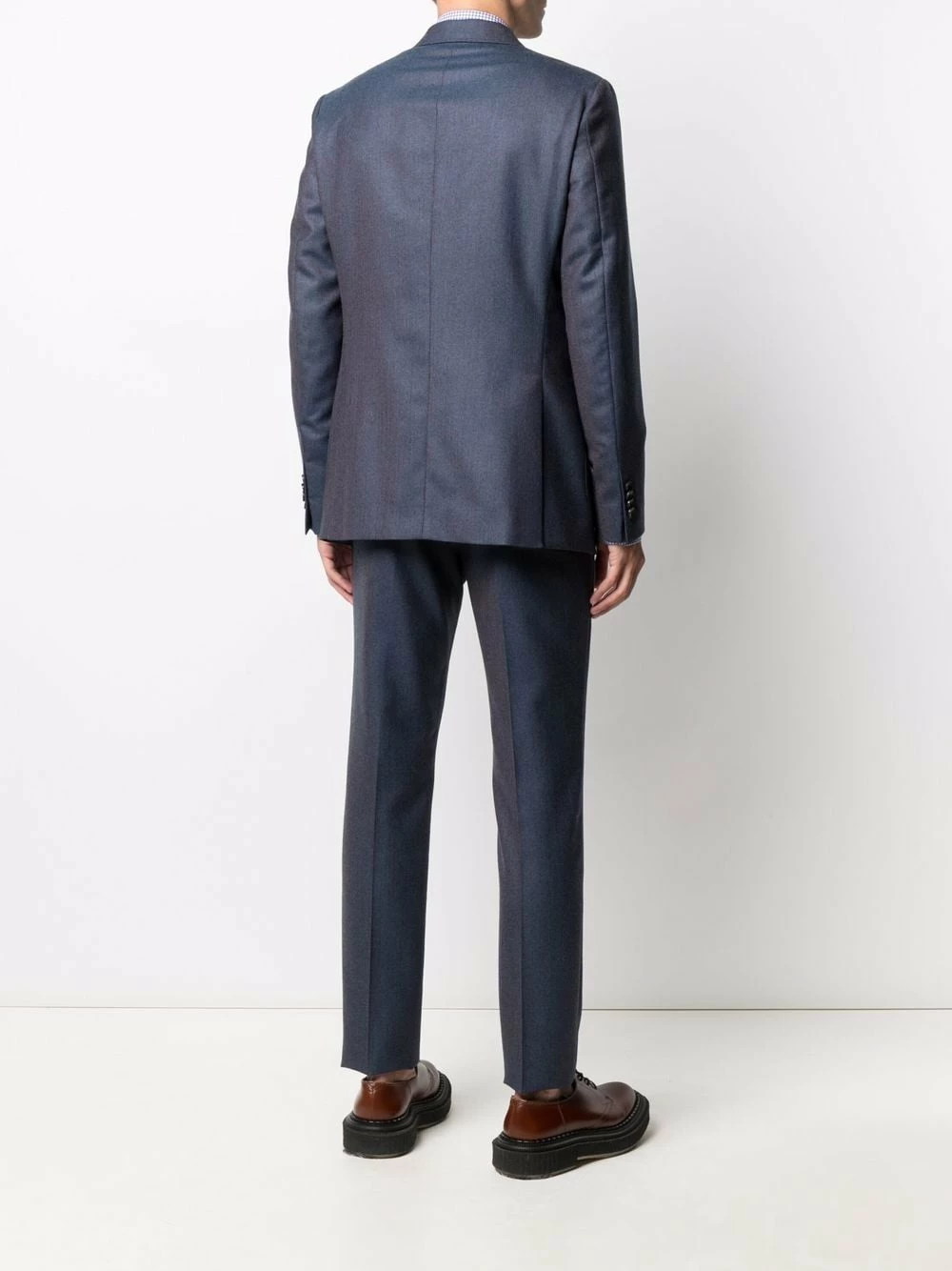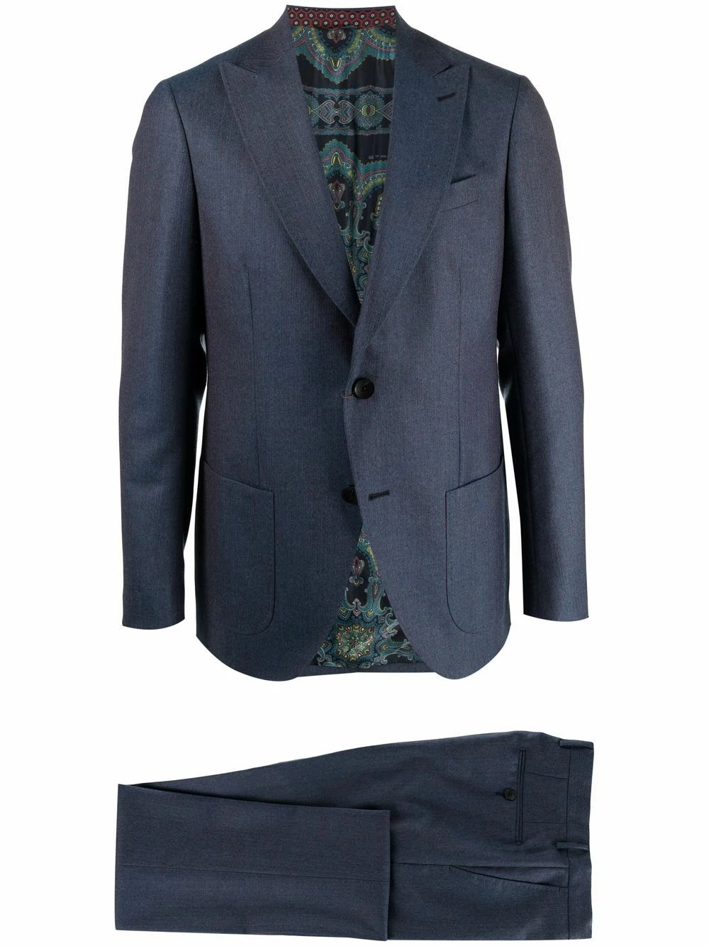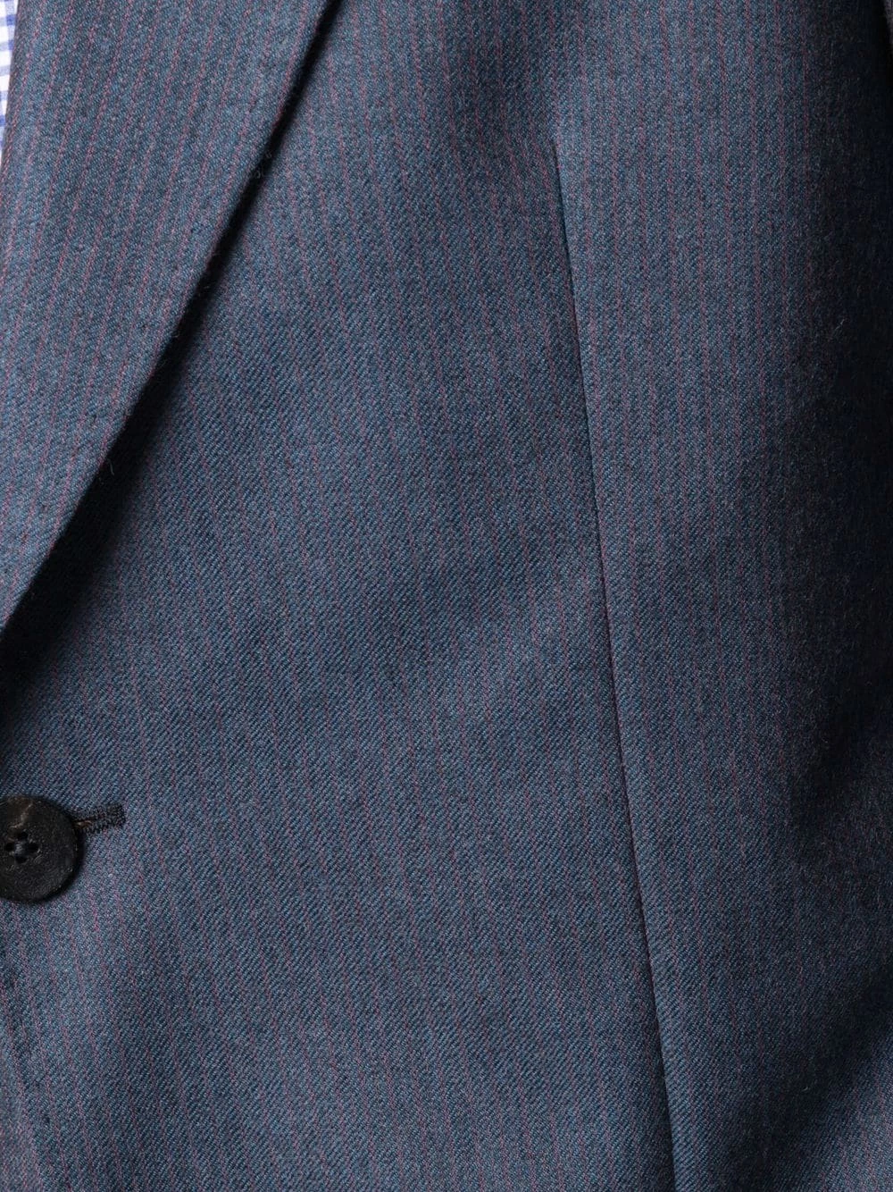 Effet délavé, fines rayures, pinces, larges revers pointus, boutonnière sur le devant, poche passepoilée sur la poitrine, deux poches plaquées avant, manches à poignets boutonnés, double fente arrière. Couleur : bleu. Matière : laine.