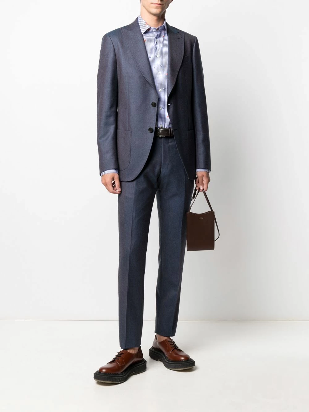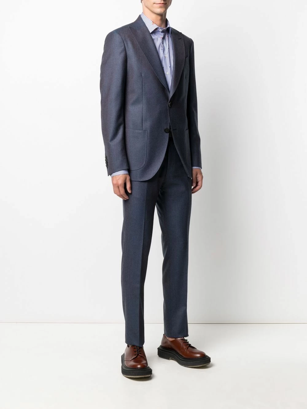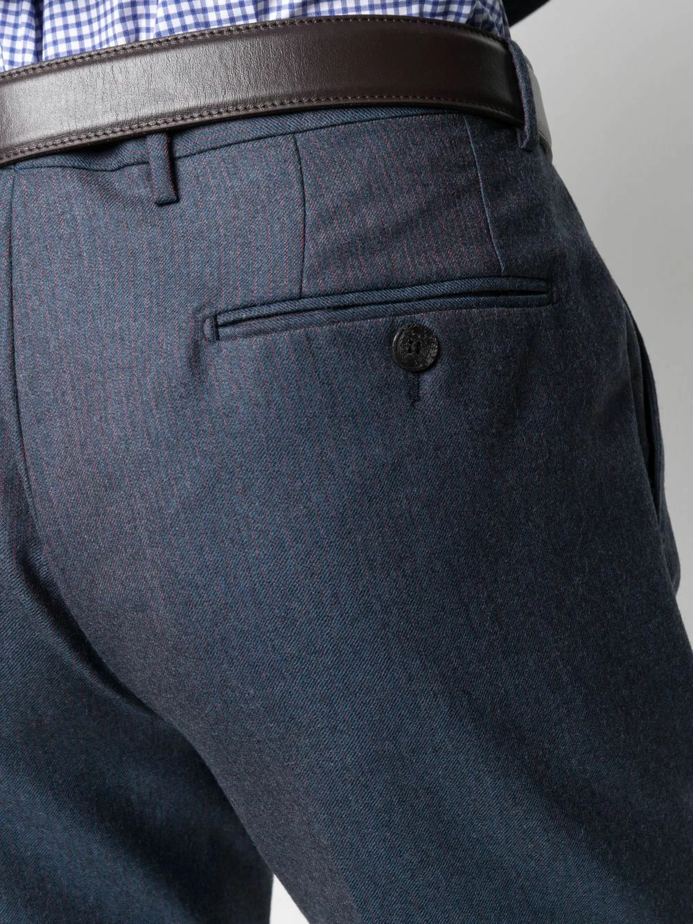 Effet délavé, fines rayures, pinces, larges revers pointus, boutonnière sur le devant, poche passepoilée sur la poitrine, deux poches plaquées avant, manches à poignets boutonnés, double fente arrière. Couleur : bleu. Matière : laine.