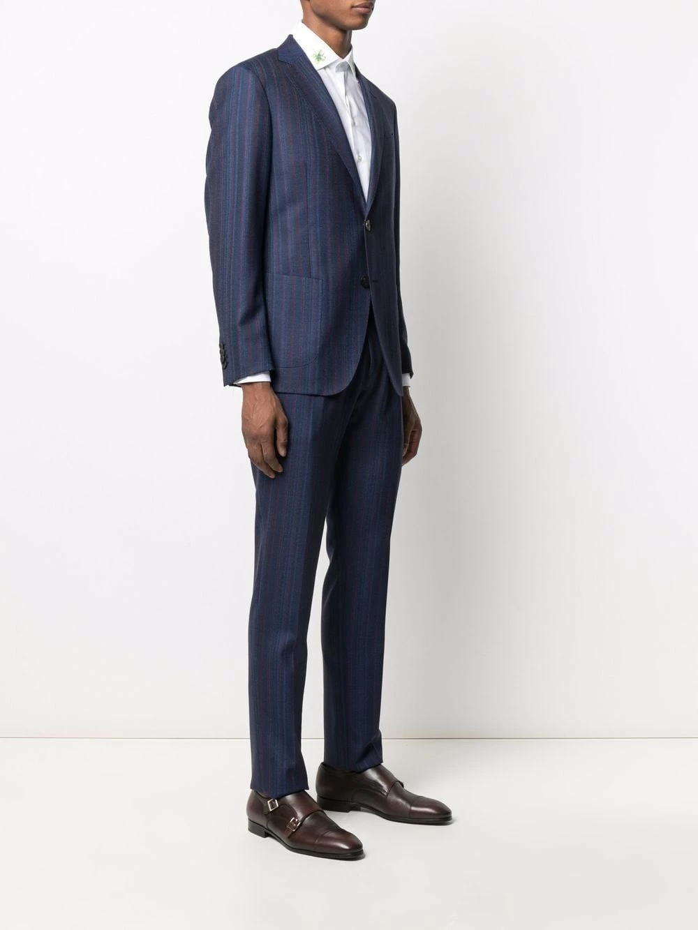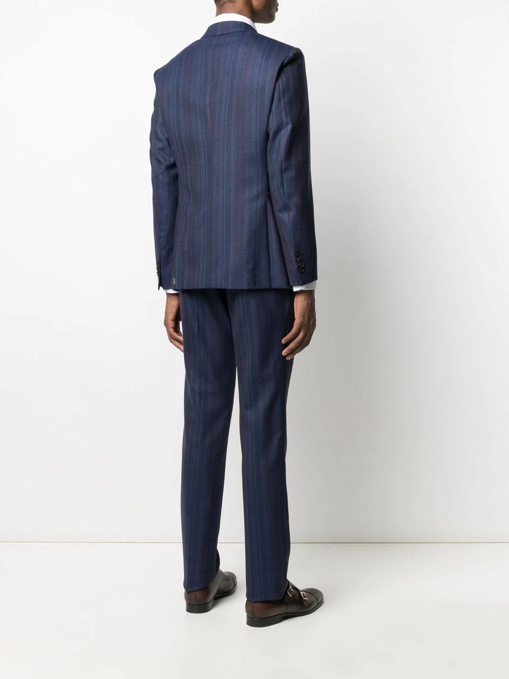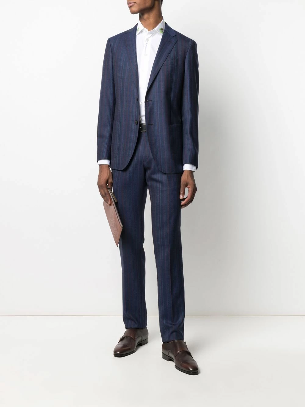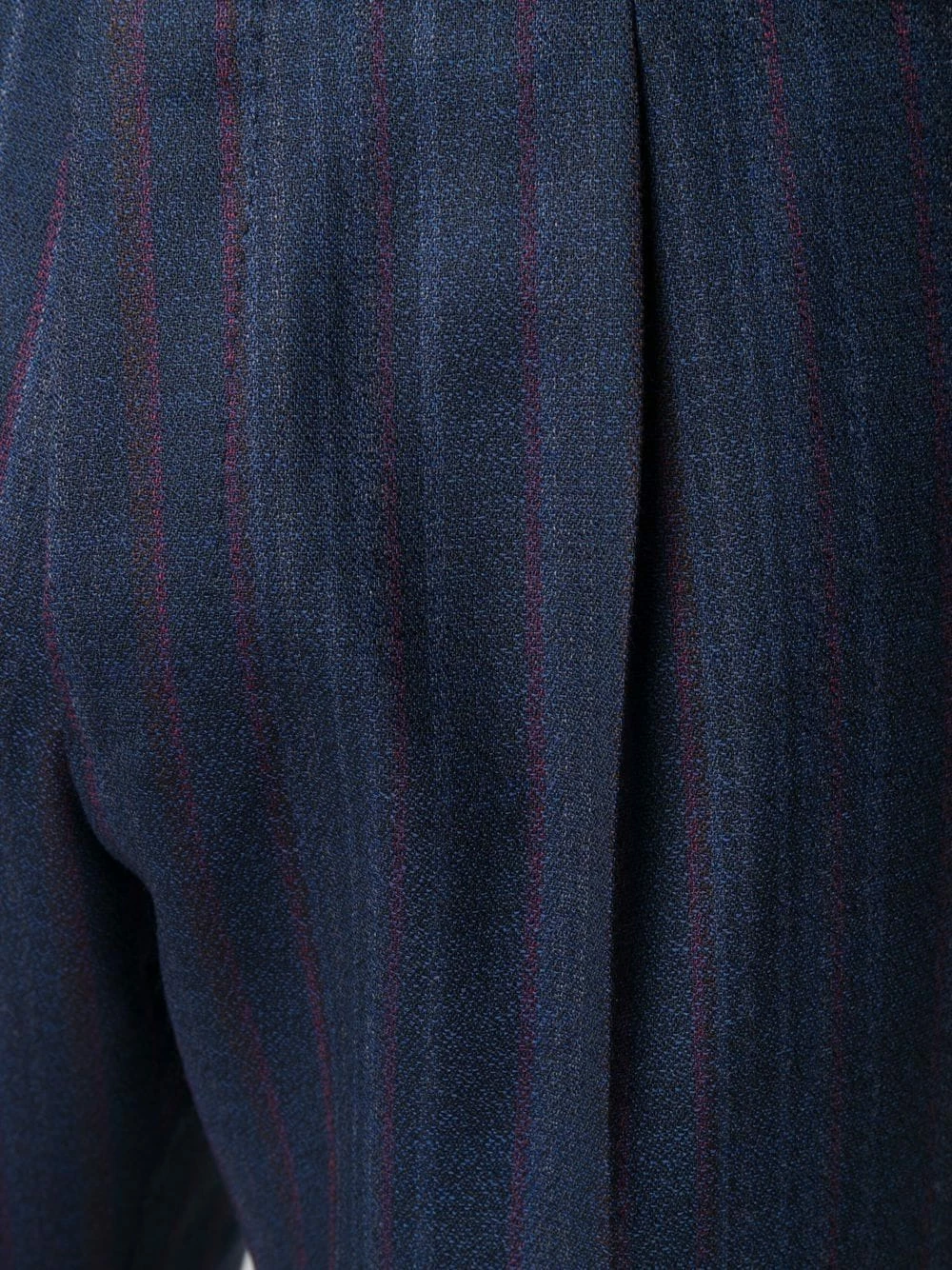 Rayures verticales, revers crantés, boutonnière sur le devant, poche passepoilée sur la poitrine, poches latérales kangourou, double fente arrière, épaulettes, taille mi-haute, passants de ceinture, fermeture dissimulée sur le devant, détails de plis, deux poches latérales fendues. Couleur : bleu.