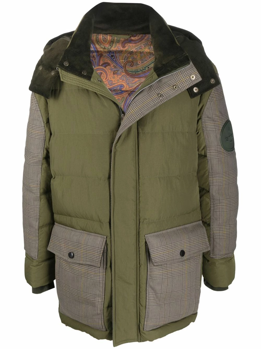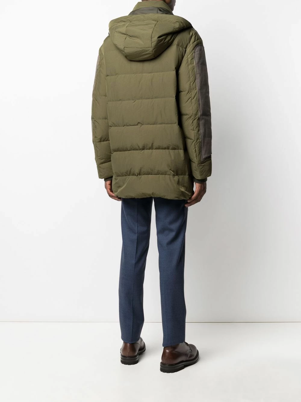 Garnissage en duvet, design matelassé, motif de chevrons, col montant, capuche détachable, fermeture dissimulée sur le devant, deux poches boutonnées, manches longues, poignets élastiqués. Matière : coton.