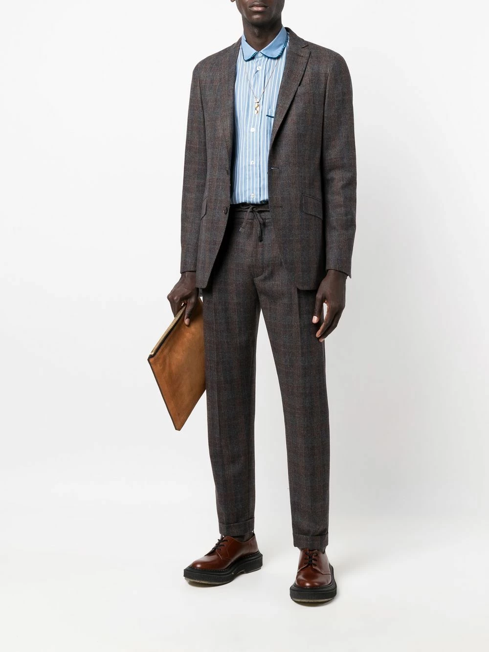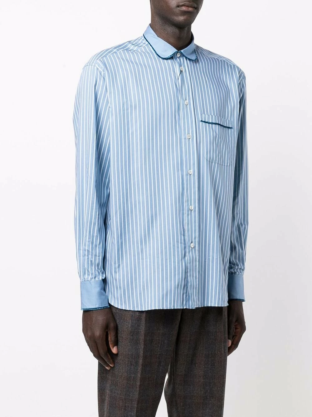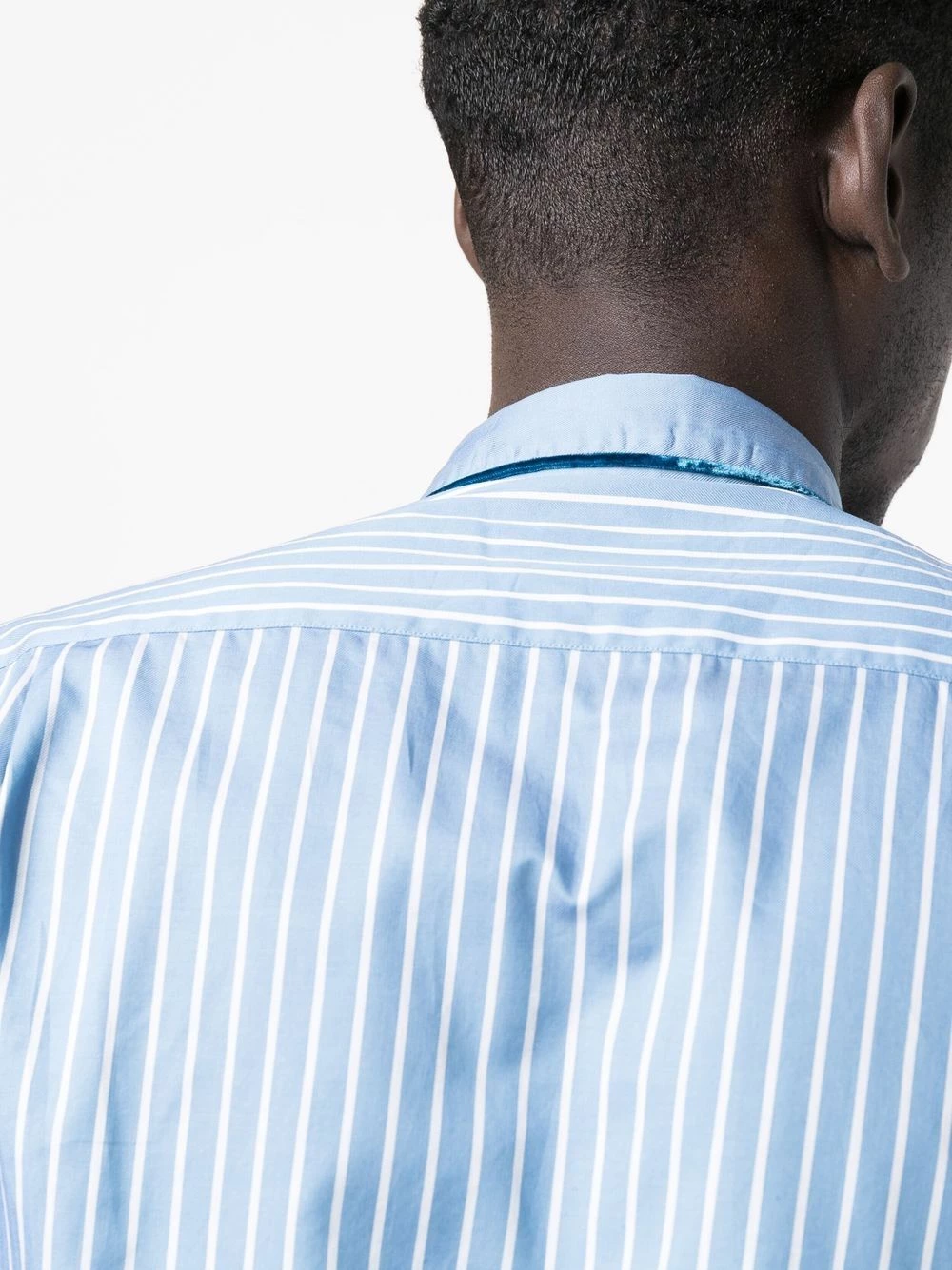 Imprimé à rayures, finitions en velours, col montant, boutonnière sur le devant, poche poitrine plaquée, manches à poignet boutonné, ourlet incurvé au dos. Matière : coton.