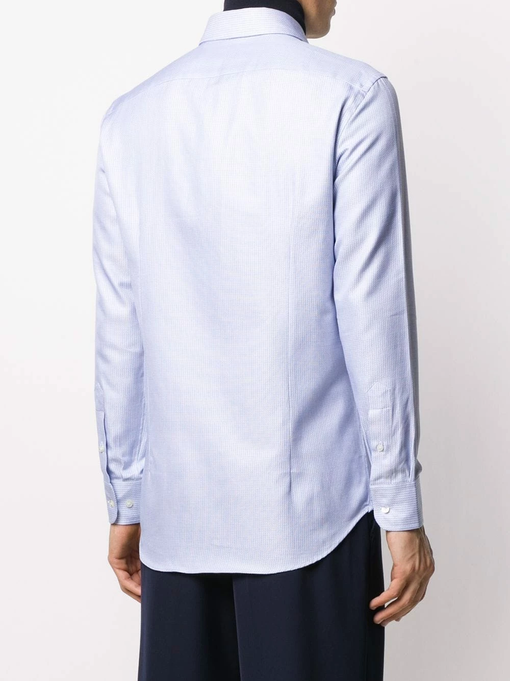 Chemise à logo brodé en coton ETRO avec col boutonné, logo contrastant brodé sur la poitrine, boutonnière sur le devant, manches longues, poignets boutonnés et ourlet droit. Couleur : bleu.
