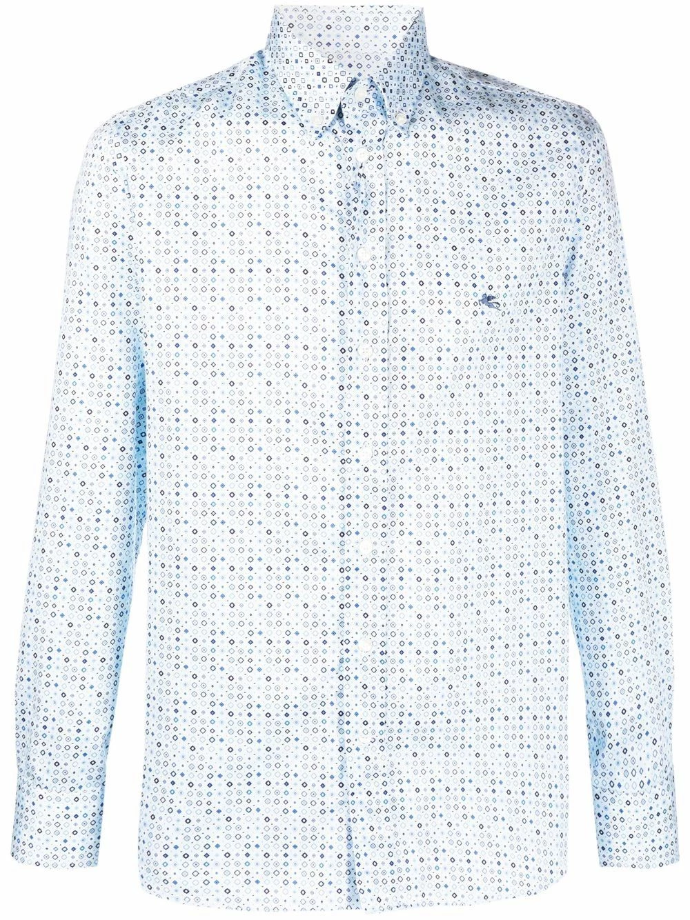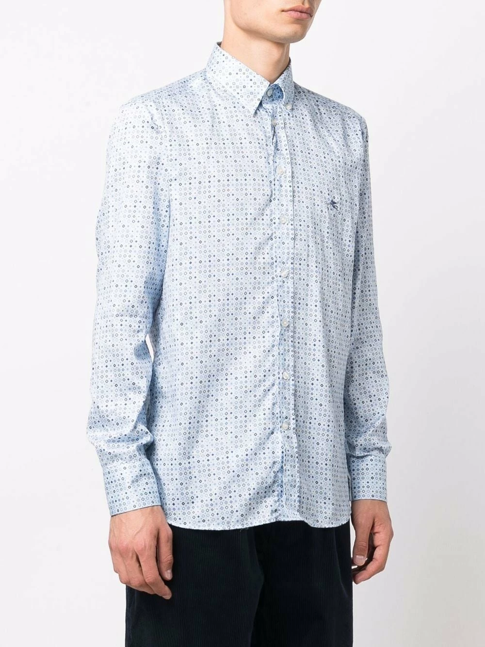 Tissage popeline, imprimé abstrait, logo brodé sur la poitrine, col boutonné, boutonnière sur le devant, poignets boutonnés. Couleur : bleu. Matière : coton.
