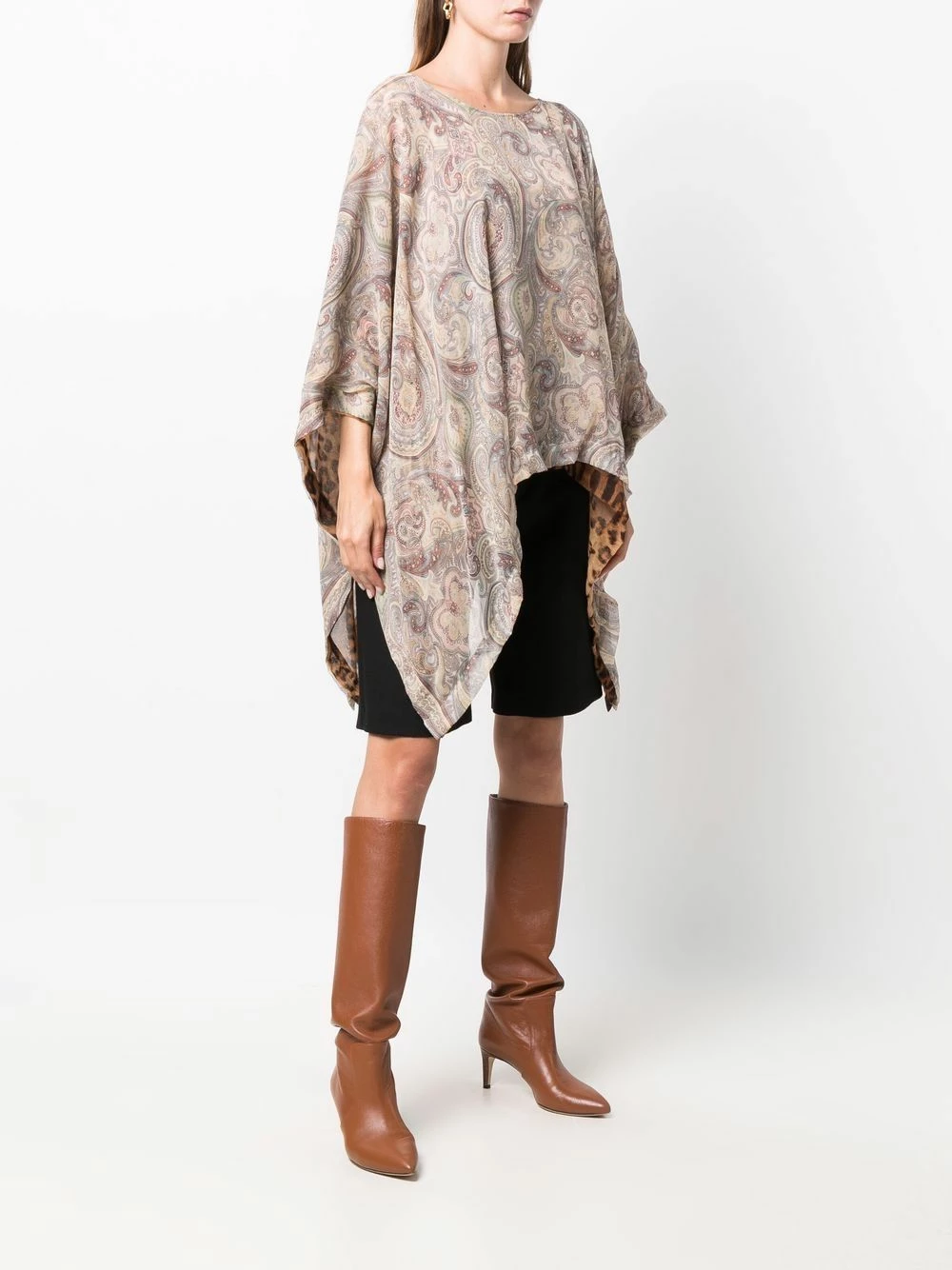Motif cachemire, imprimé léopard, encolure ronde, manches drapées longues, ourlet plus long au dos. Matière : soie.