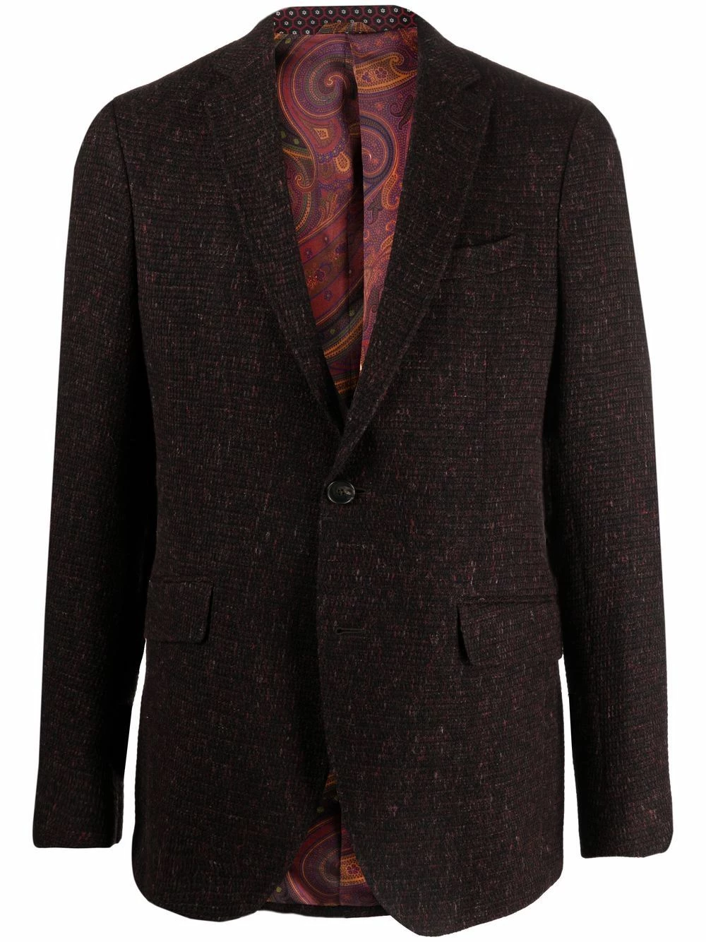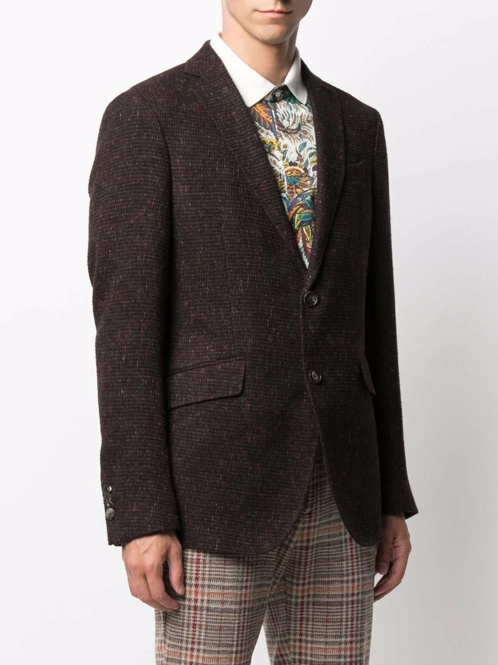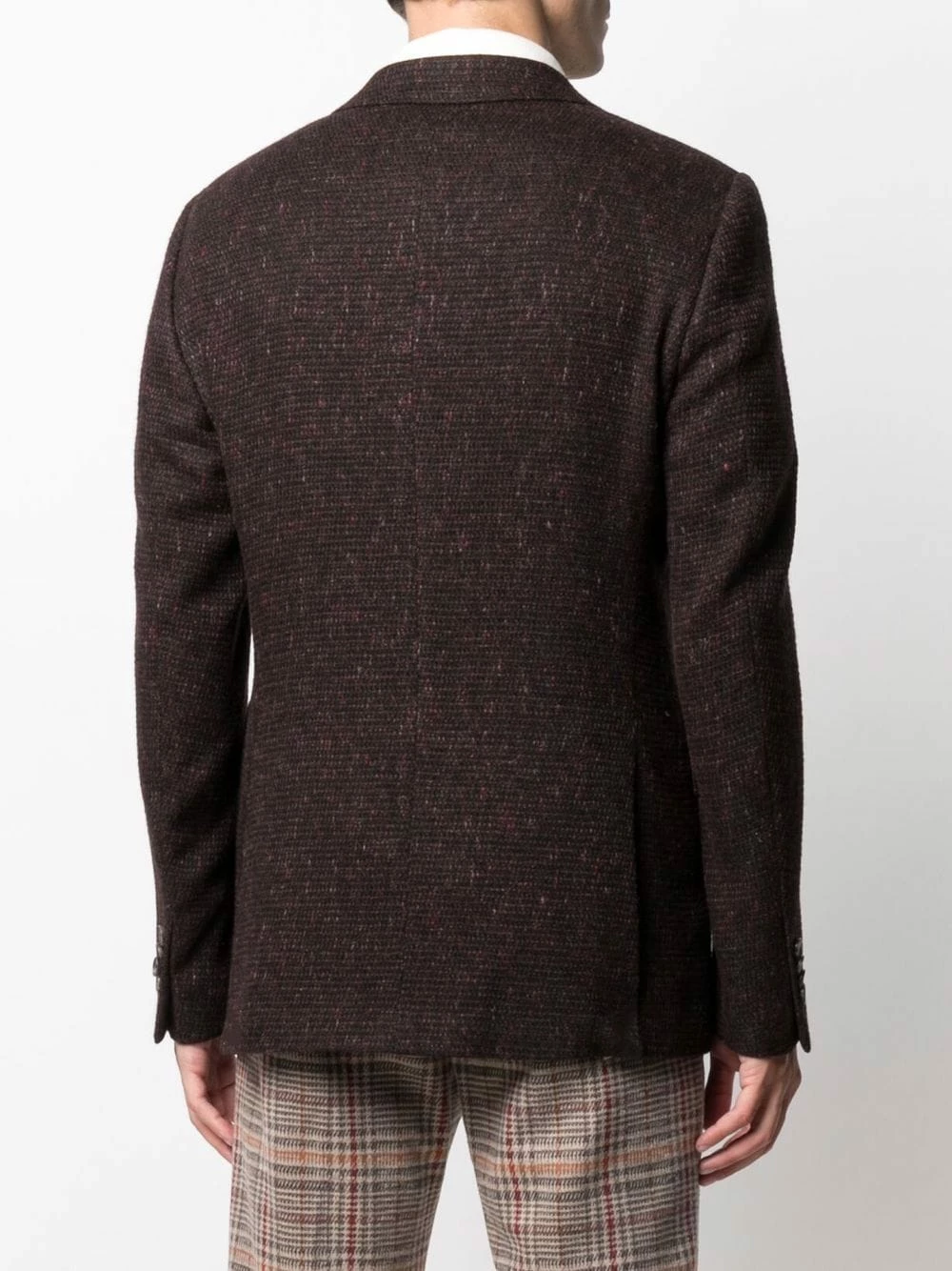 Revers crantés, manches longues, poignets boutonnés, boutonnière sur le devant, poche passepoilée sur la poitrine, poches latérales à rabat, double fente arrière. Couleur : marron.