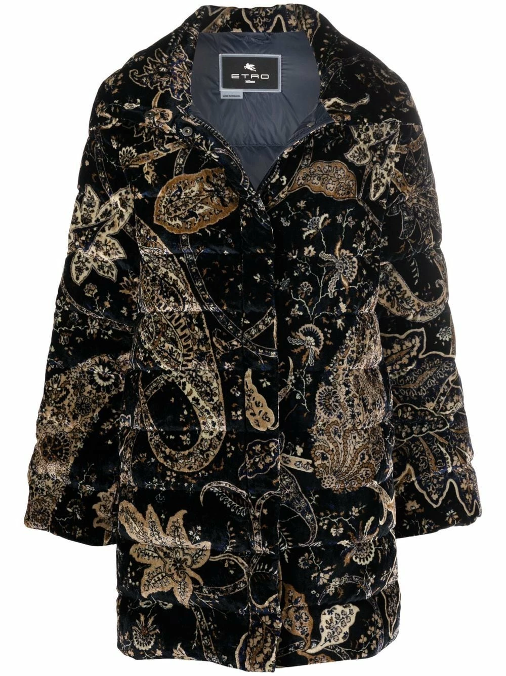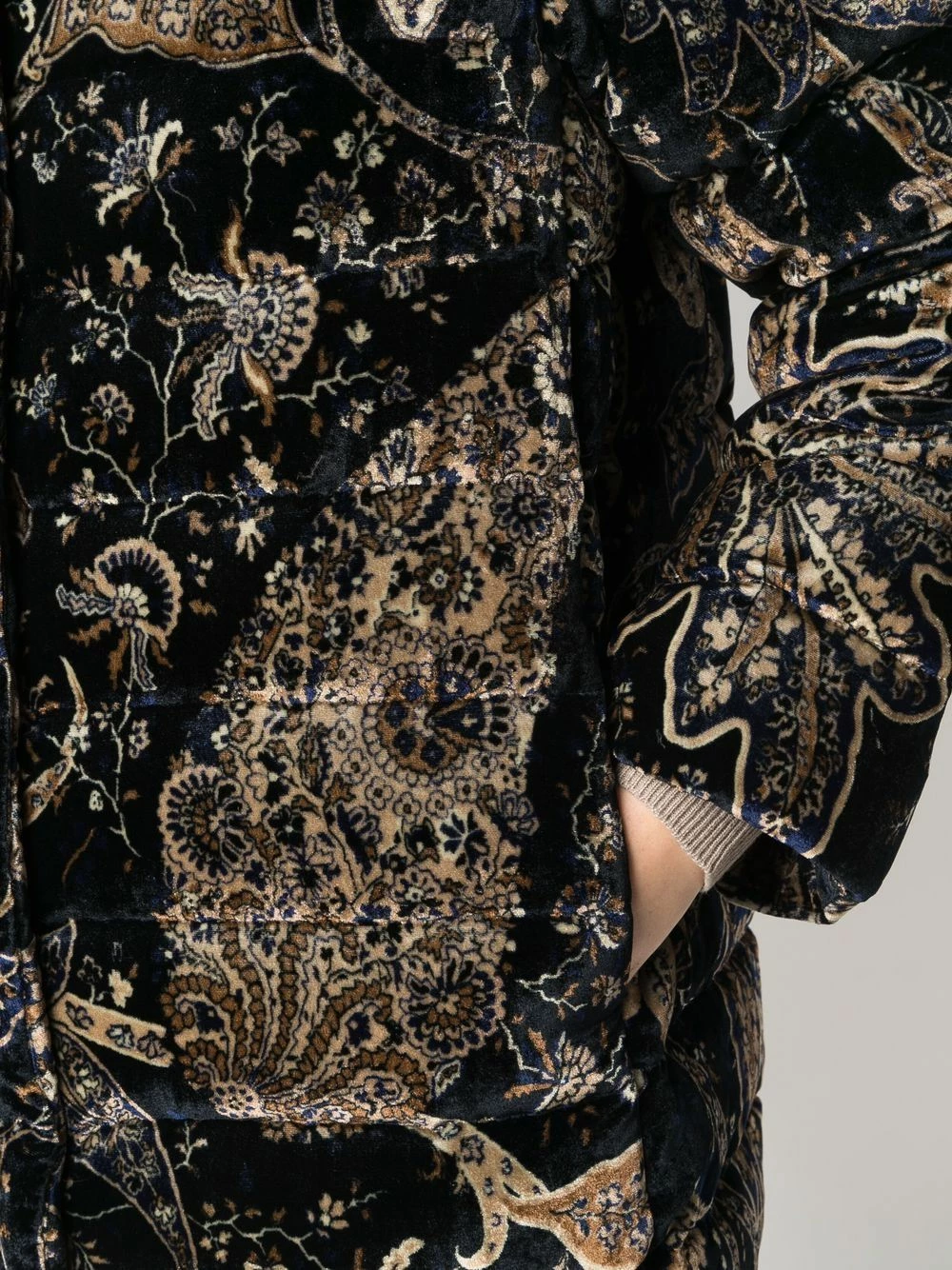 Effet velours, motif cachemire, design matelassé, garnissage en duvet, effet matelassé, fermeture zippée et boutons pression sur le devant, manches longues, deux poches latérales fendues, coupe mi-longue.