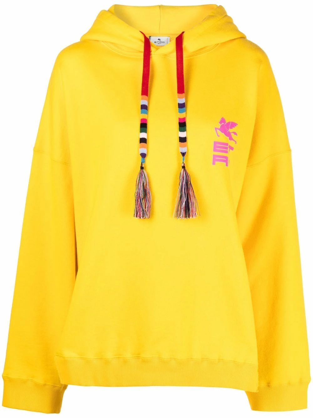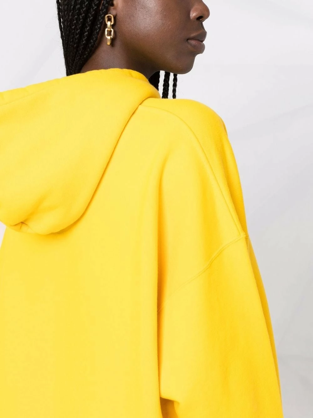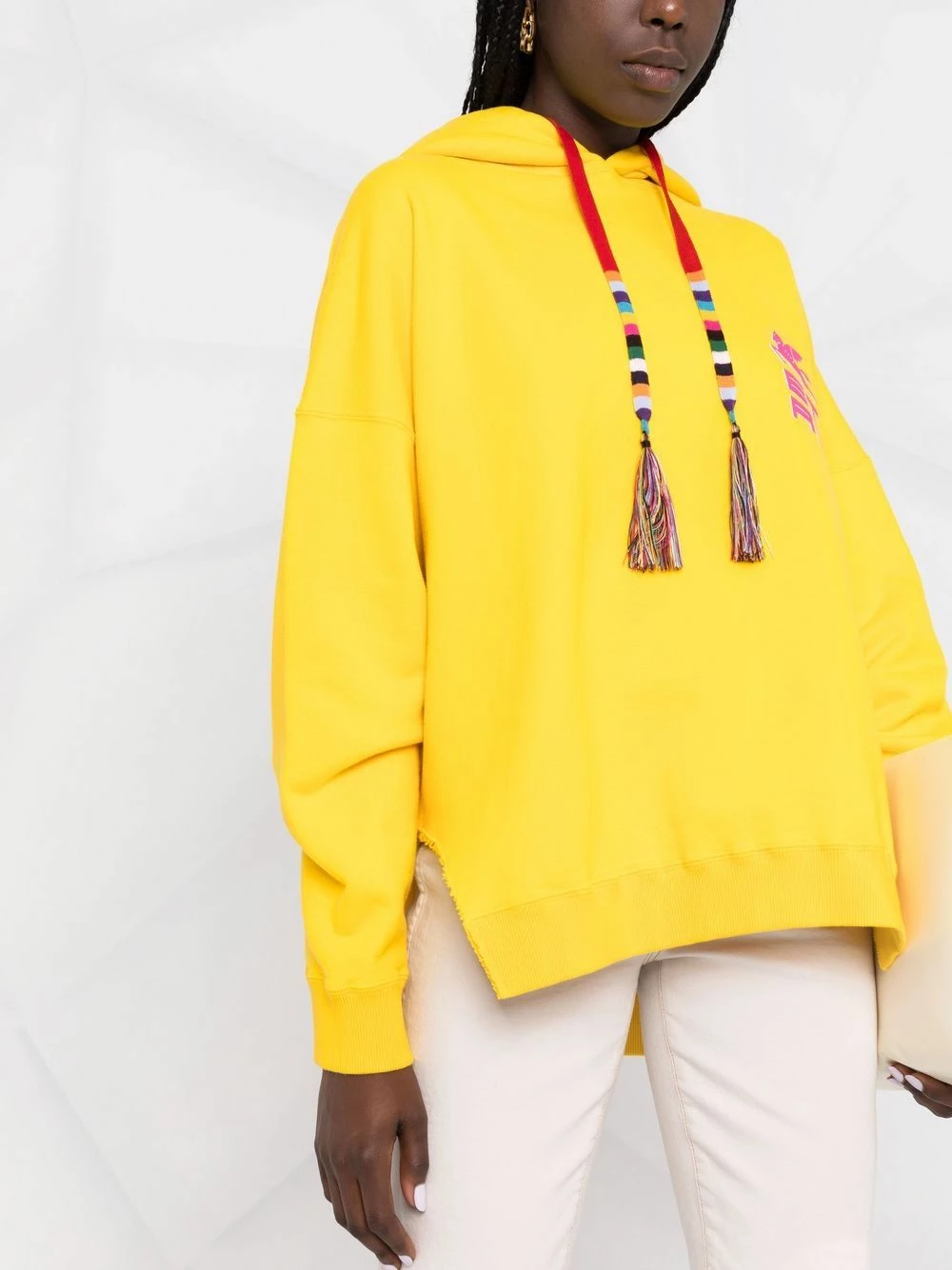 Logo imprimé à la poitrine, détail de pompon, capuche à lien de resserrage, effet d’épaules descendues, manches longues, fentes latérales. Couleur : jaune. Matière : coton.