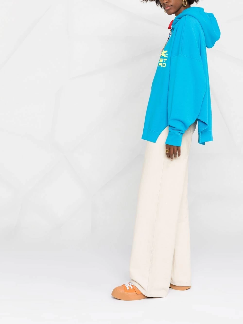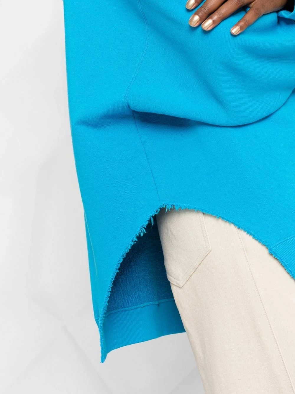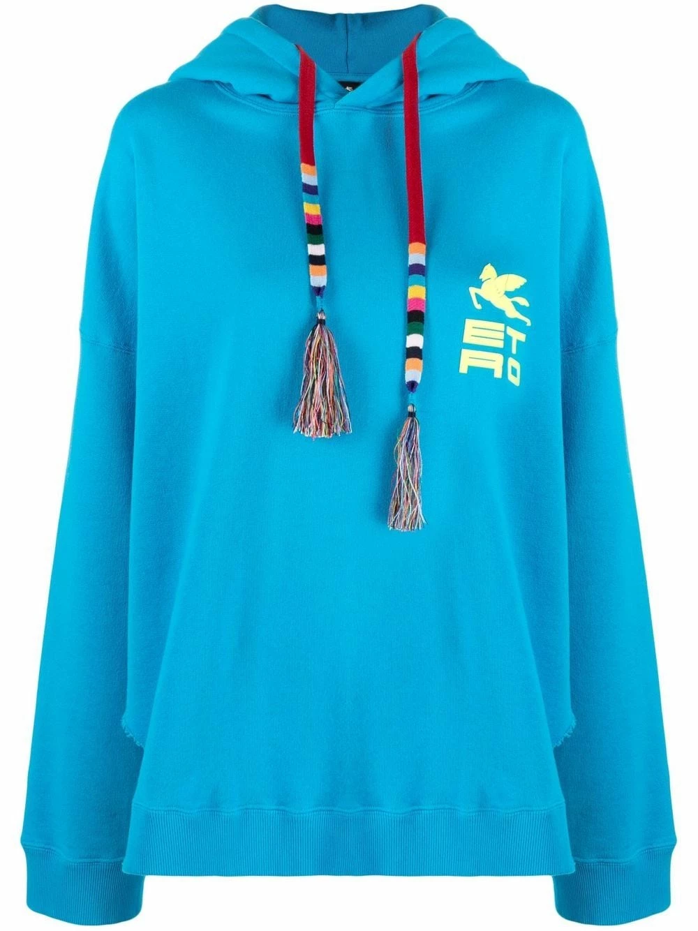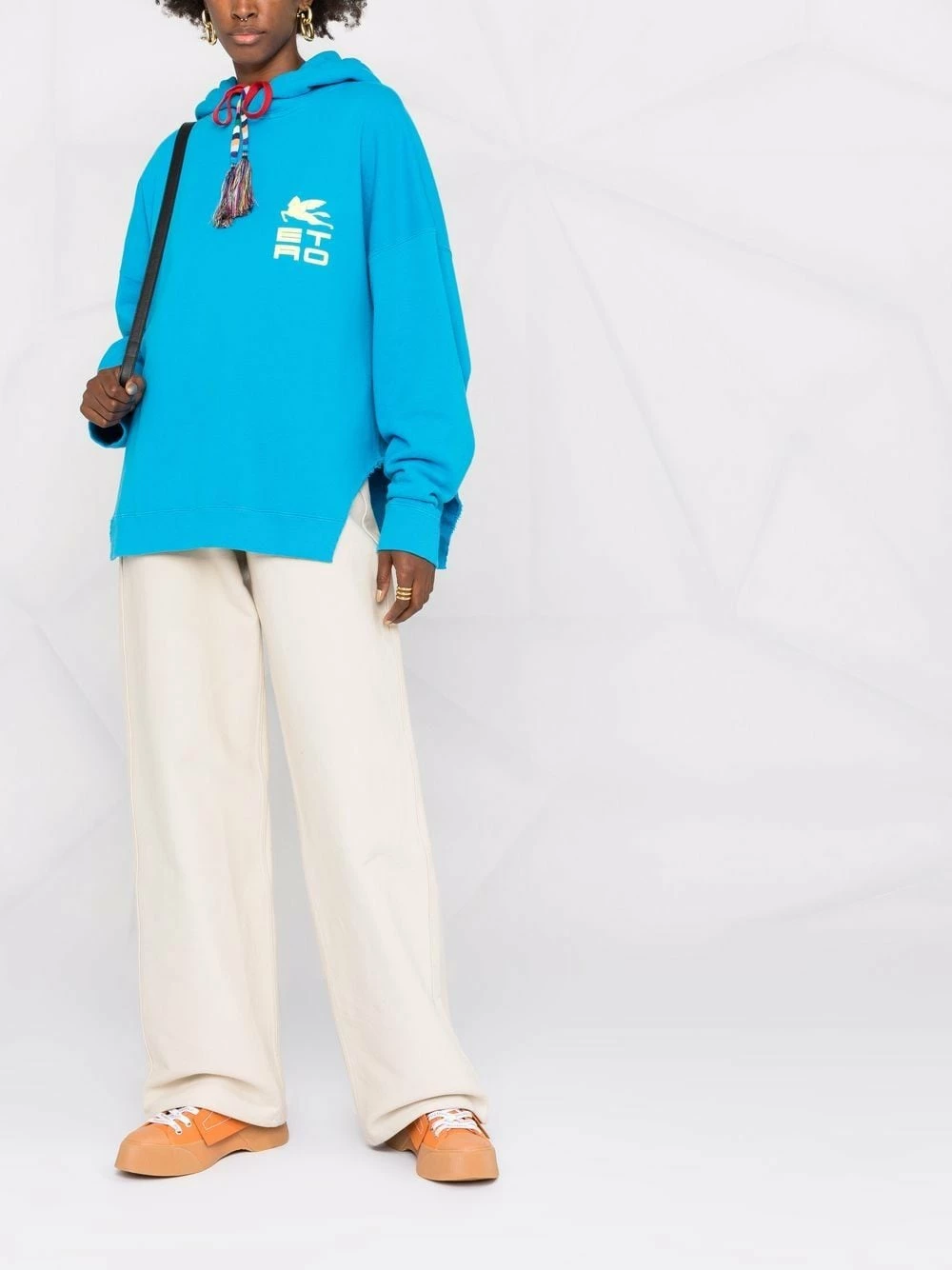 Détail nervuré, fentes latérales, logo imprimé à la poitrine, capuche classique, manches longues. Couleur : bleu. Matière : coton.