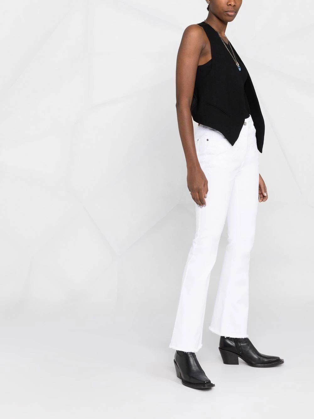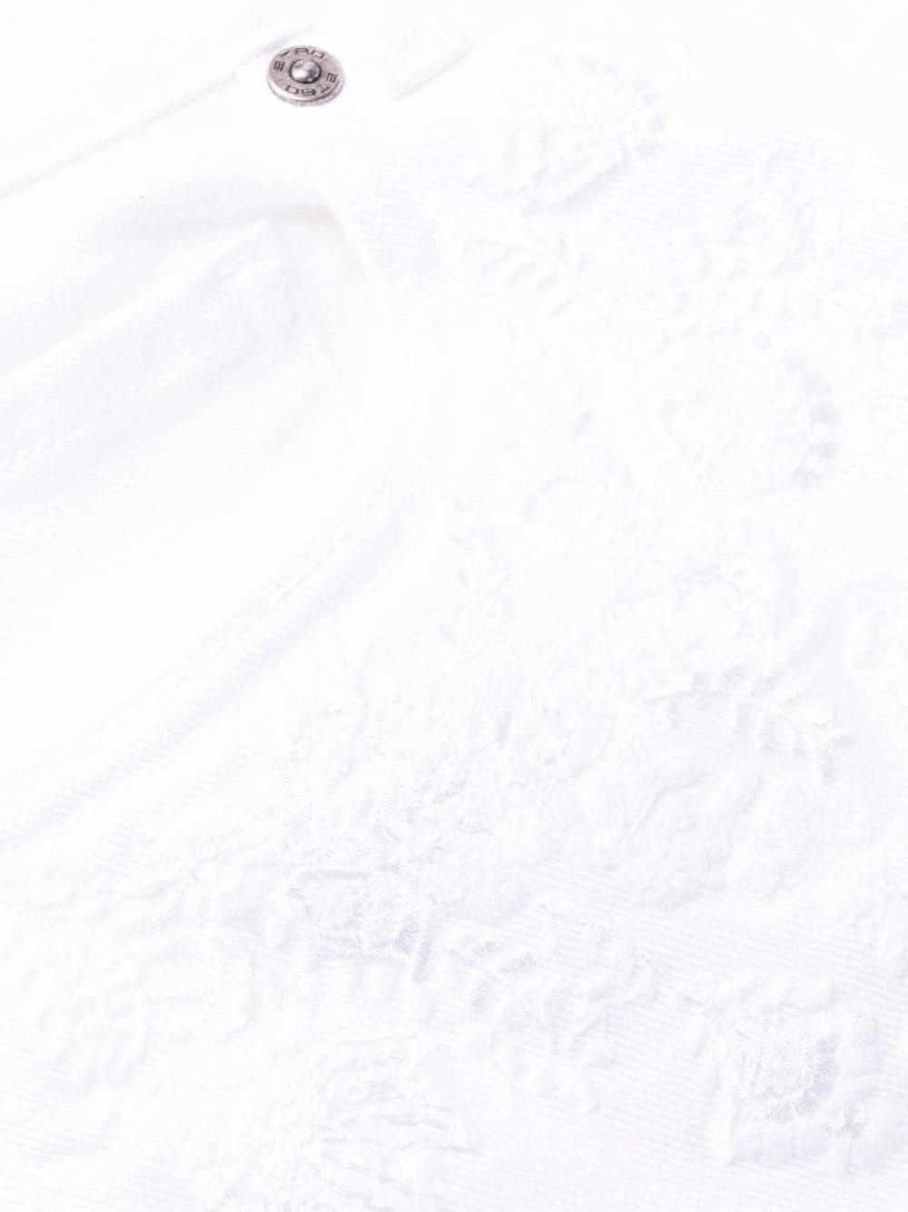 Fleur brodée, coutures ton sur ton, passants de ceinture, fermeture à zip et boutons sur le devant, coupe évasée, cinq poches classiques. Couleur : blanc.