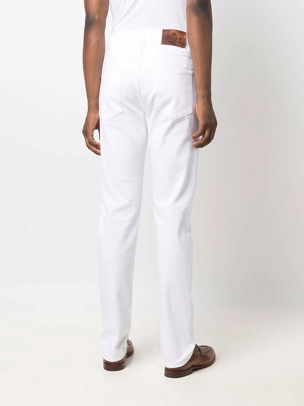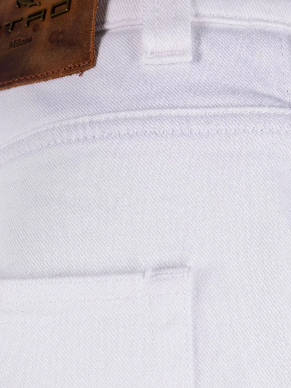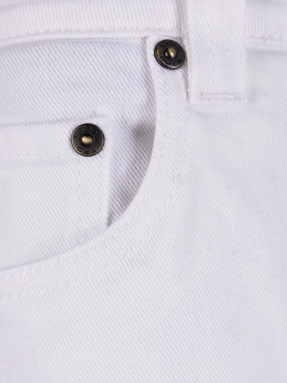 Finitions effilochées, passants de ceinture, fermeture à zip et boutons sur le devant, cinq poches classiques, coupe droite, construction stretch. Couleur : blanc.