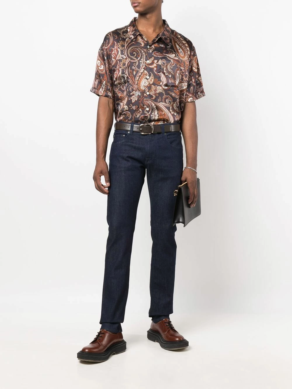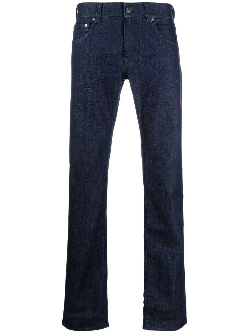Coupe slim, patch logo sur l’arrière, passants de ceinture, fermeture à zip et boutons sur le devant, cinq poches classiques.
