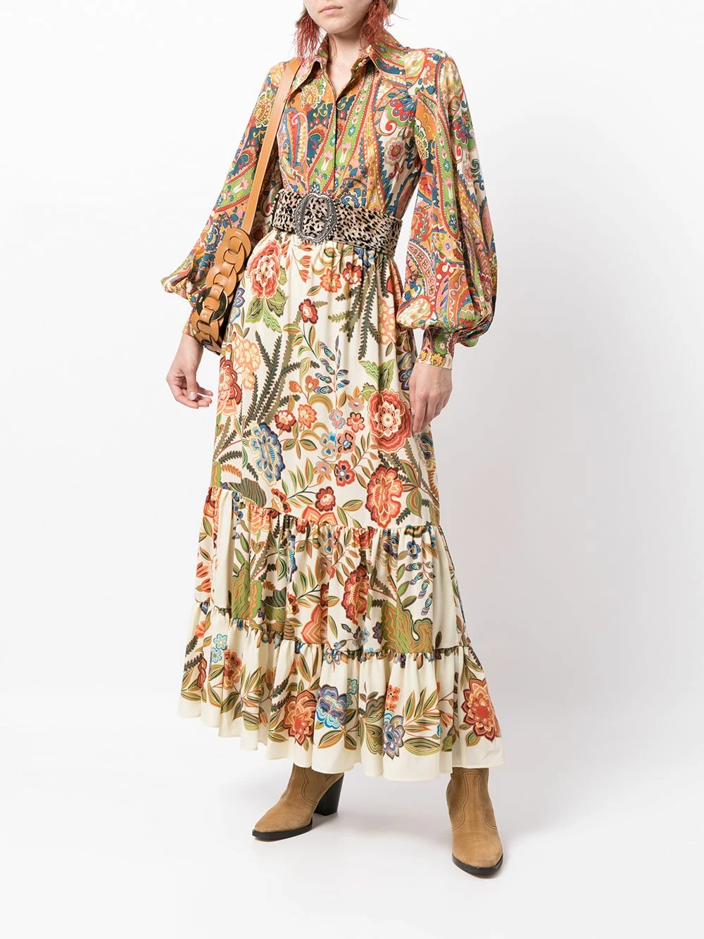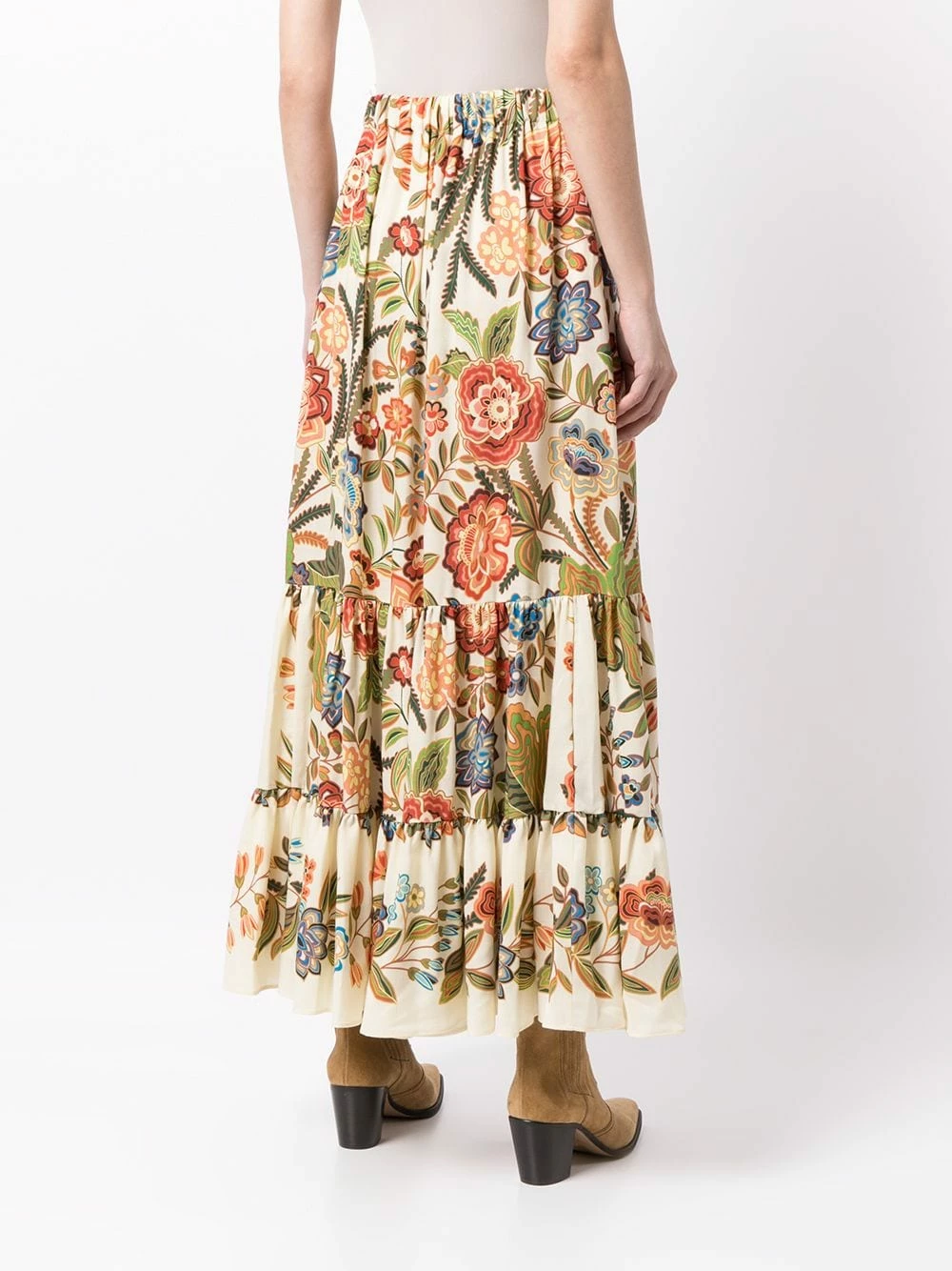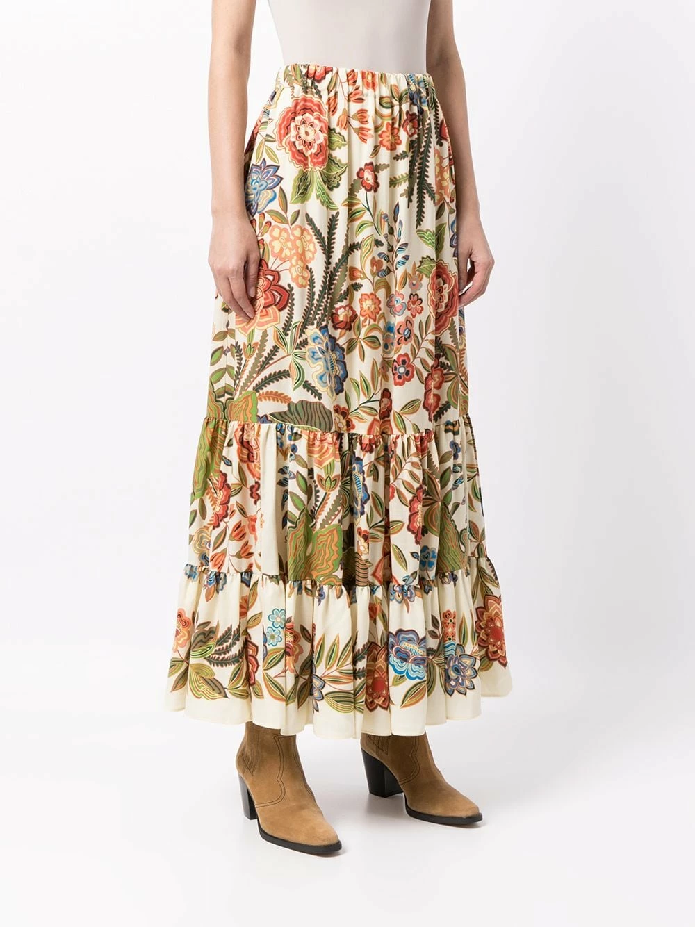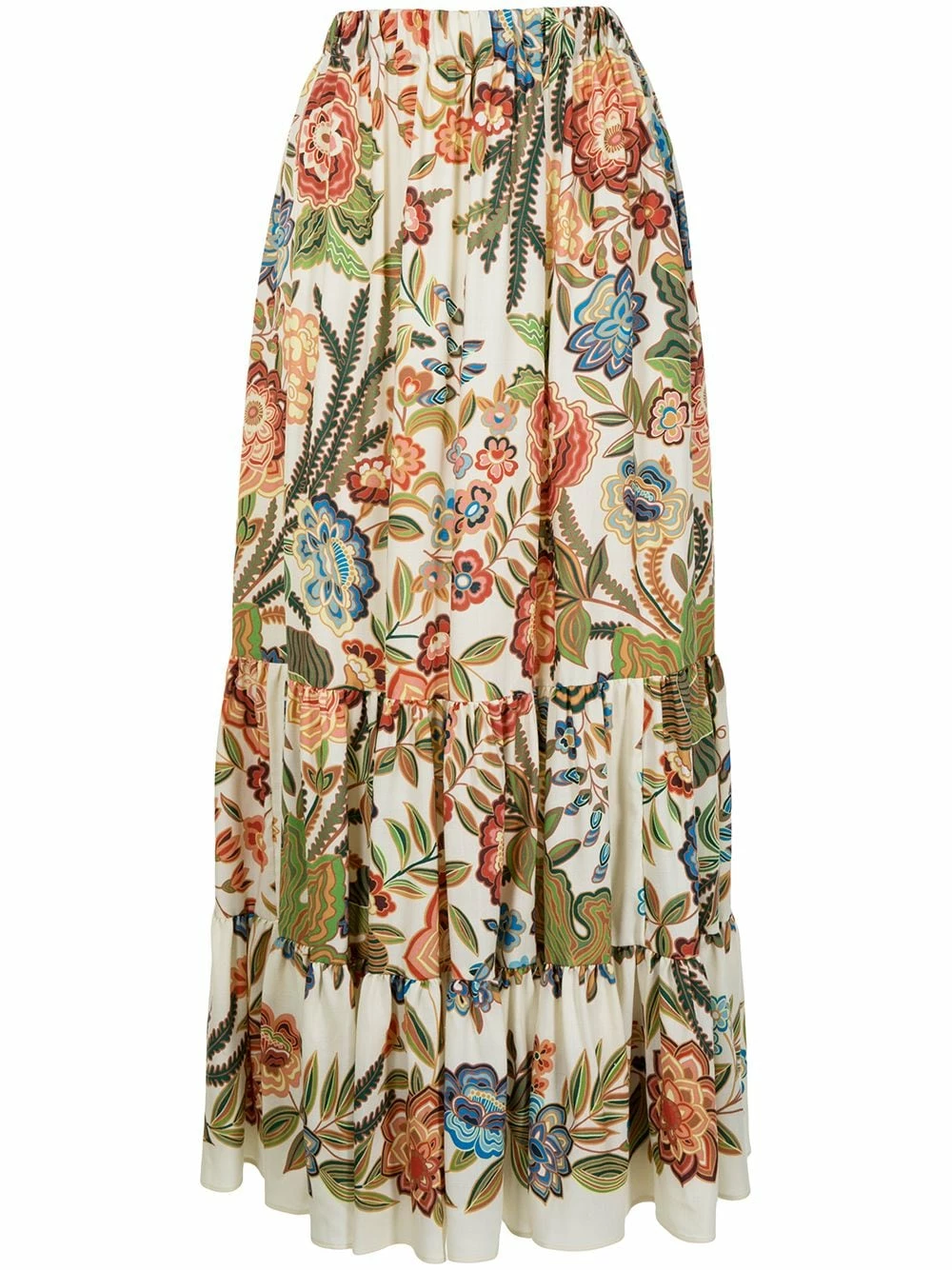 Motif de fleurs, taille haute, ceinture élastique, coupe longue.