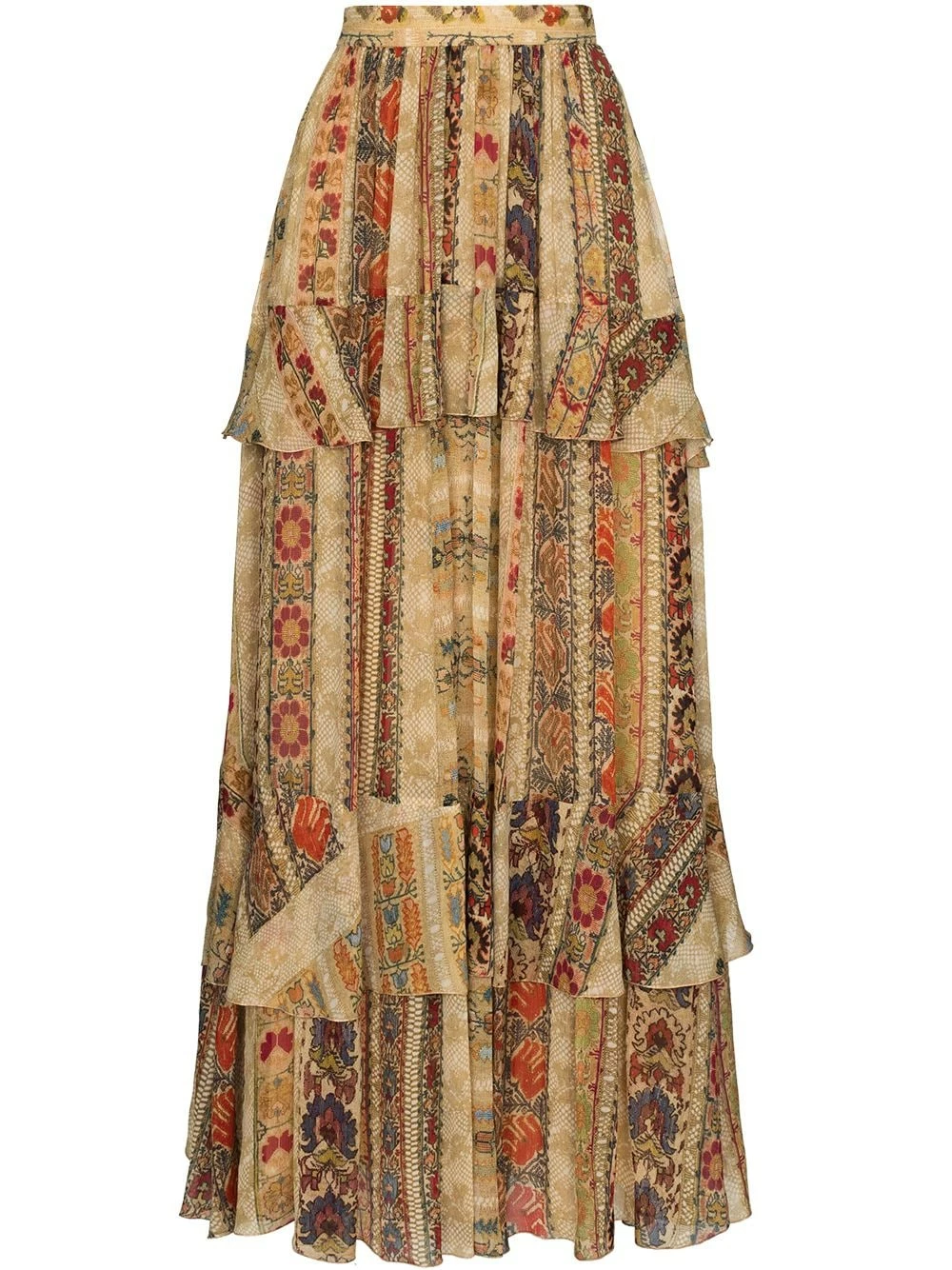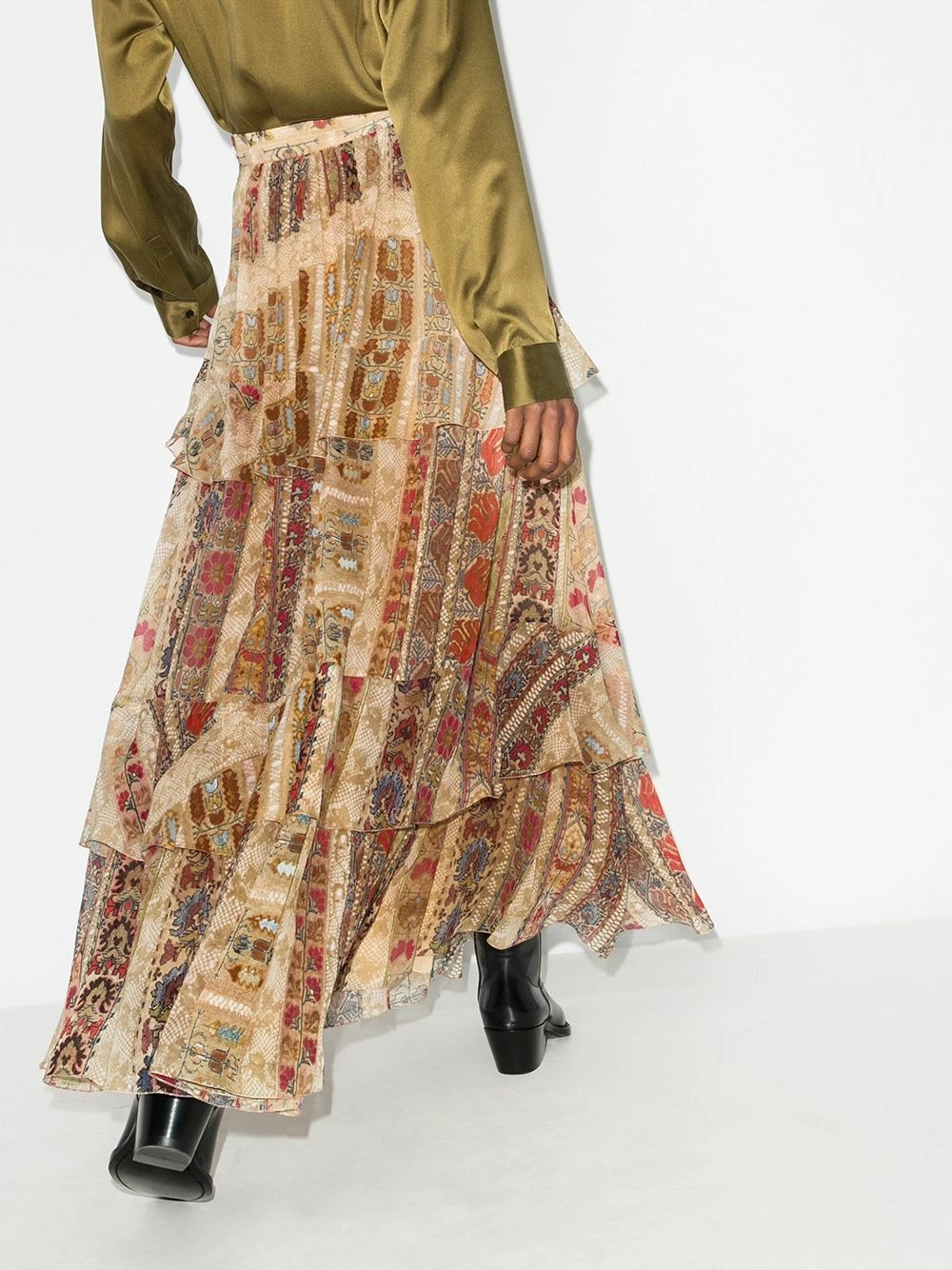 Taille haute, fermeture dissimulée sur le devant, design de volants superposés, détails de fronces. Couleur : marron. Matière : soie.