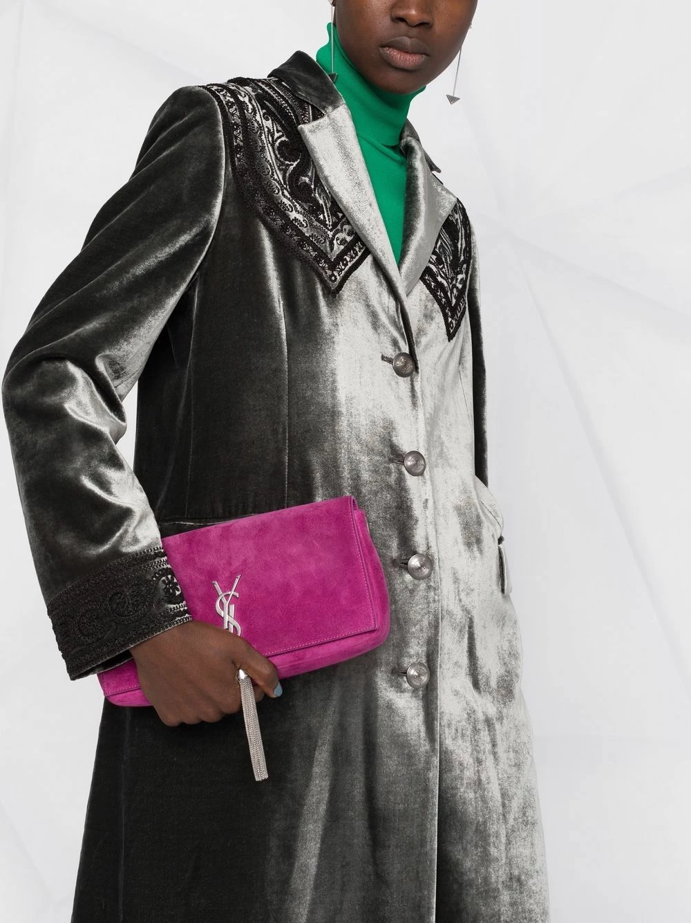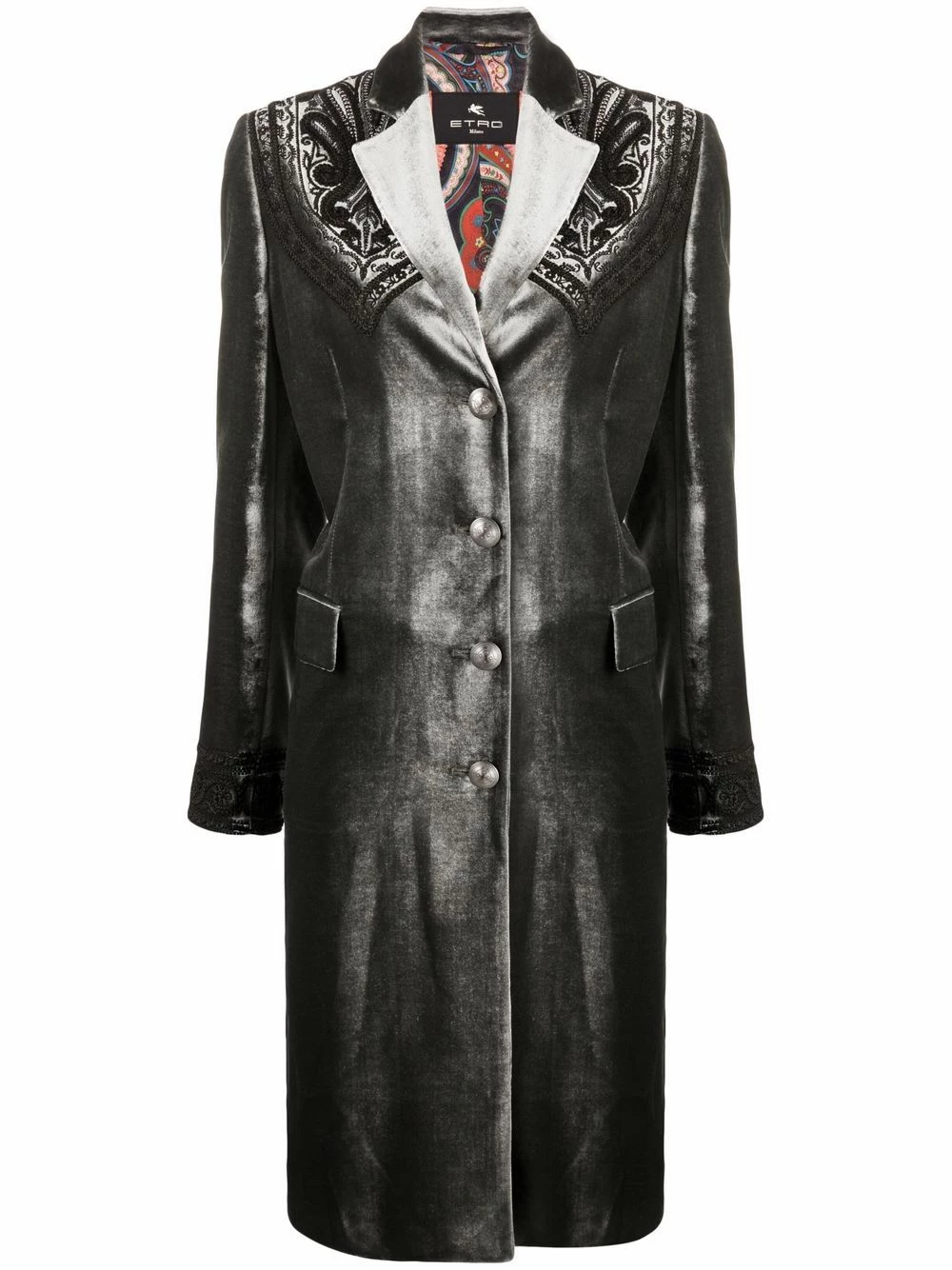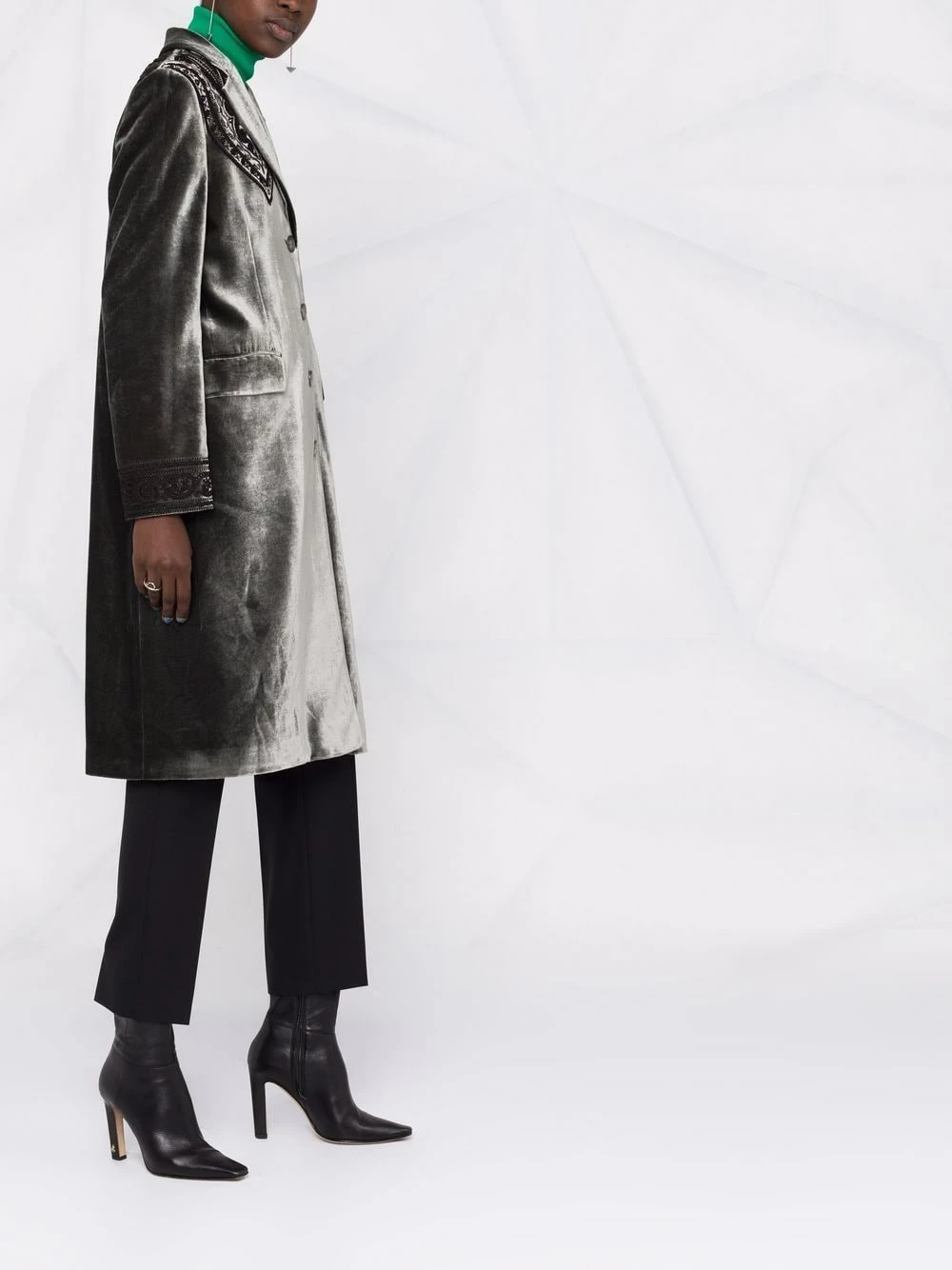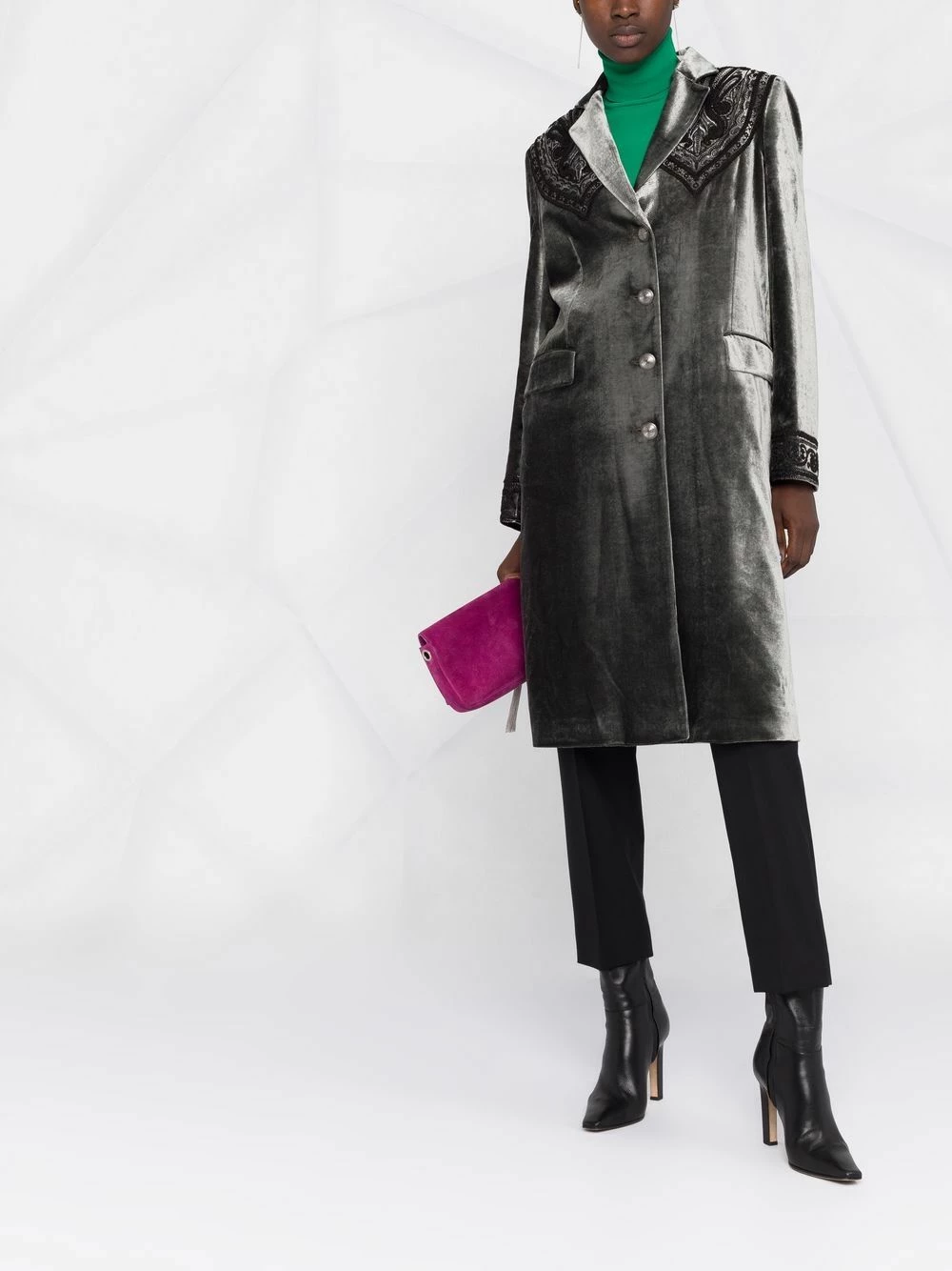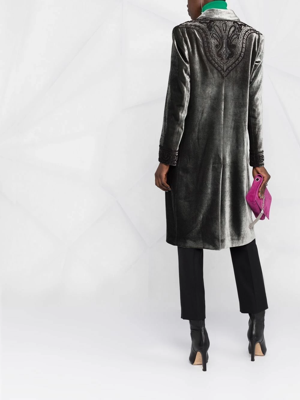 Broderies, boutonnière sur le devant, col cranté, manches longues, coupe longue, ourlet droit. Couleur : gris. Matière : coton.