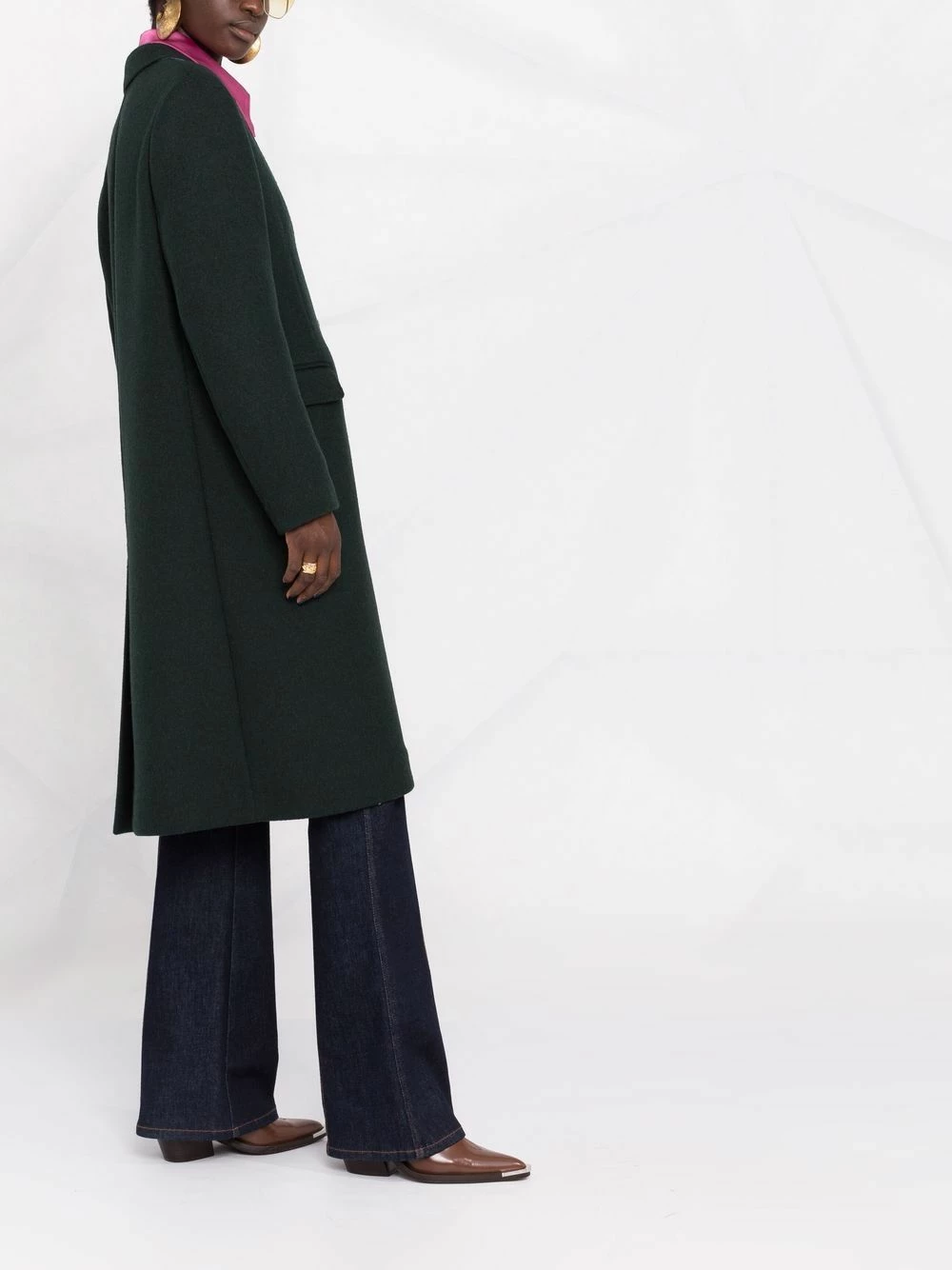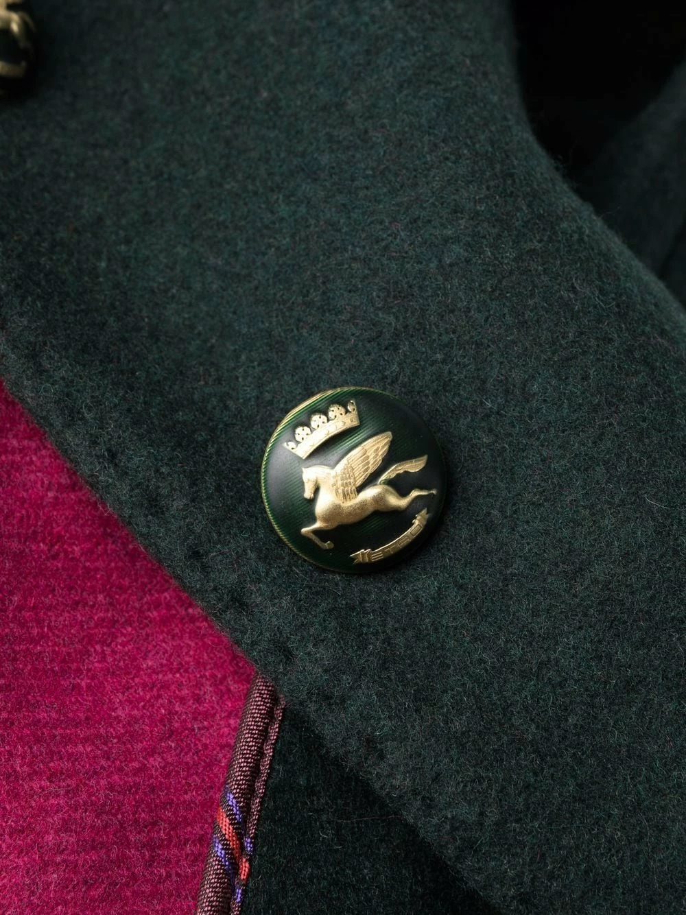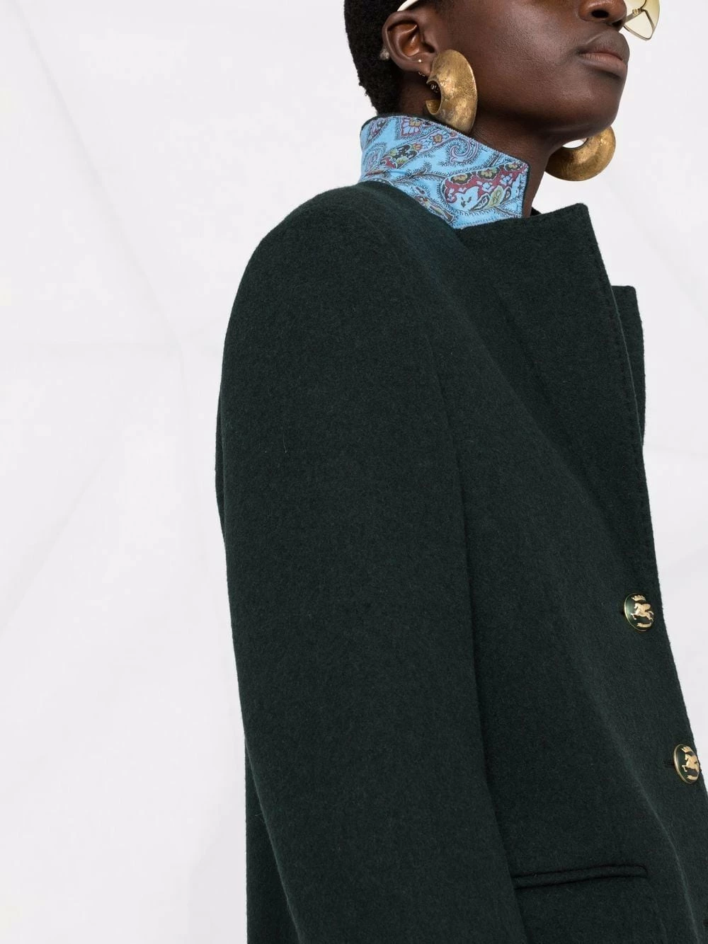 Revers crantés, manches longues, boutonnière sur le devant, pinces, deux poches à rabat sur le devant. Couleur : vert. Matière : laine.
