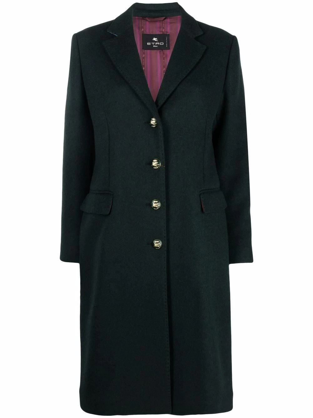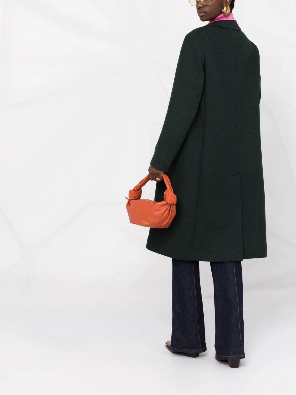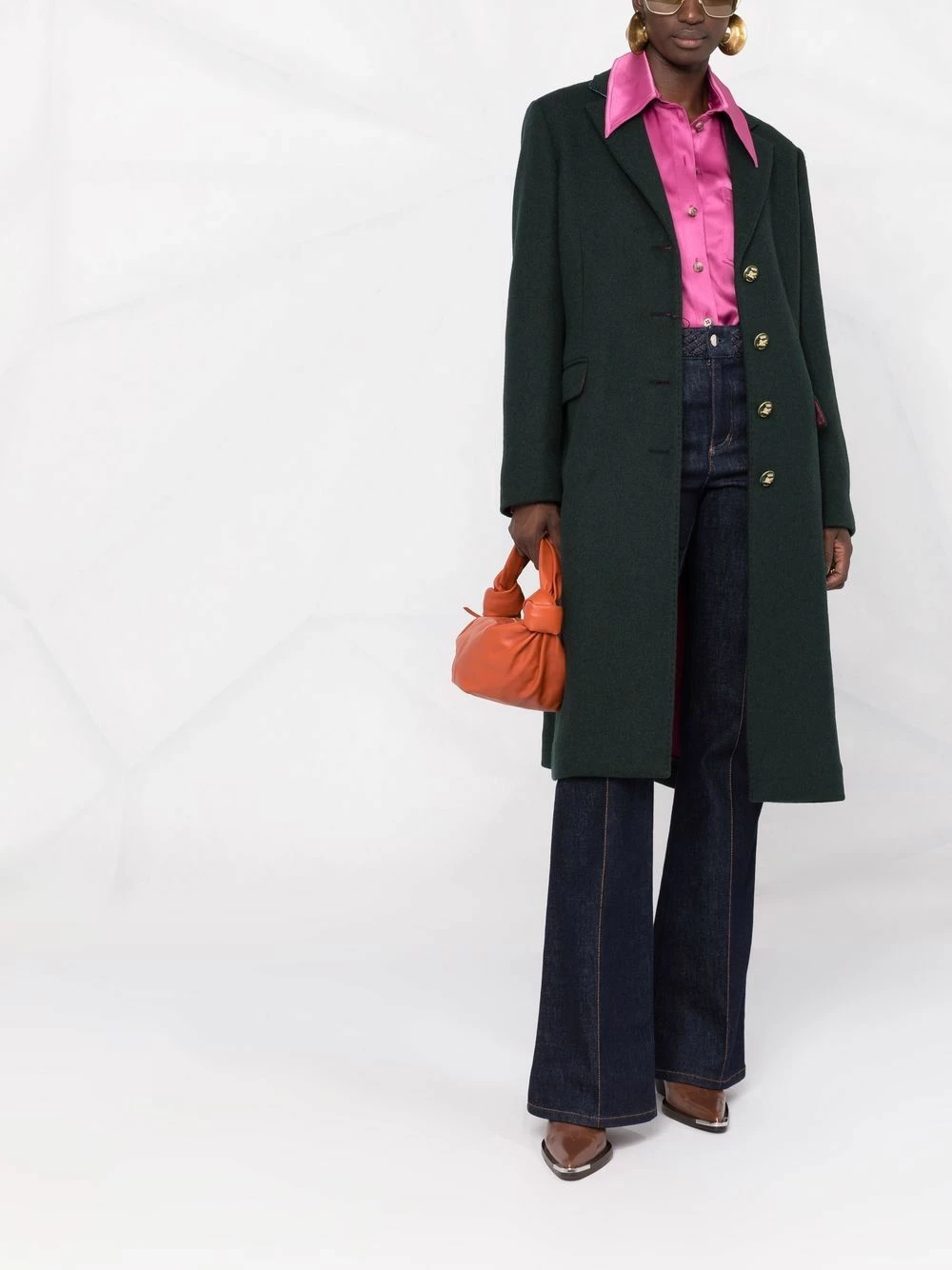 Revers crantés, manches longues, boutonnière sur le devant, pinces, deux poches à rabat sur le devant. Couleur : vert. Matière : laine.