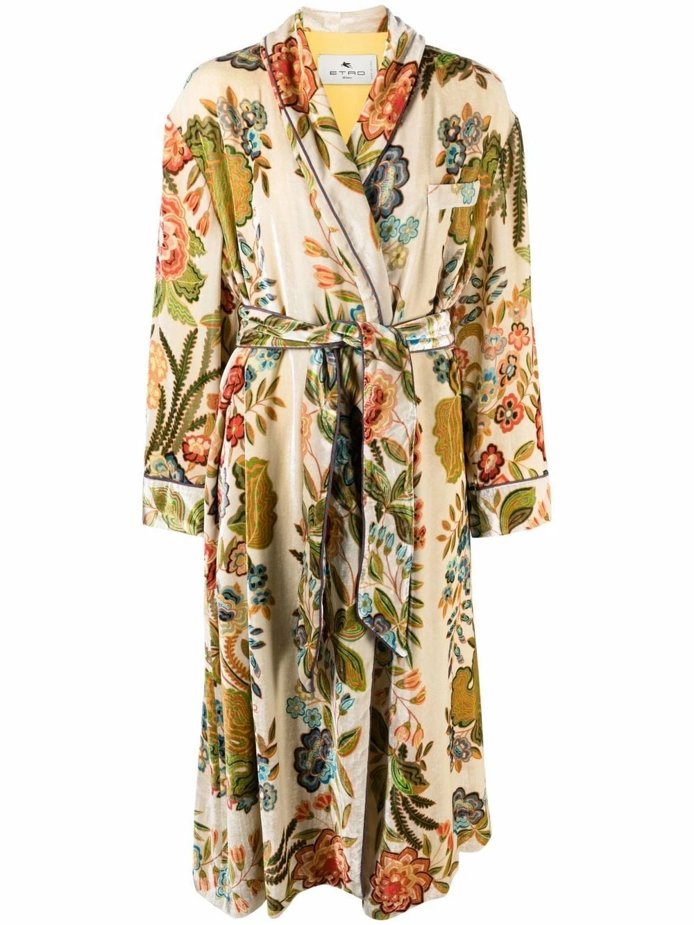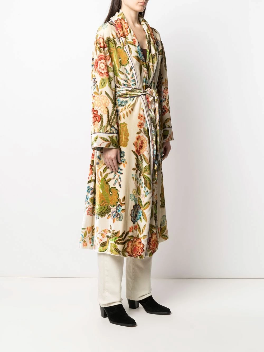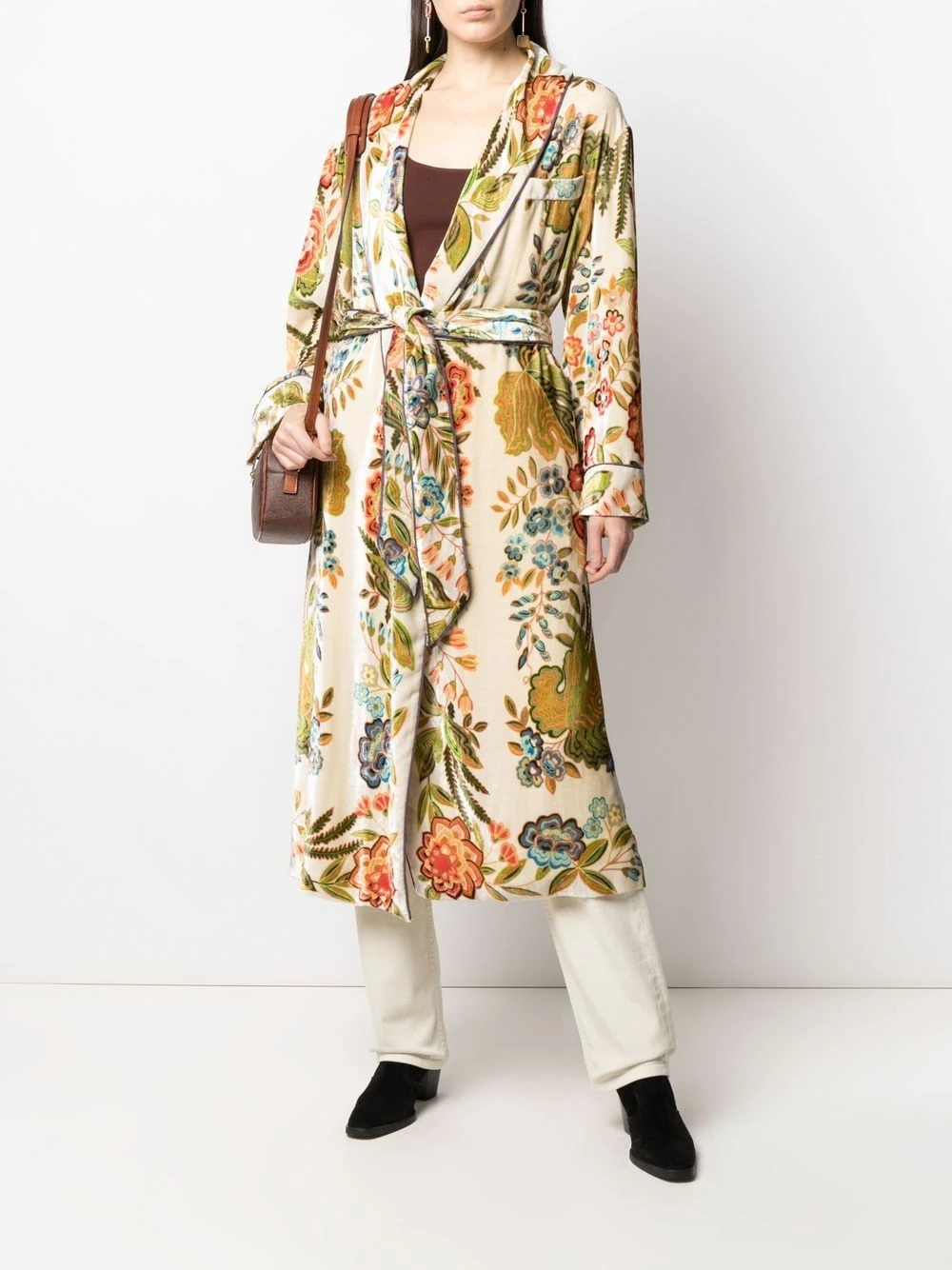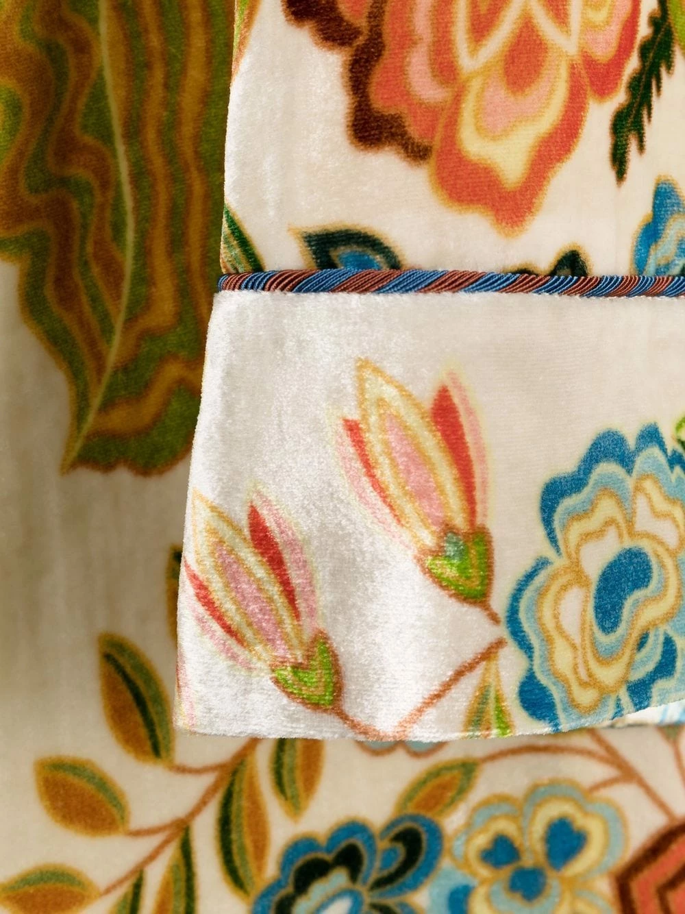 Effet velours, imprimé végétal, finitions passepoilées, col châle, manches longues, taille ceinturée, coupe mi-longue.