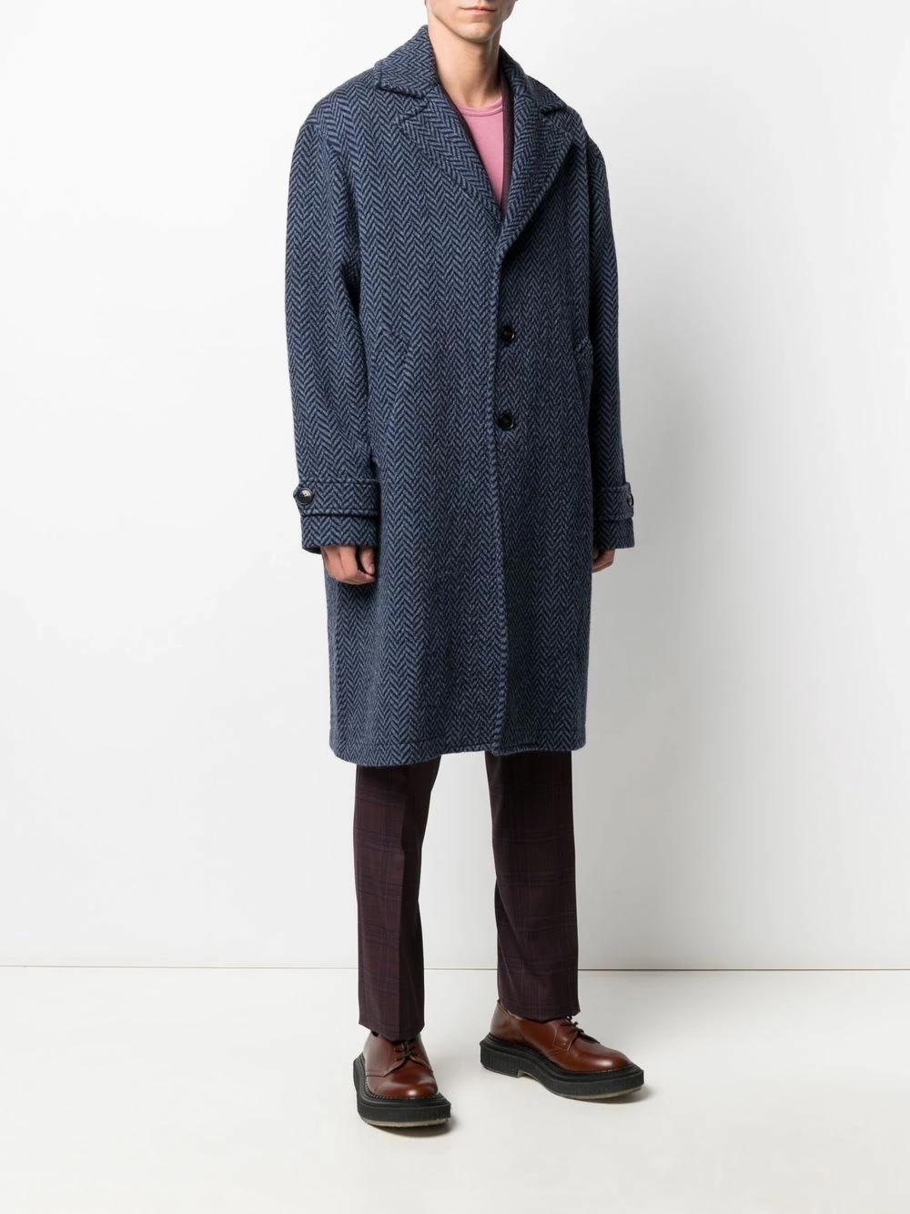 Maille à chevrons, larges revers pointus, boutonnière sur le devant, manches longues, poignets boutonnés, poches latérales fendues, détail de fente. Couleur : bleu. Matière : laine.