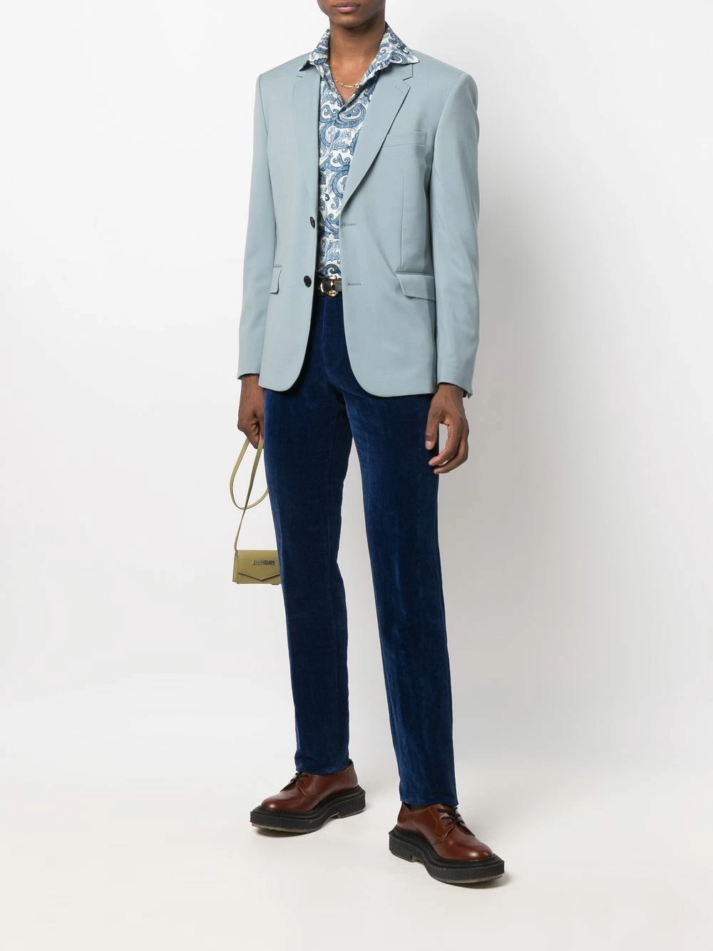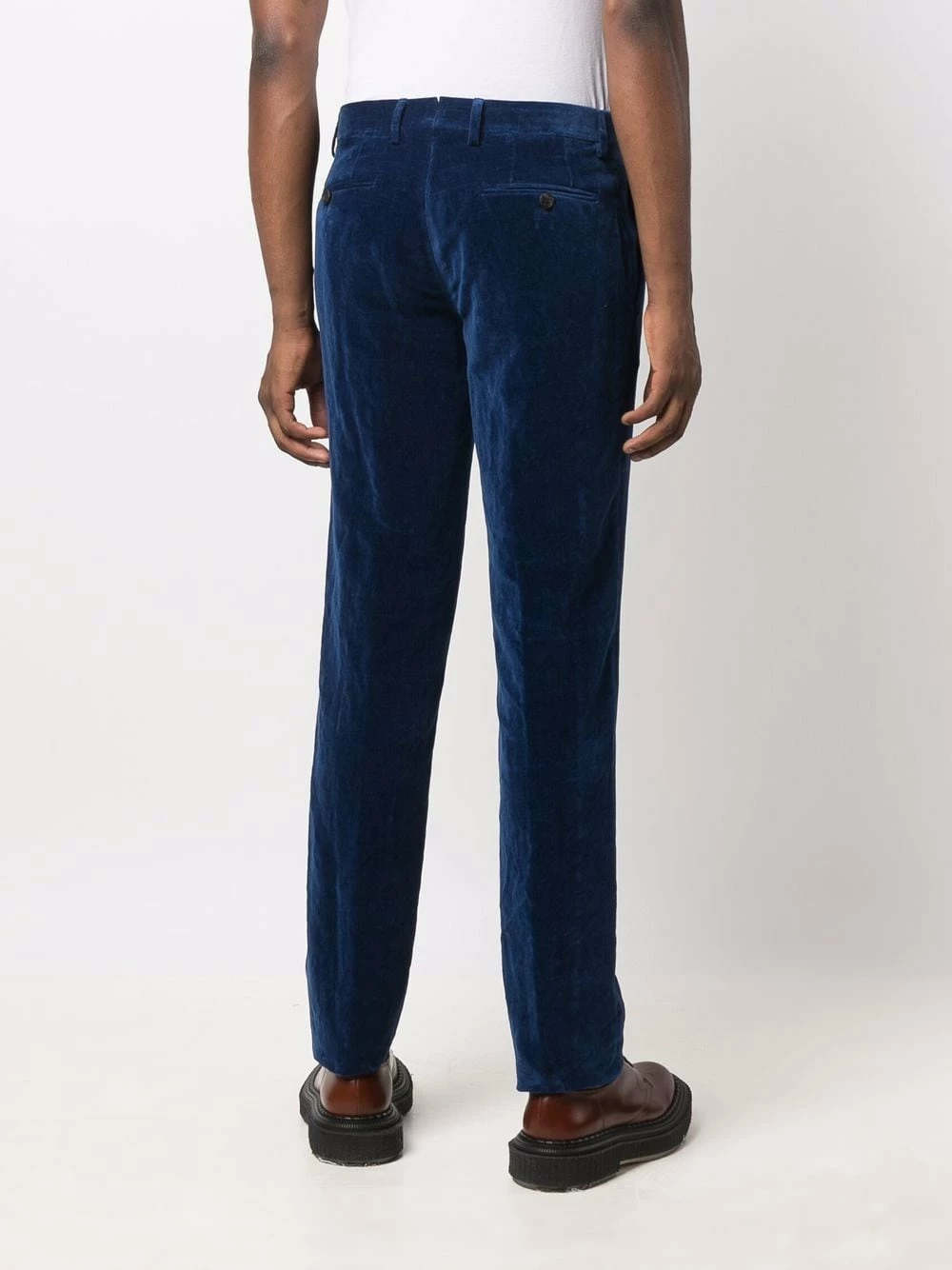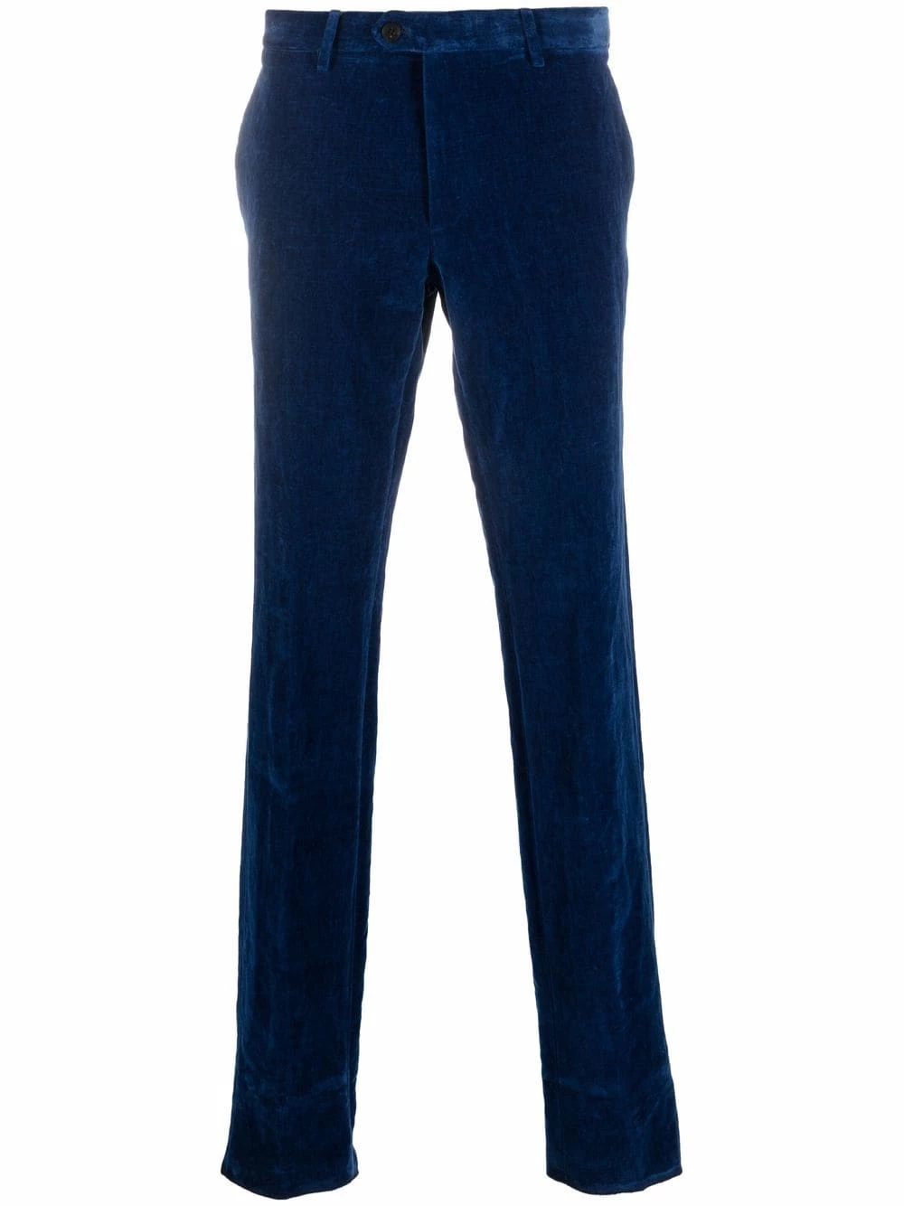 Taille basse, passants de ceinture, fermeture à zip et boutons sur le devant, poches latérales fendues, poches arrière passepoilées, coupe slim, hauteur cheville.