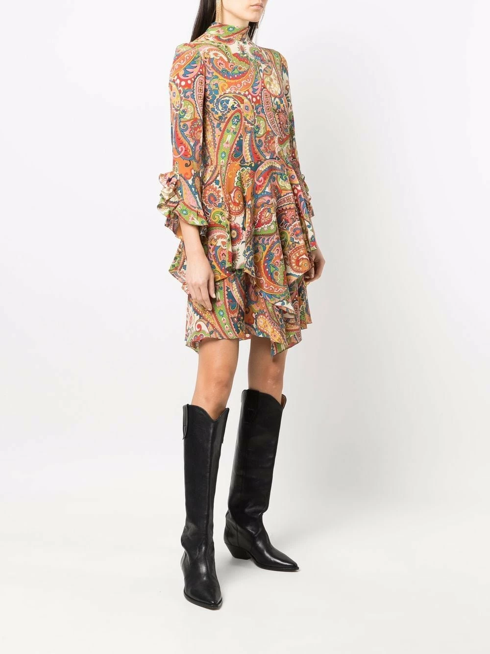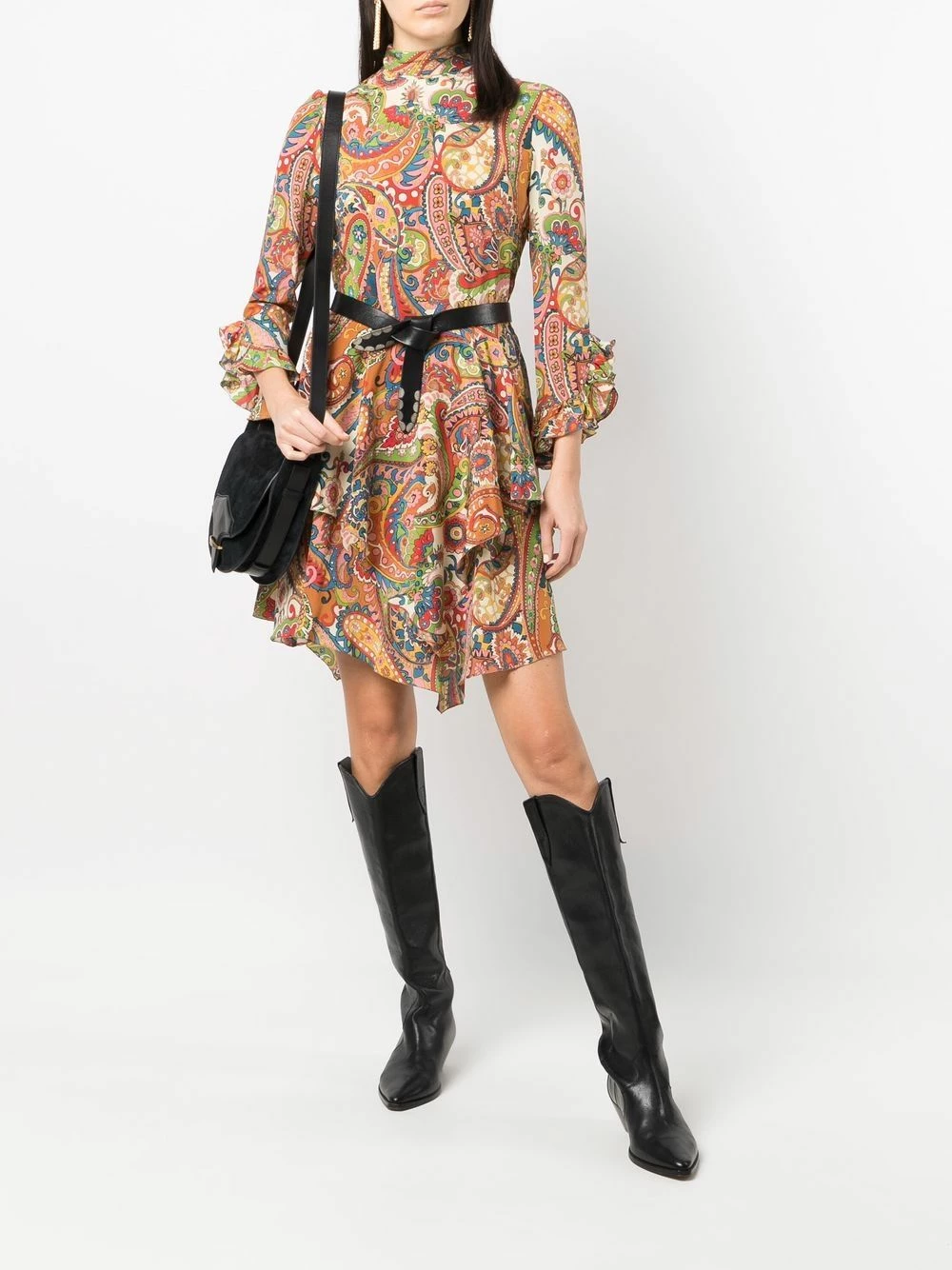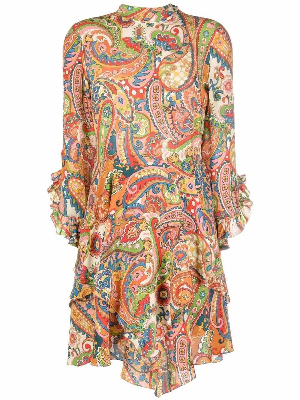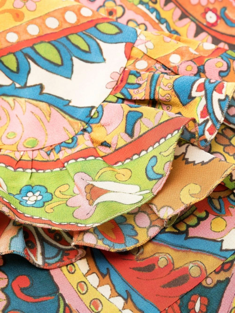 Motif imprimé, détails de volants, col montant, manches trois-quarts, fermeture nouée au dos. Couleur : multicolore. Matière : soie.