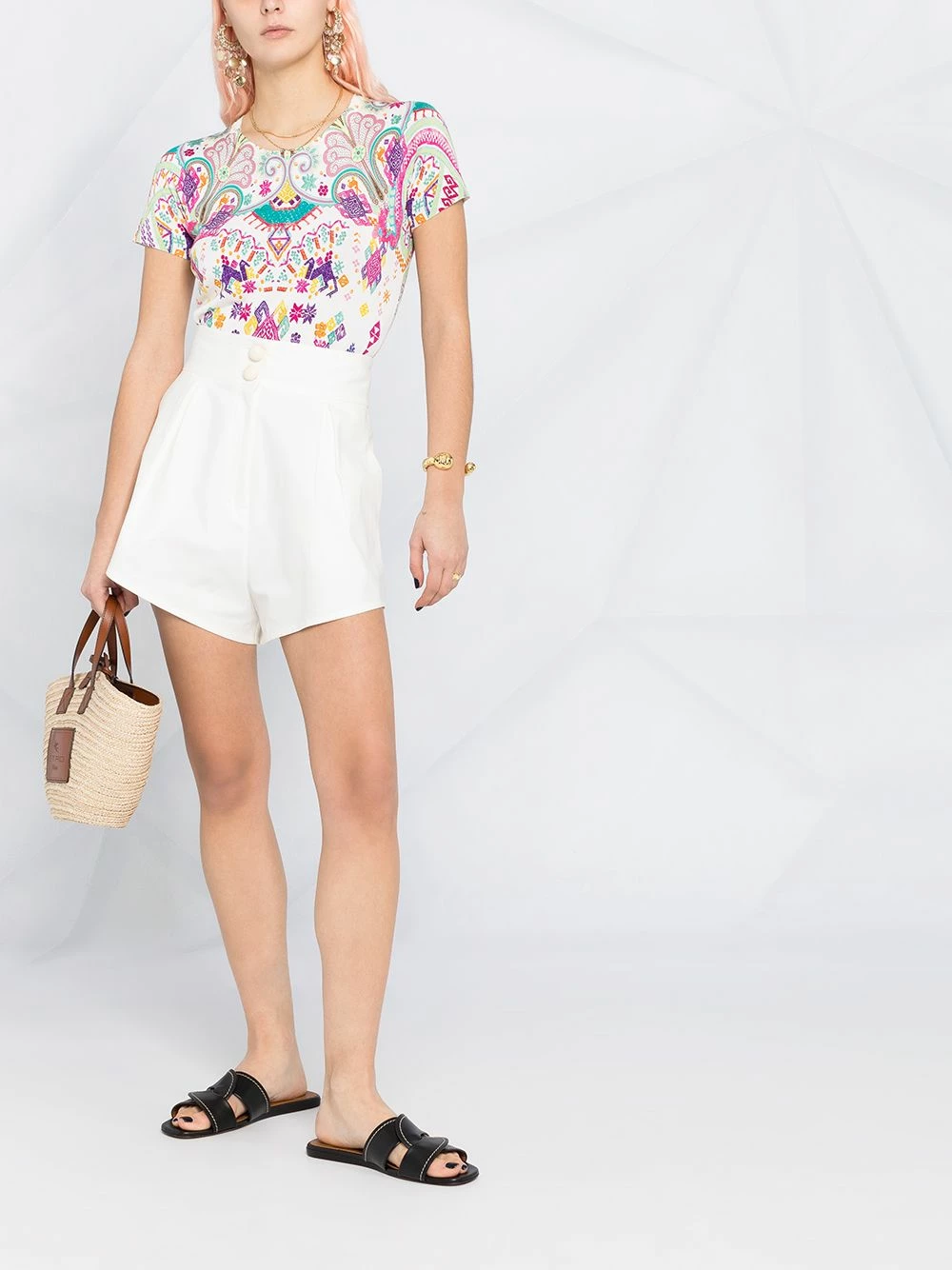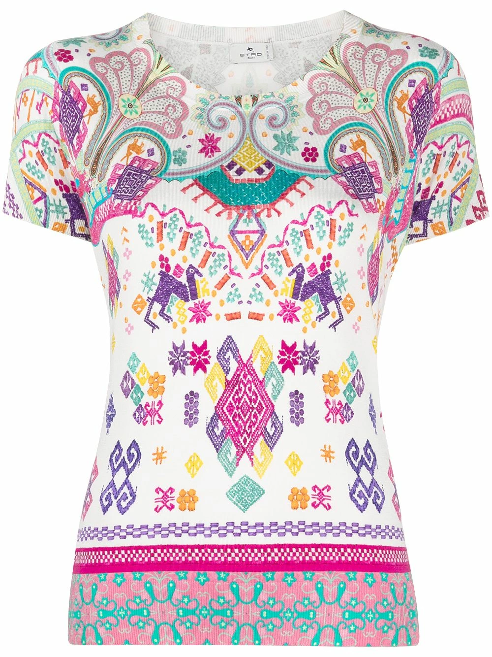 Design tricoté, imprimé abstrait, encolure ronde, manches courtes, ourlet droit.