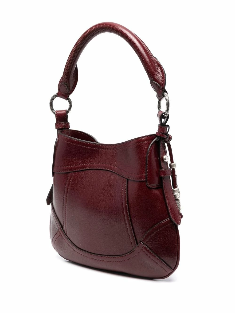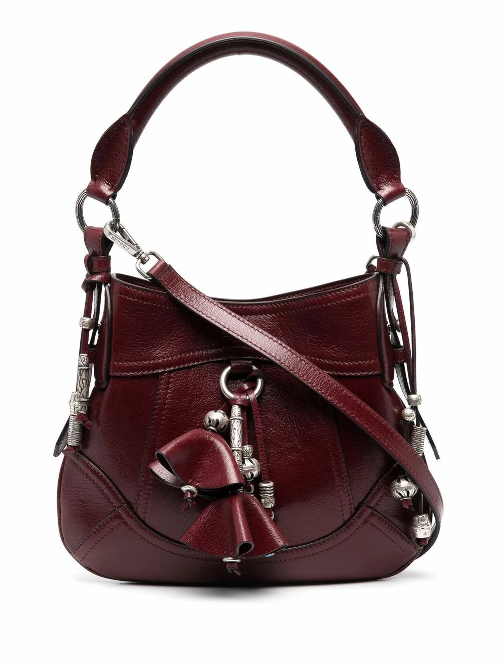 Design à empiècements, détail de pompon, fermeture à boutons pression, ornements argentés, anse classique, bride porté épaule détachable. Couleur : marron.
