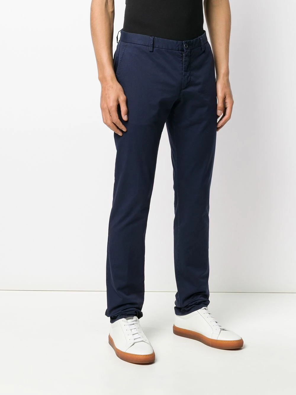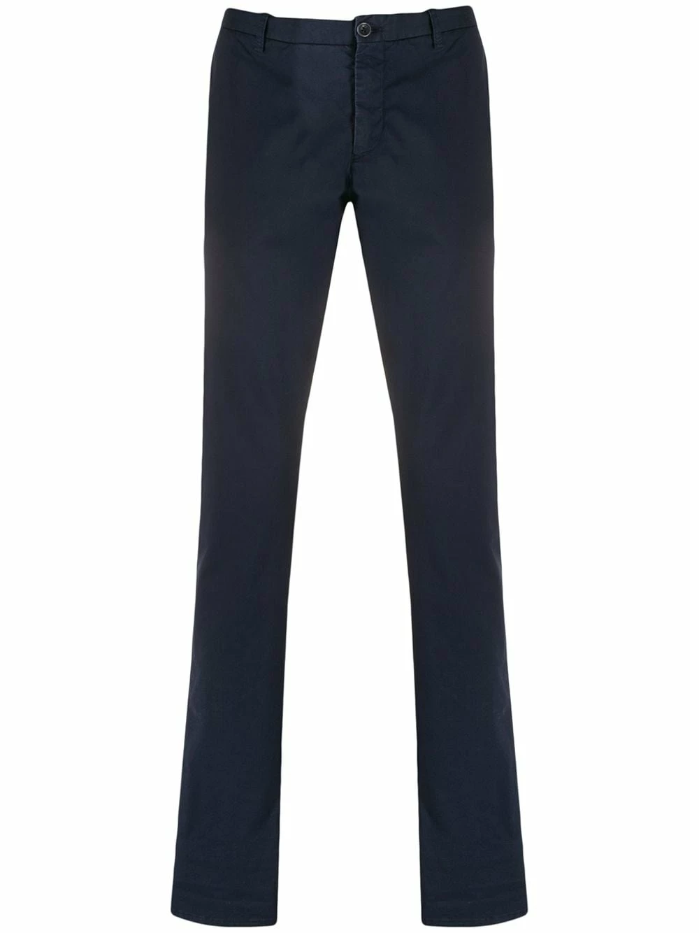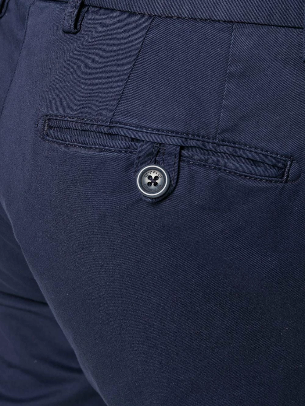 Pantalon chino droit en coton stretch Etro avec bouton et zip, passants de ceinture à la taille, poches latérales, poches arrière et longueur classique. Couleur: bleu foncé.