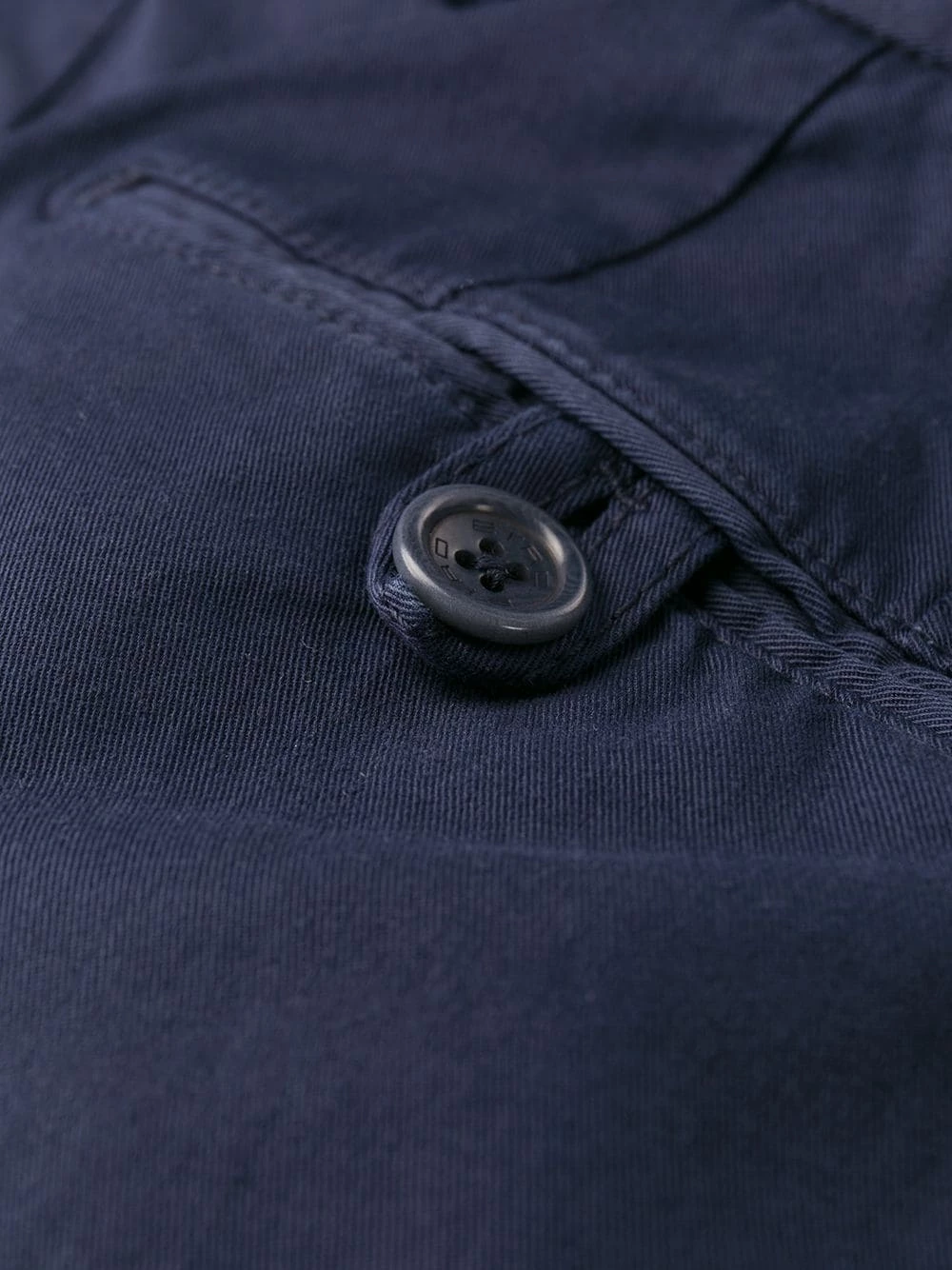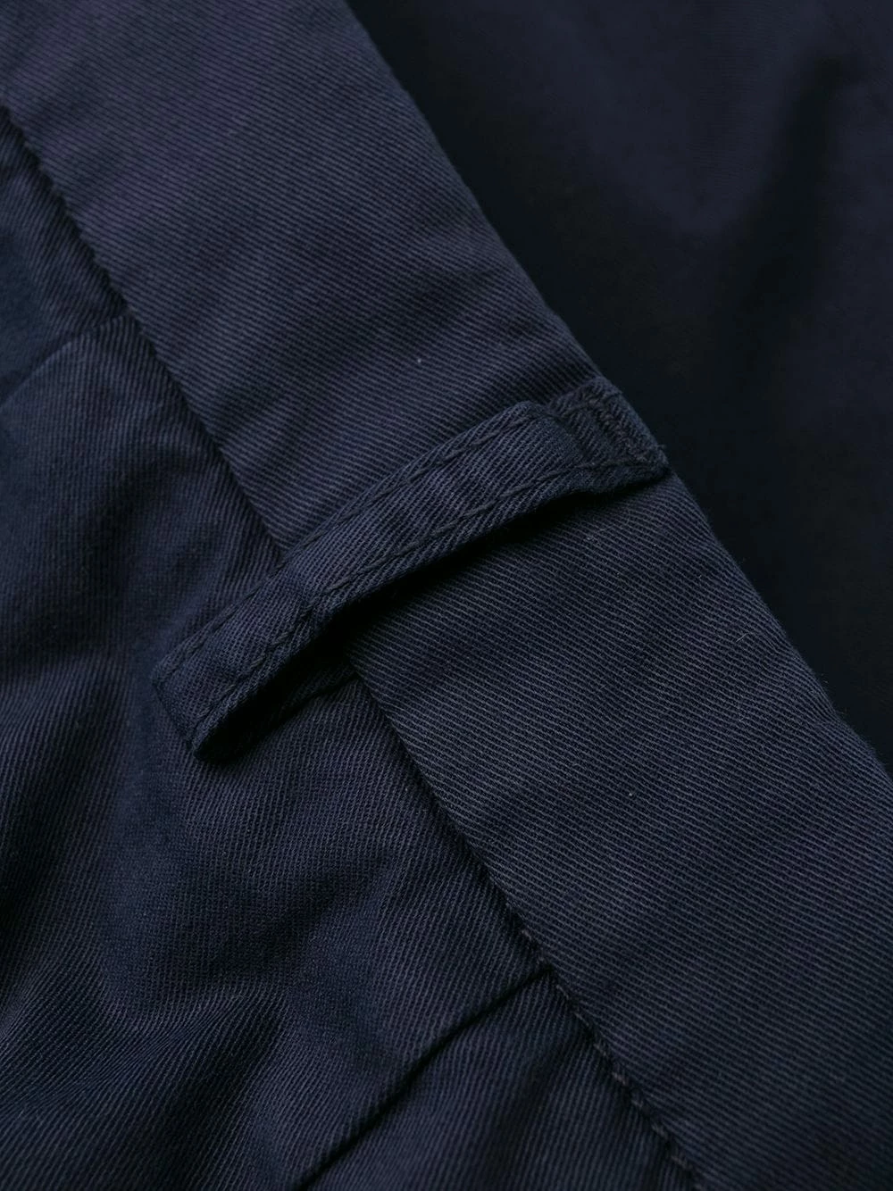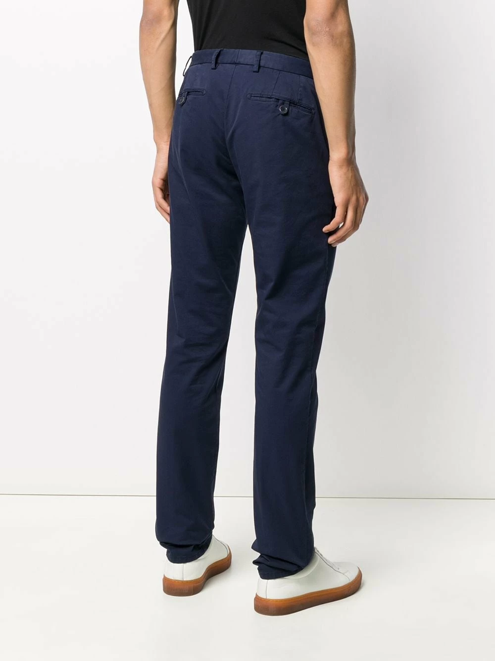 Pantalon chino droit en coton stretch Etro avec bouton et zip, passants de ceinture à la taille, poches latérales, poches arrière et longueur classique. Couleur: bleu foncé.