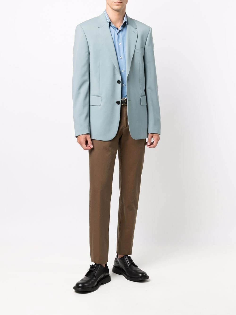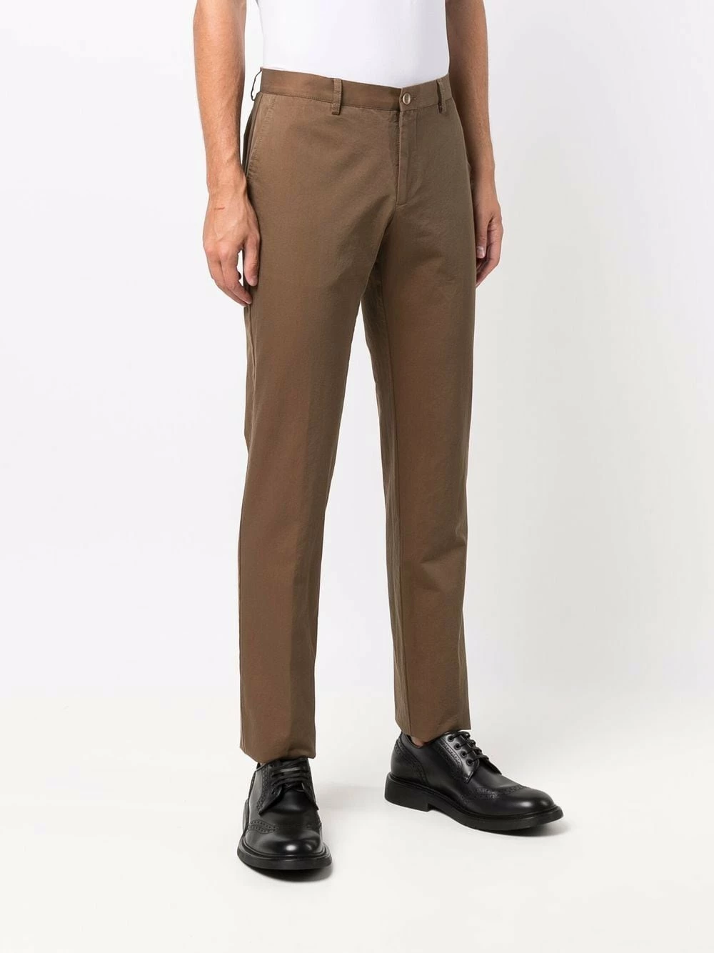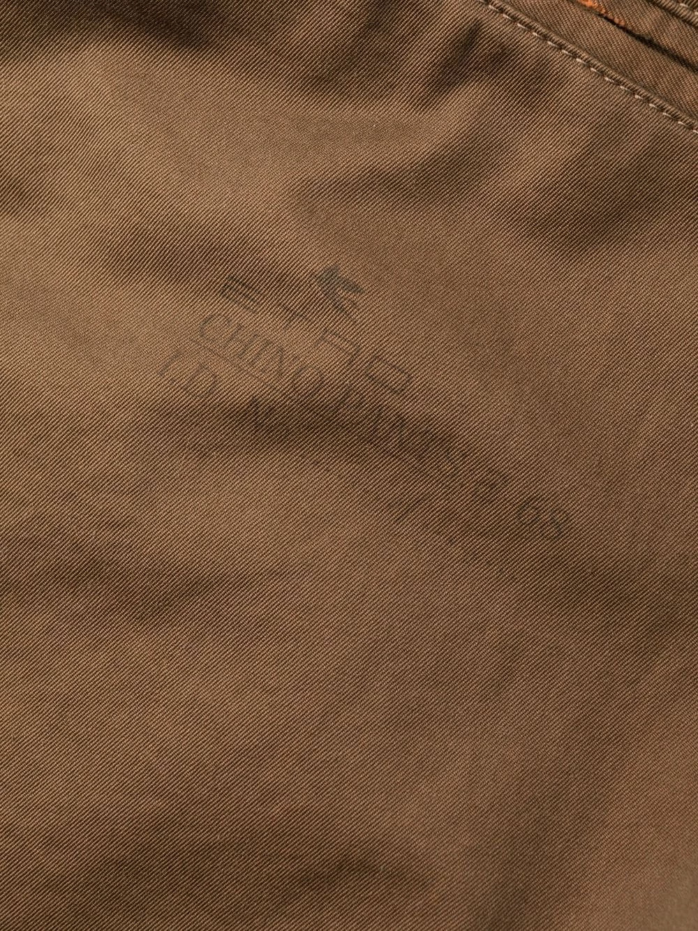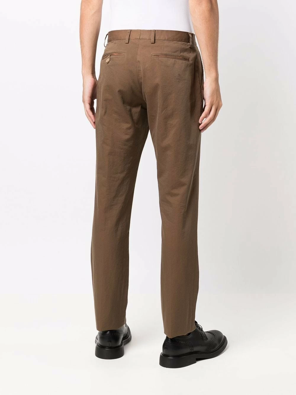 Coupe droite, poches plaquées latérales, deux poches passepoilées à l’arrière, passants de ceinture, fermeture à zip et boutons sur le devant. Couleur : marron. Matière : coton.