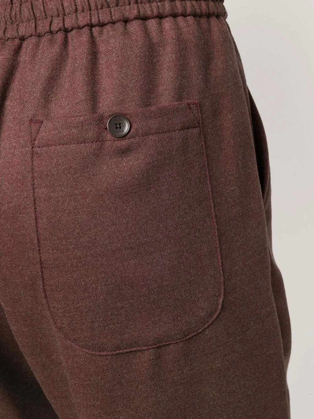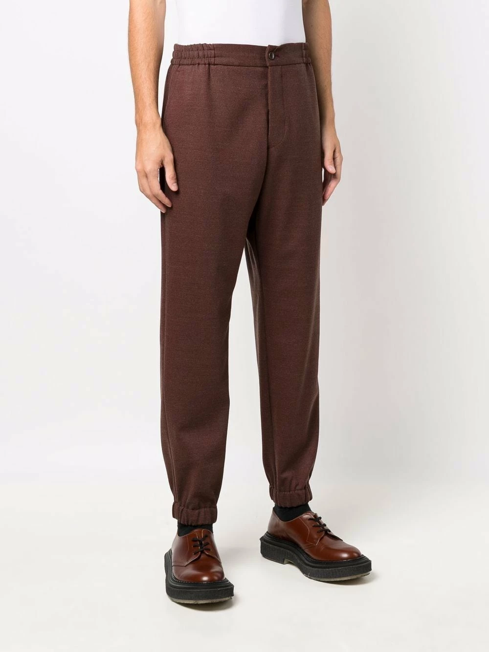 Poches arrière plaquées, poches latérales fendues, ceinture élastique, fermeture à zip et boutons sur le devant, coupe droite, chevilles élastiques. Couleur : marron.