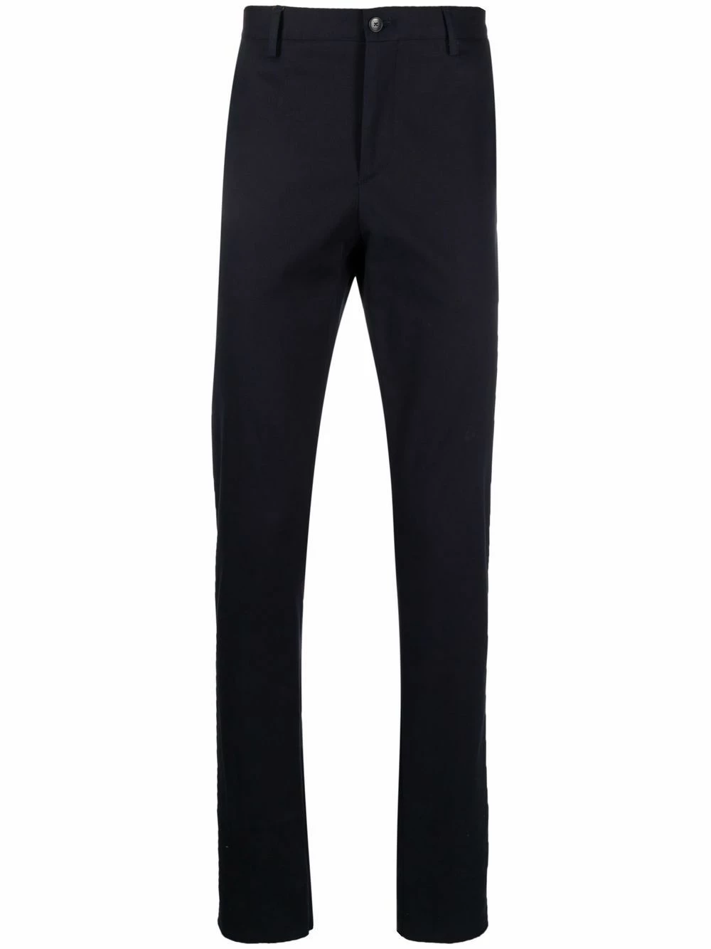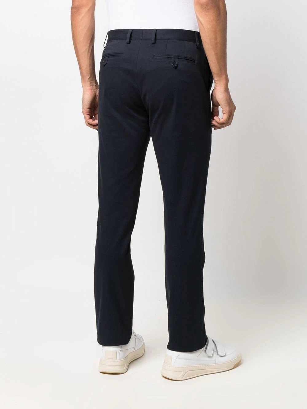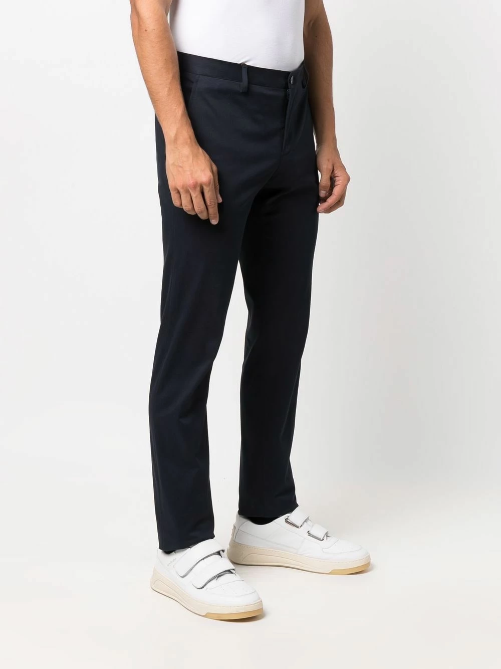 Passants de ceinture, fermeture dissimulée sur le devant, deux poches latérales fendues, poches arrière passepoilées, coupe slim. Matière : coton mélangé.