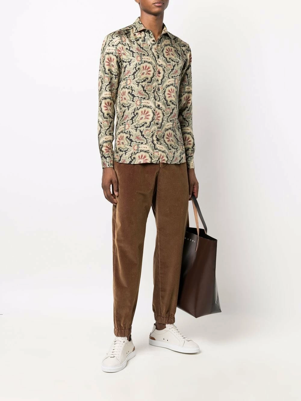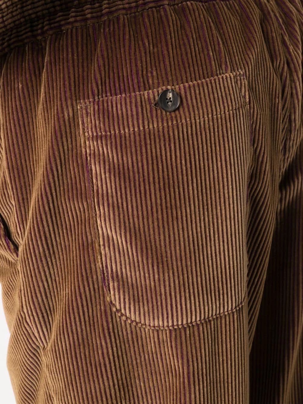 Effet velours, entrejambe sarouel, coupe fuselée, deux poches passepoilées boutonnées à l’arrière, ceinture élastique, fermeture à zip et boutons sur le devant. Couleur : marron. Matière : coton.