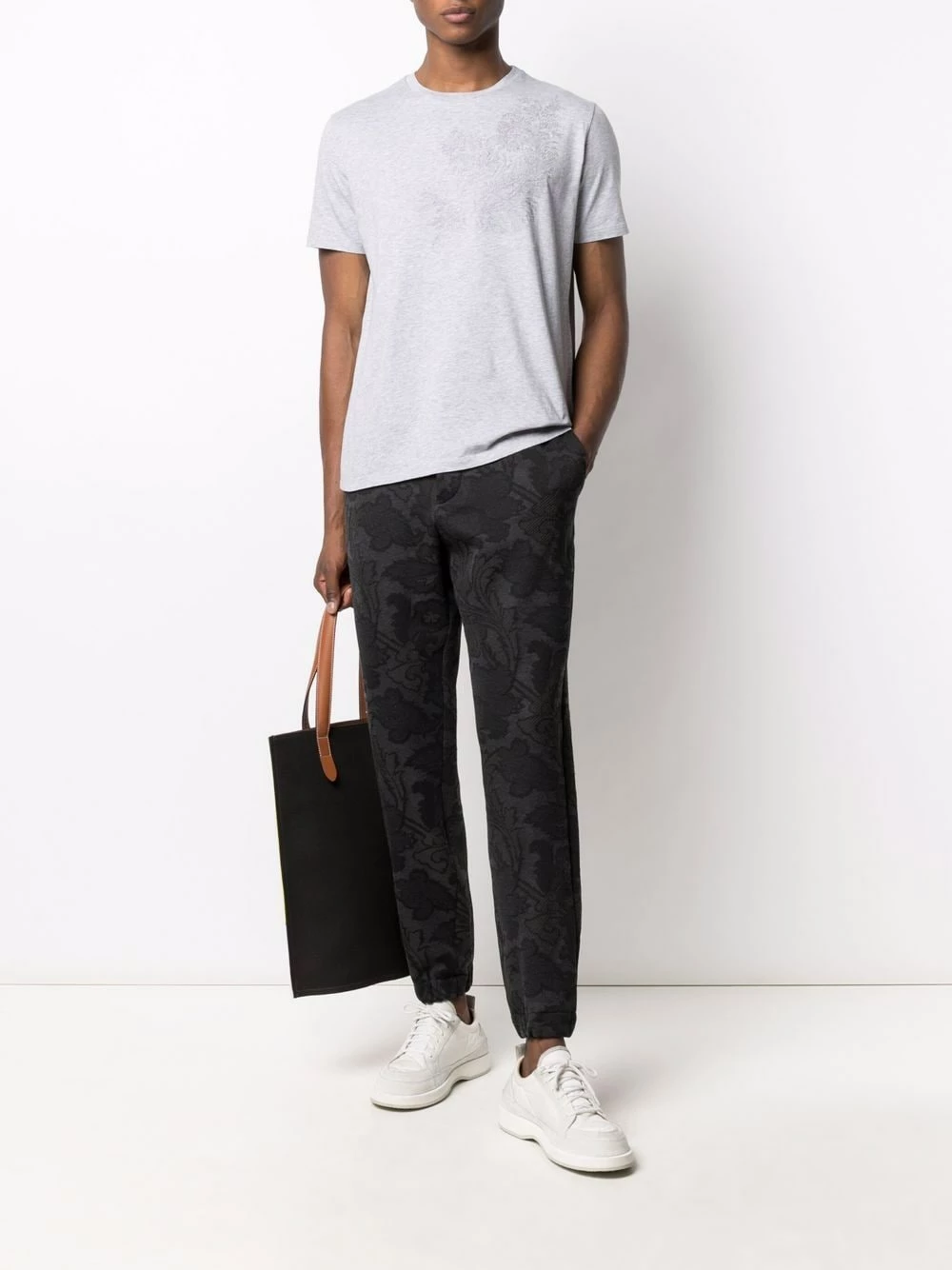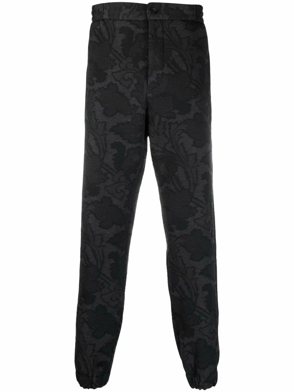 Motif cachemire, fermeture à zip et boutons sur le devant, ceinture élastique, poches latérales fendues, deux poches arrières boutonnées, poignets élastiqués. Couleur : gris.