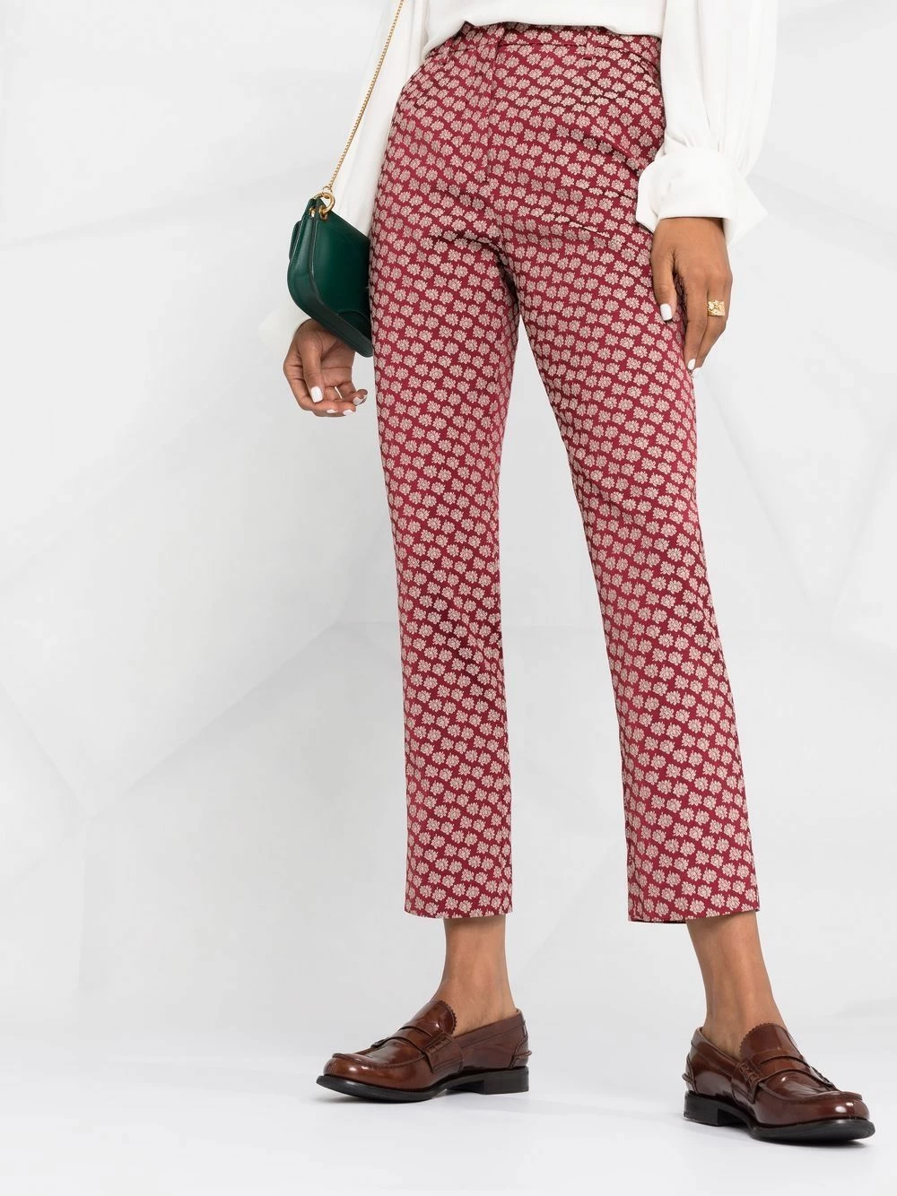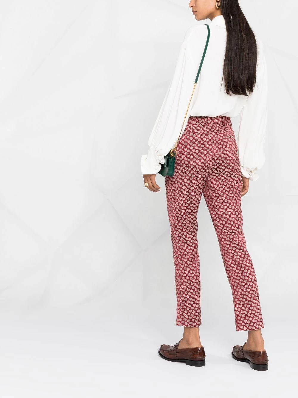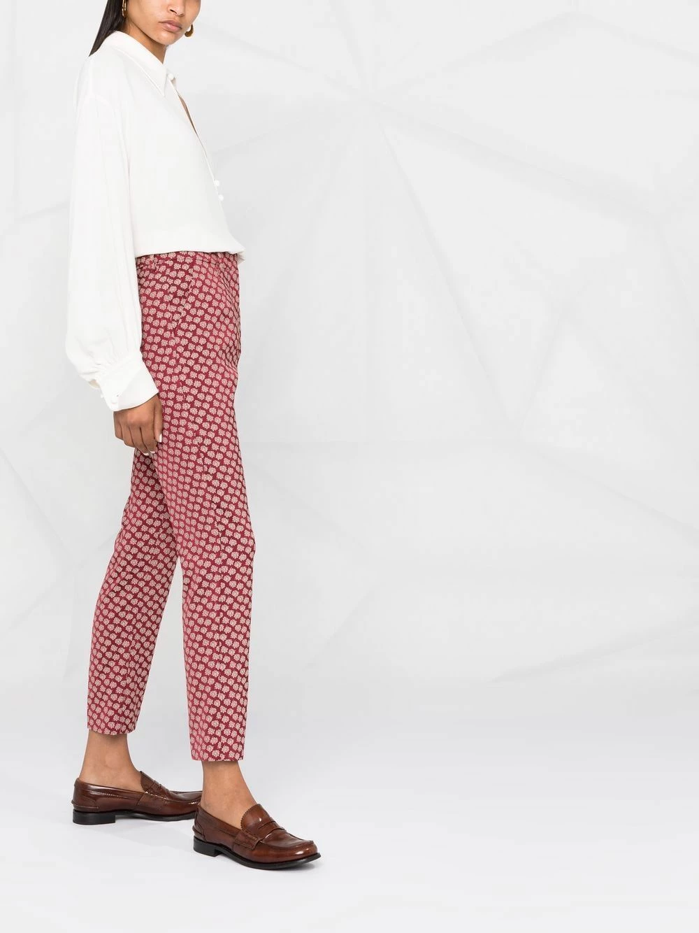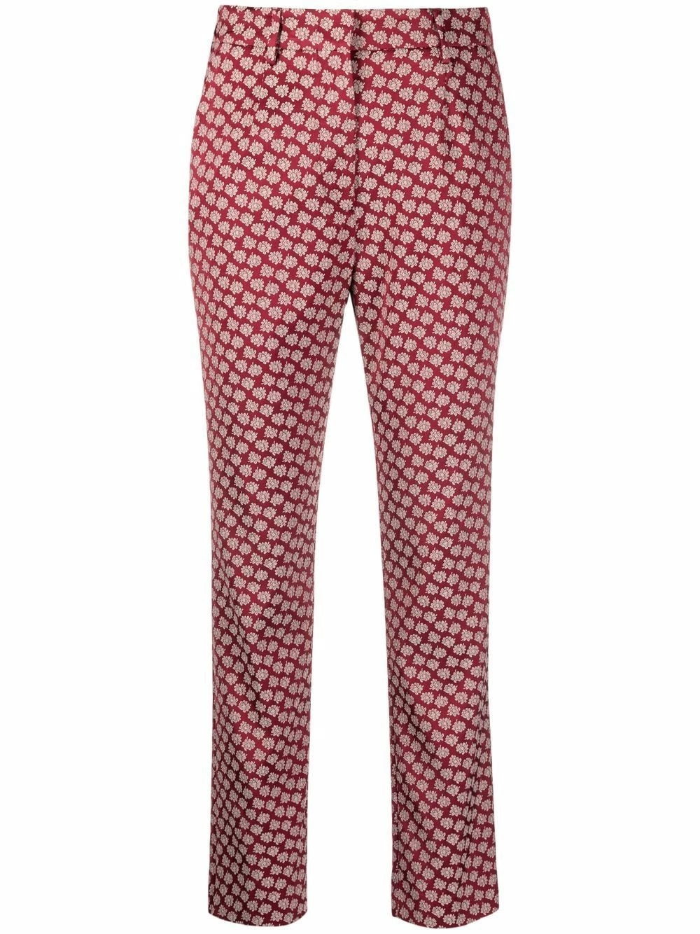 Boutonnière dissimulée sur le devant, passants de ceinture, deux poches latérales fendues, coupe droite, motif de fleurs. Couleur : rouge.