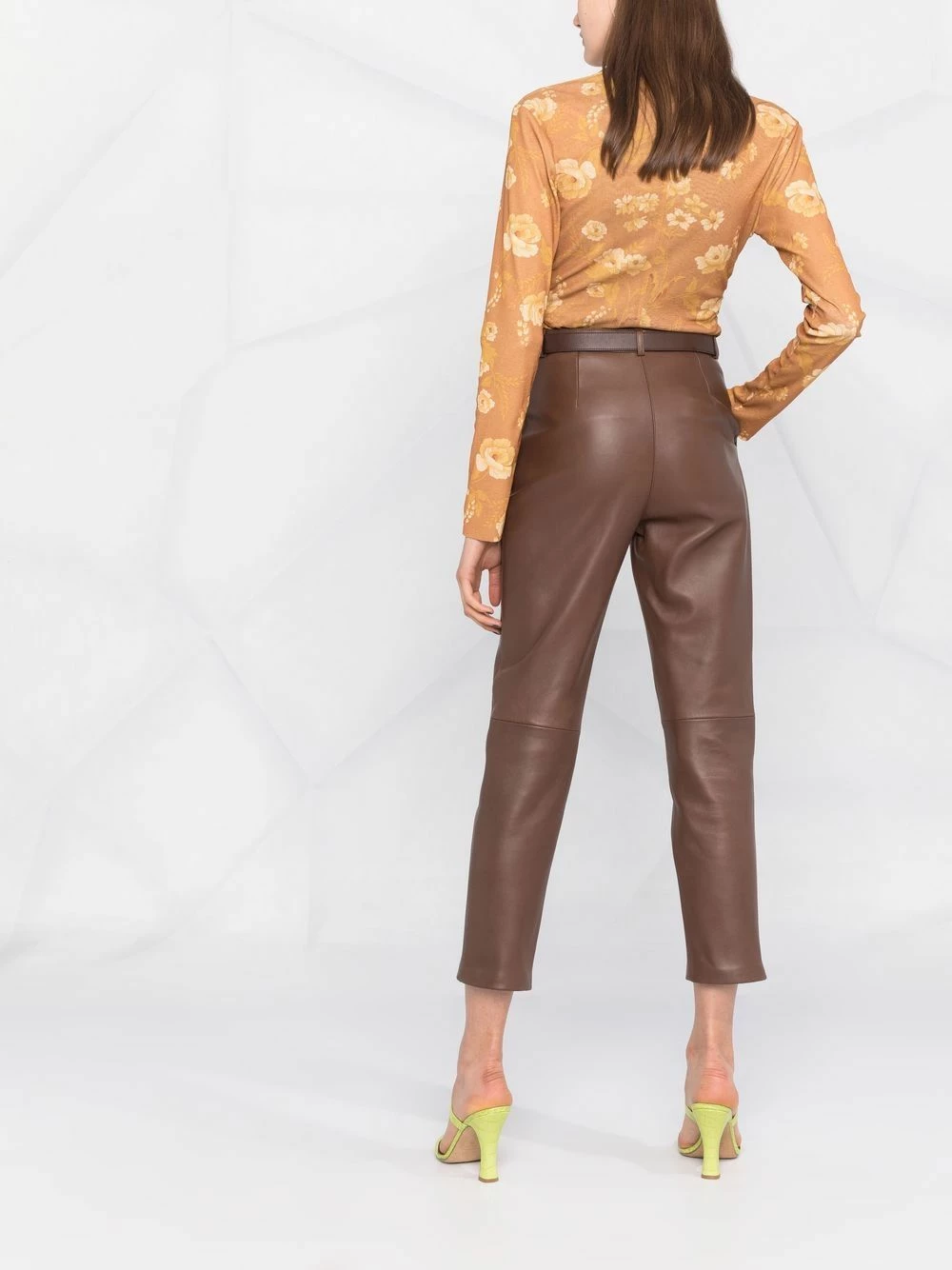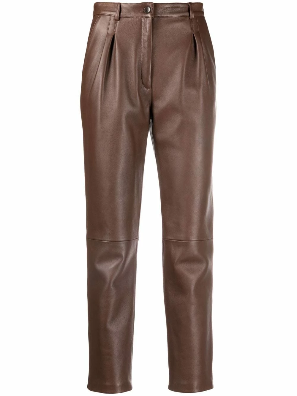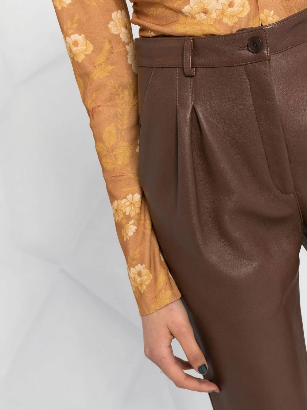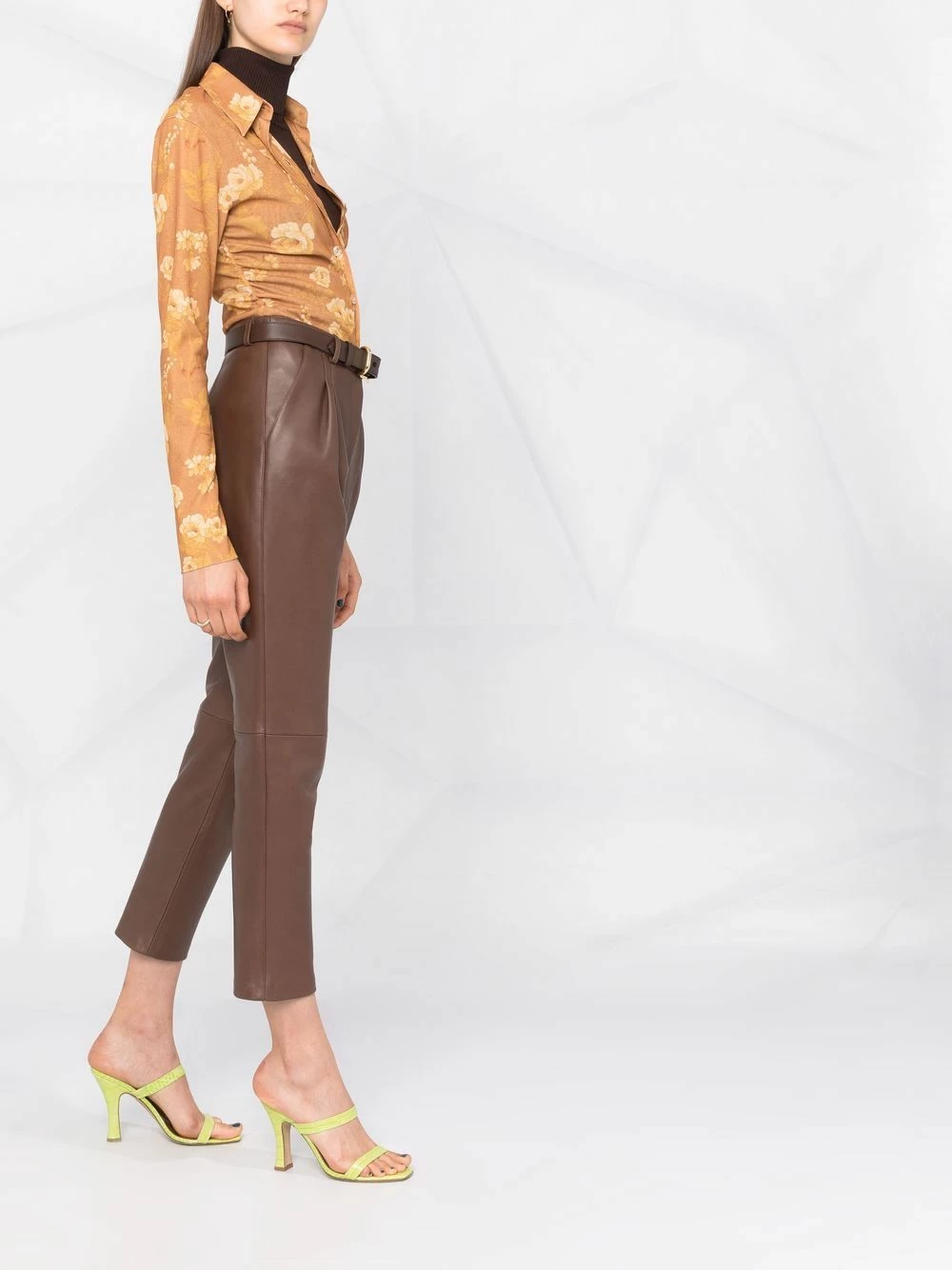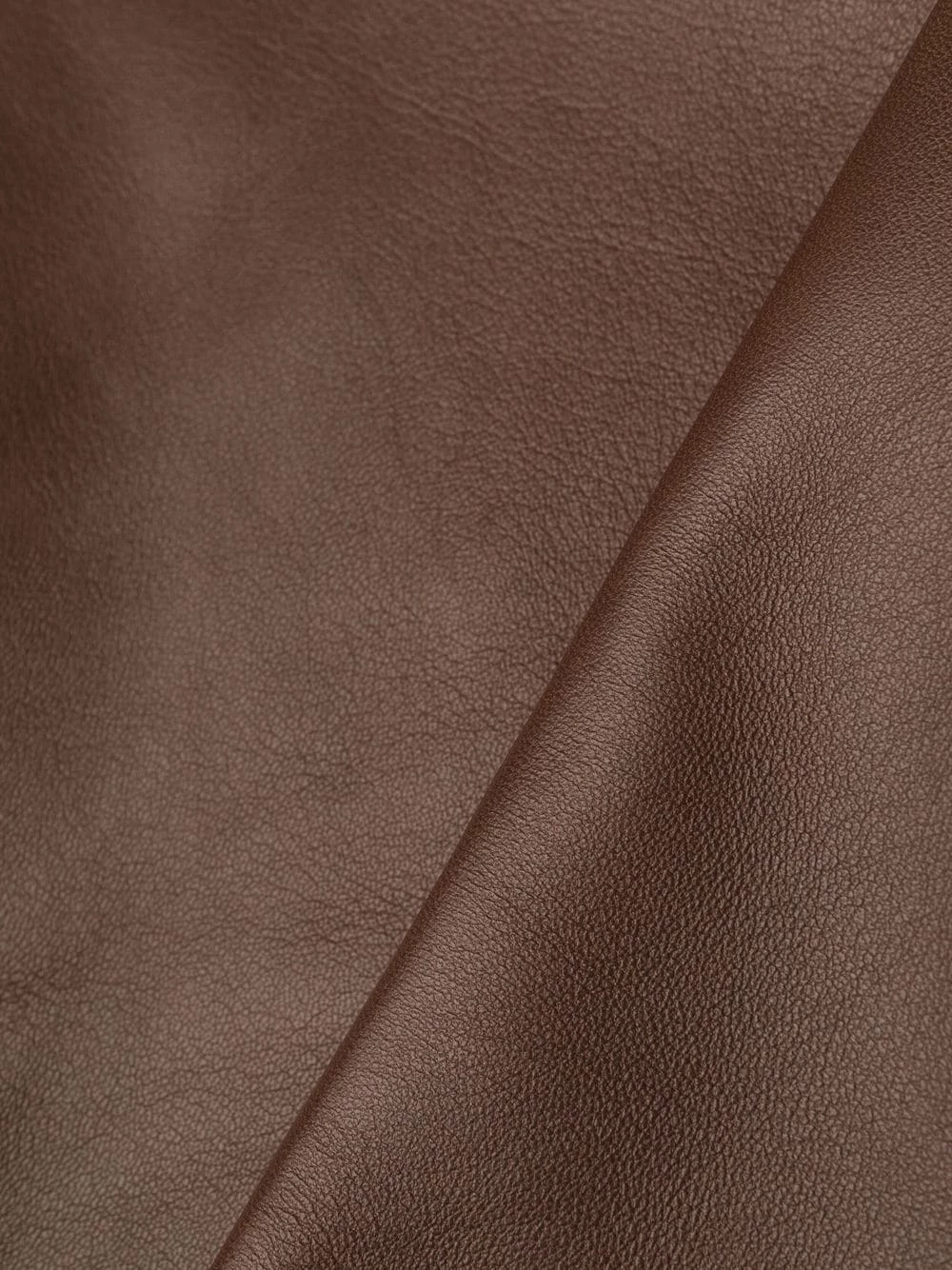Détails de plis, passants de ceinture, fermeture à zip et boutons sur le devant, deux poches latérales fendues, coupe courte. Matière : peau d’agneau.