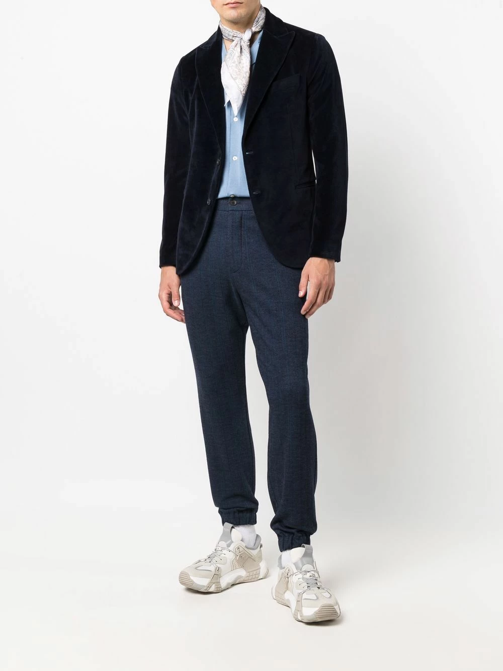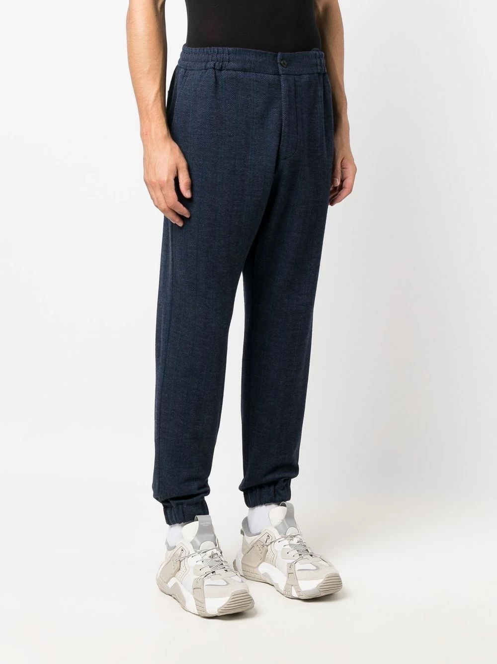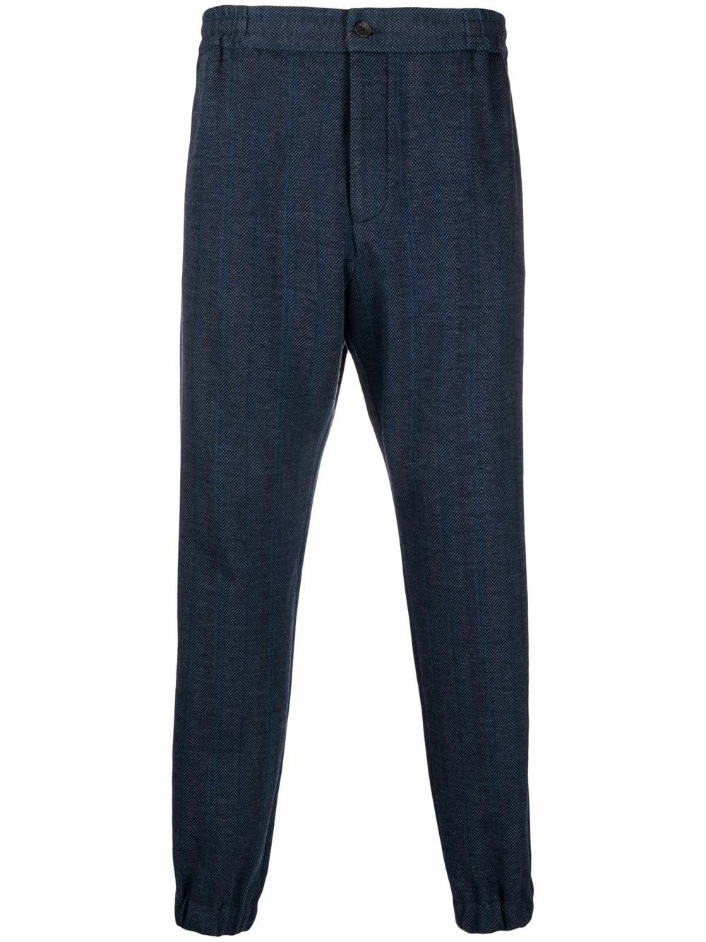 Ceinture élastique, boutonnière sur le devant, deux poches latérales fendues, poches arrière plaquées, poignets élastiqués.