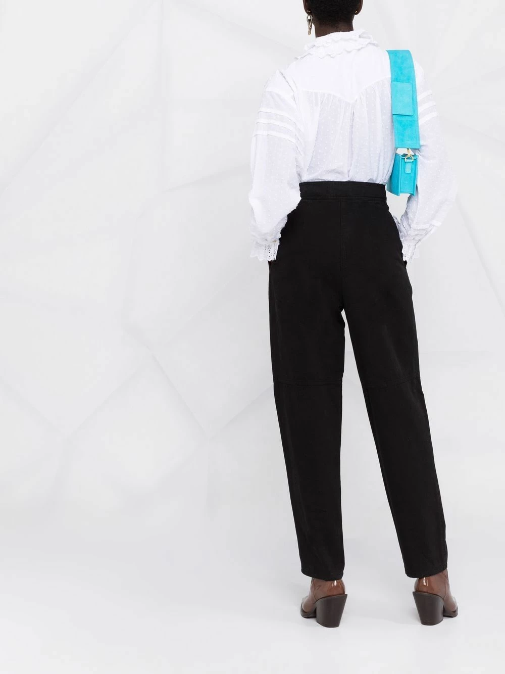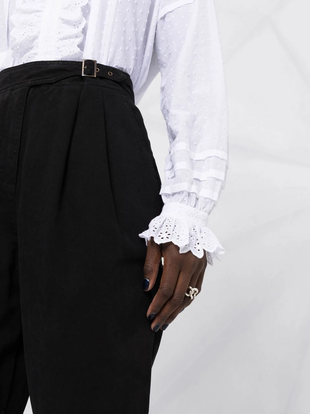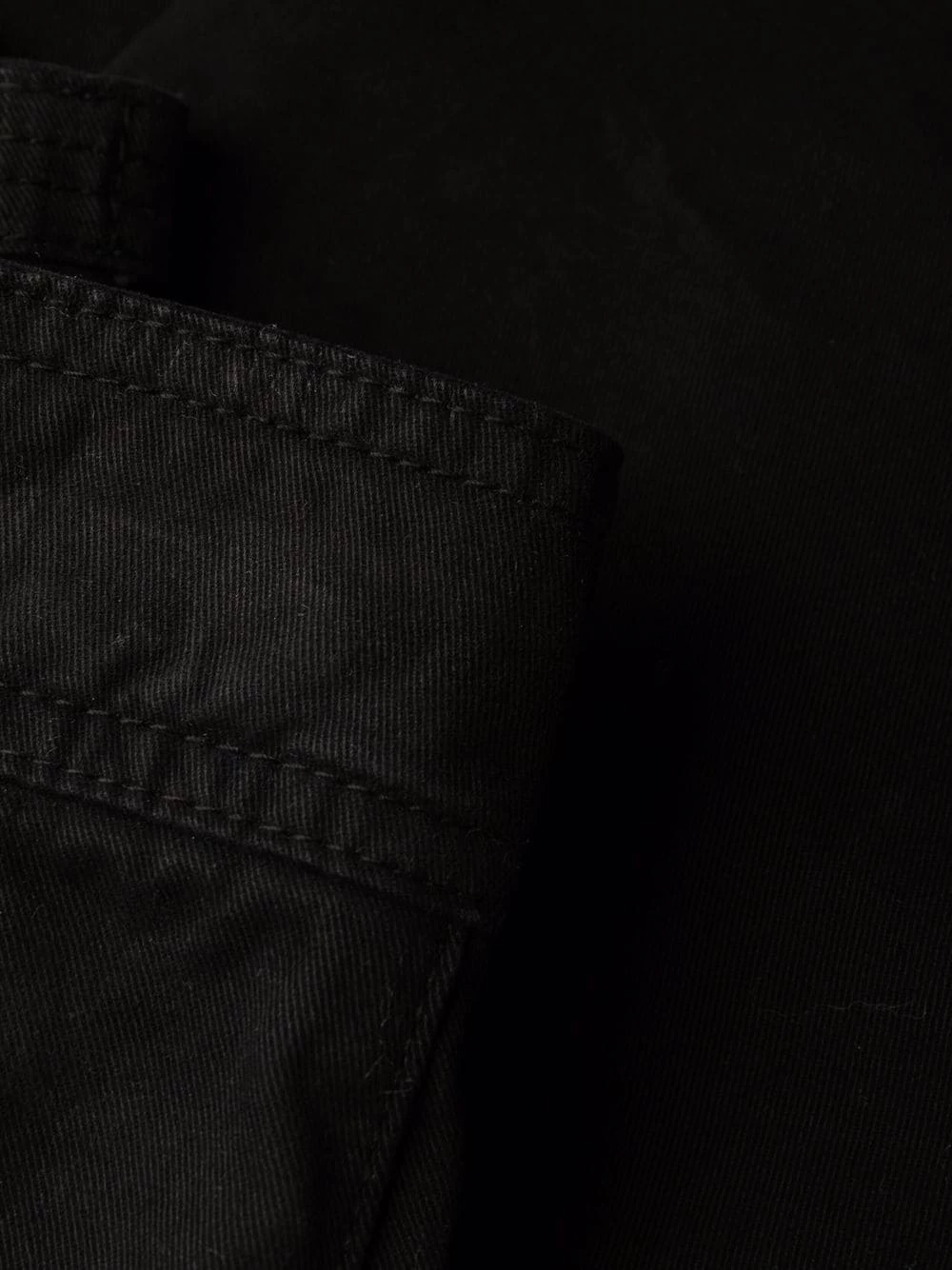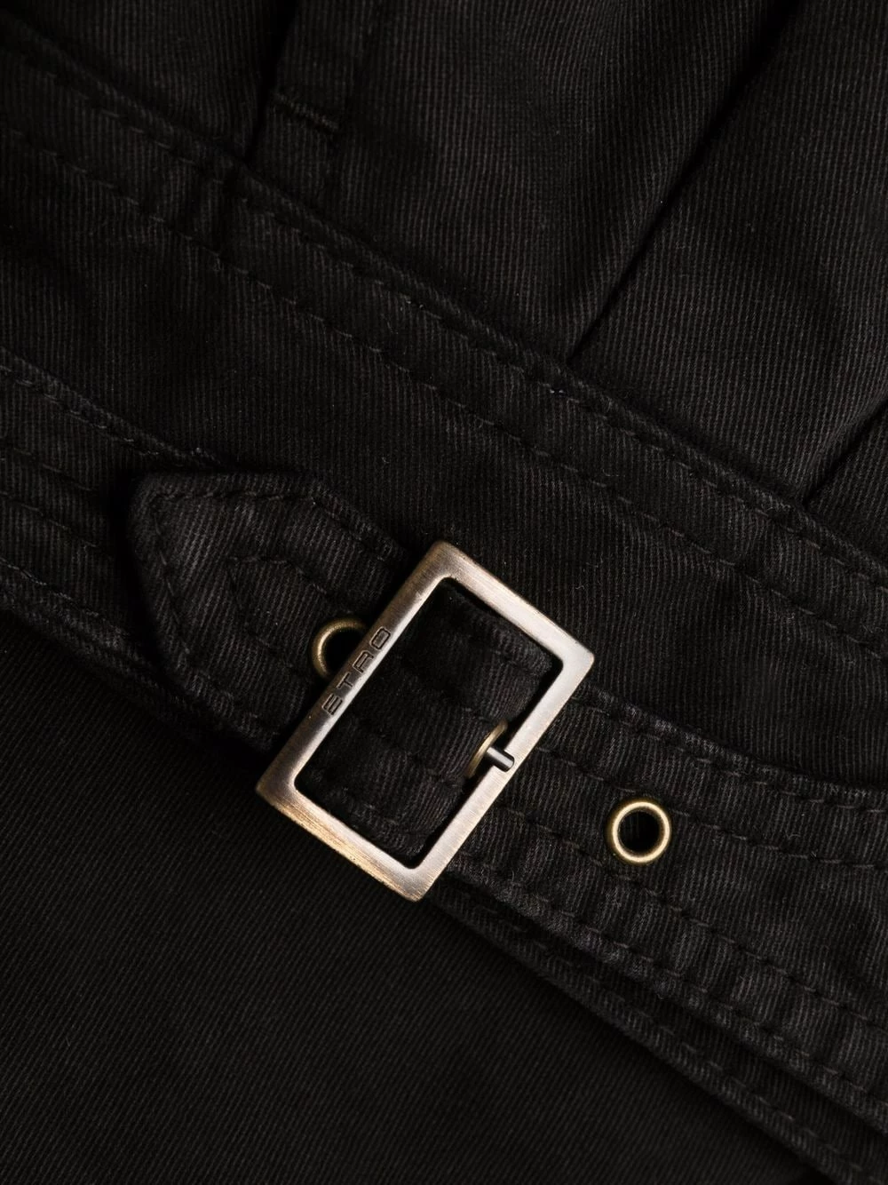 Taille haute, fermeture à boucles sur les côtés, fermeture zippée devant, détails de plis, poches latérales fendues, coupe fuselée, coutures ton sur ton. Couleur : noir. Matière : coton.