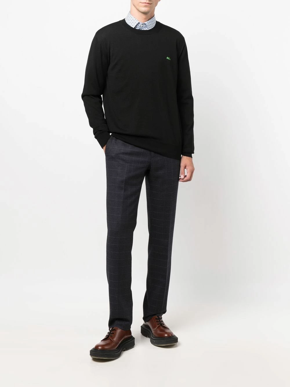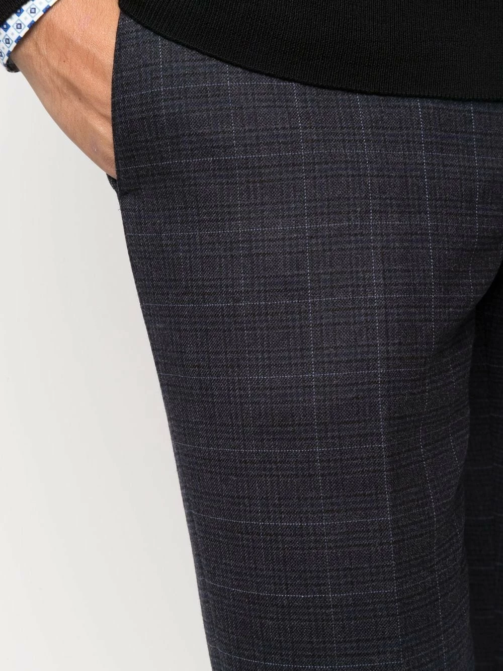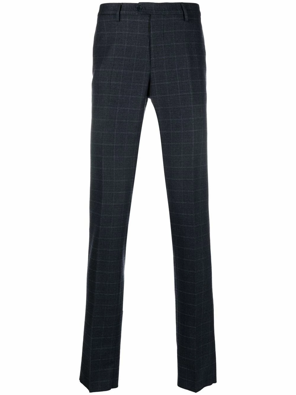 Motif grille, taille mi-haute, passants de ceinture, fermeture à zip et boutons sur le devant, coupe slim.