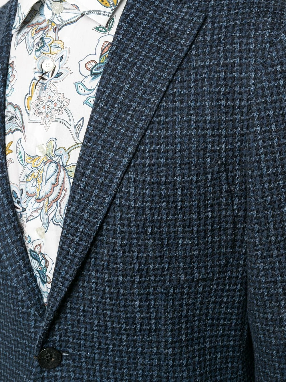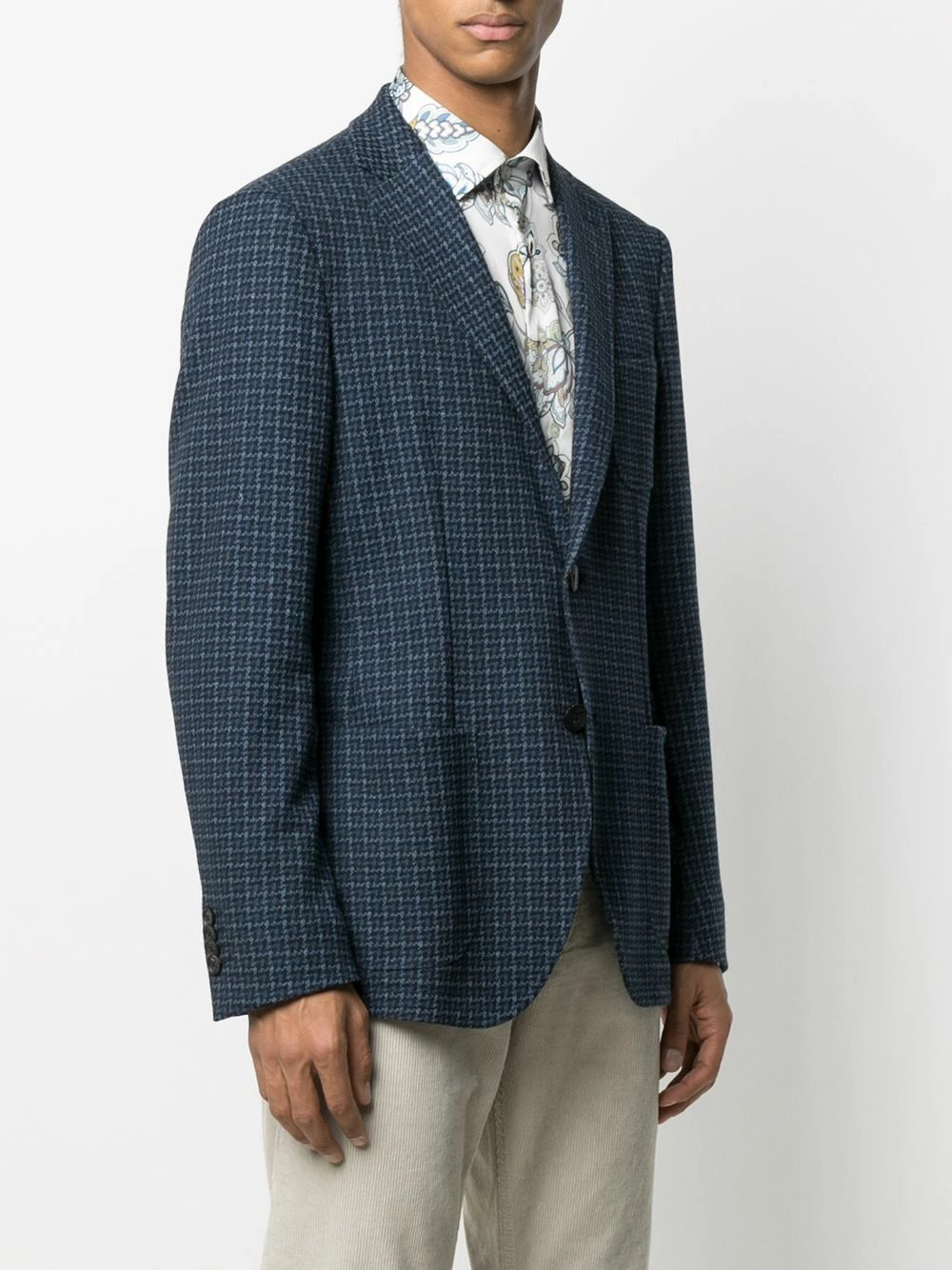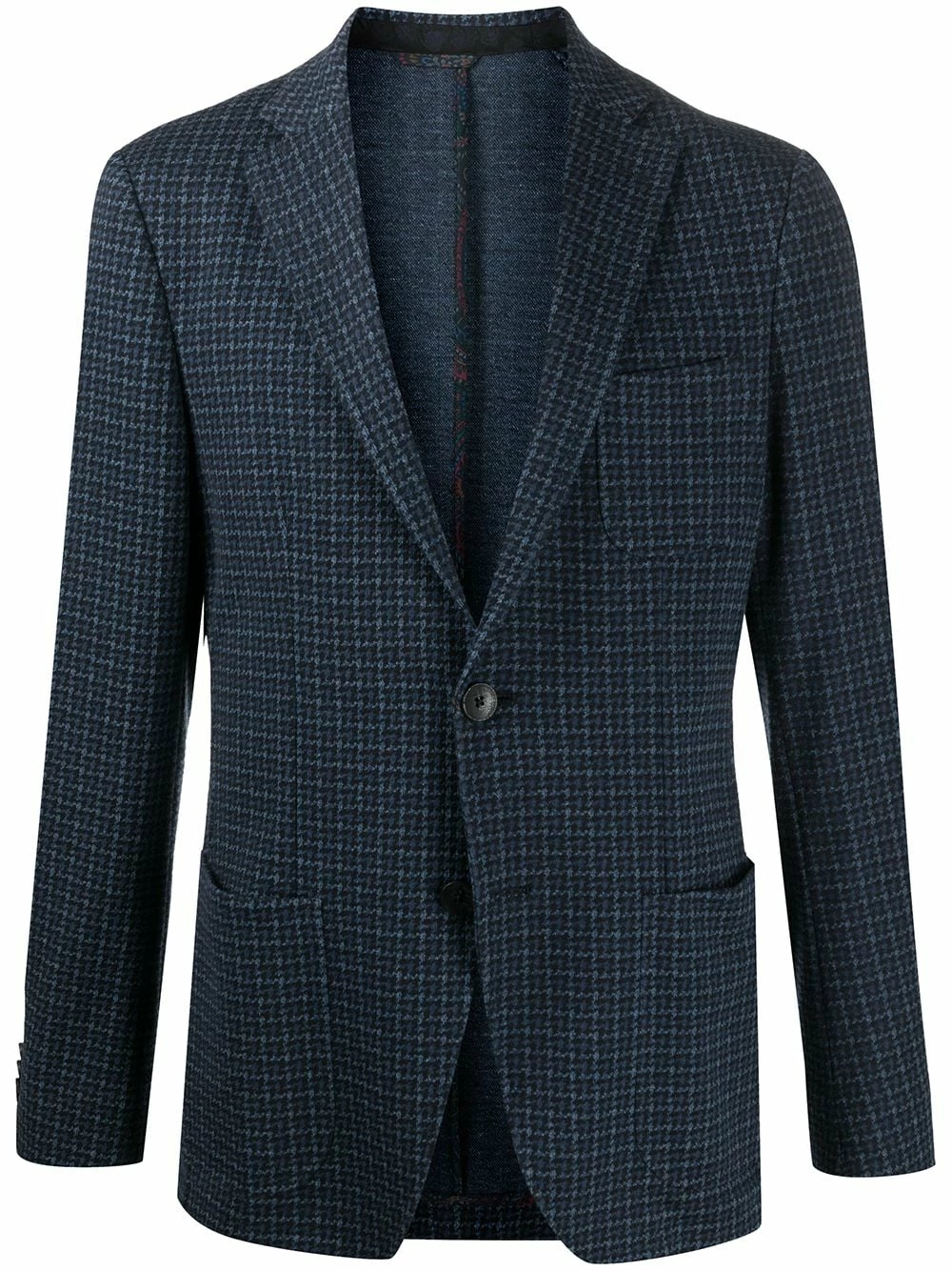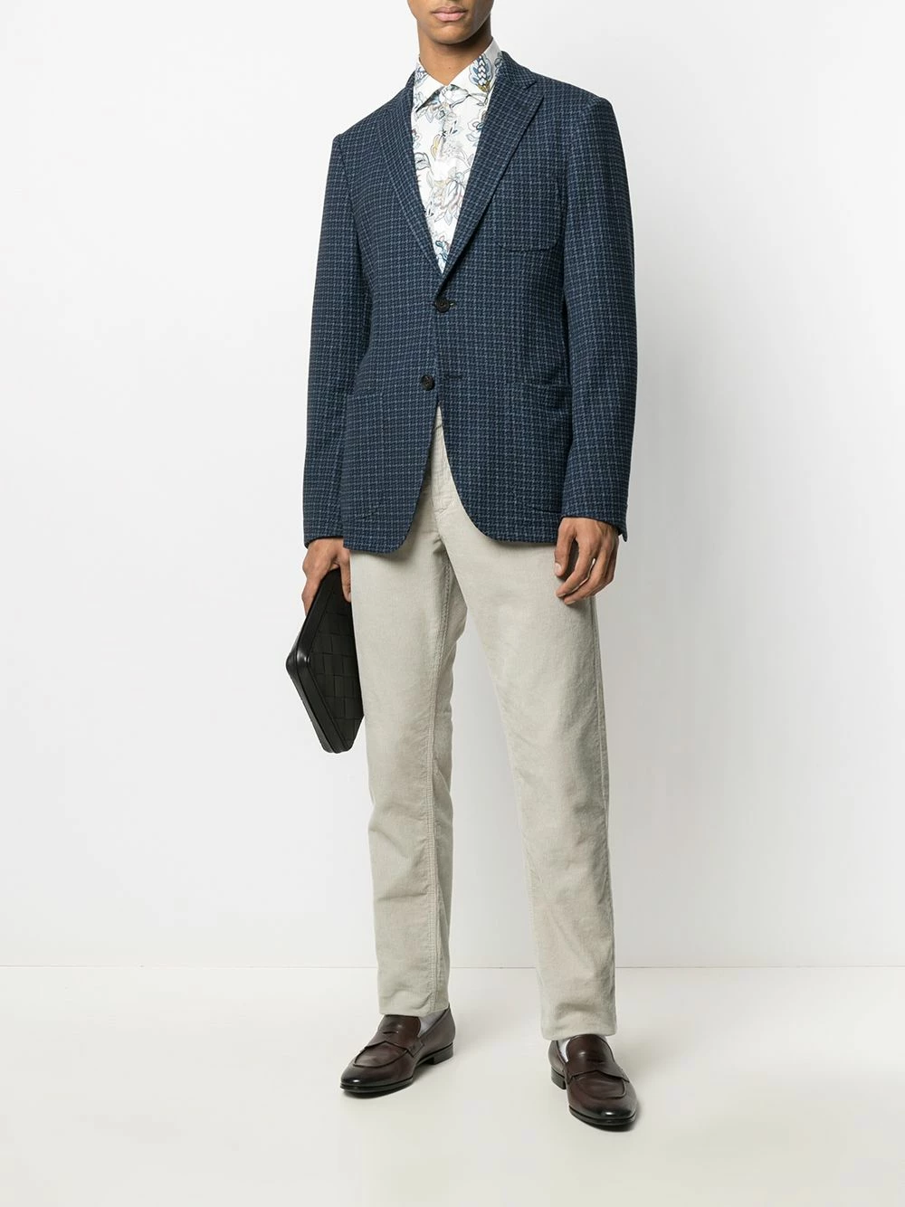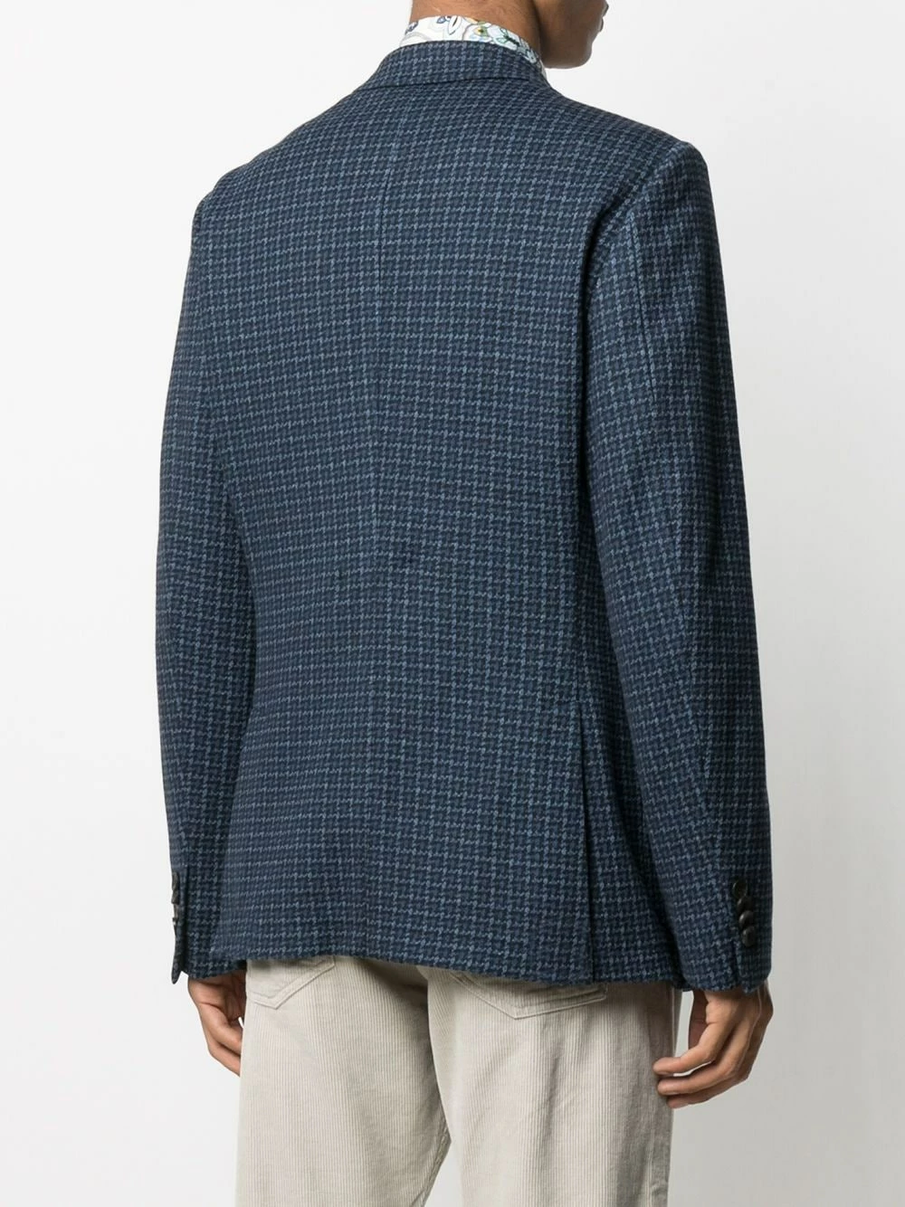 Motif de chevrons, revers crantés, deux poches plaquées avant, poche poitrine plaquée, manches longues, boutonnière sur le devant. Couleur : bleu.