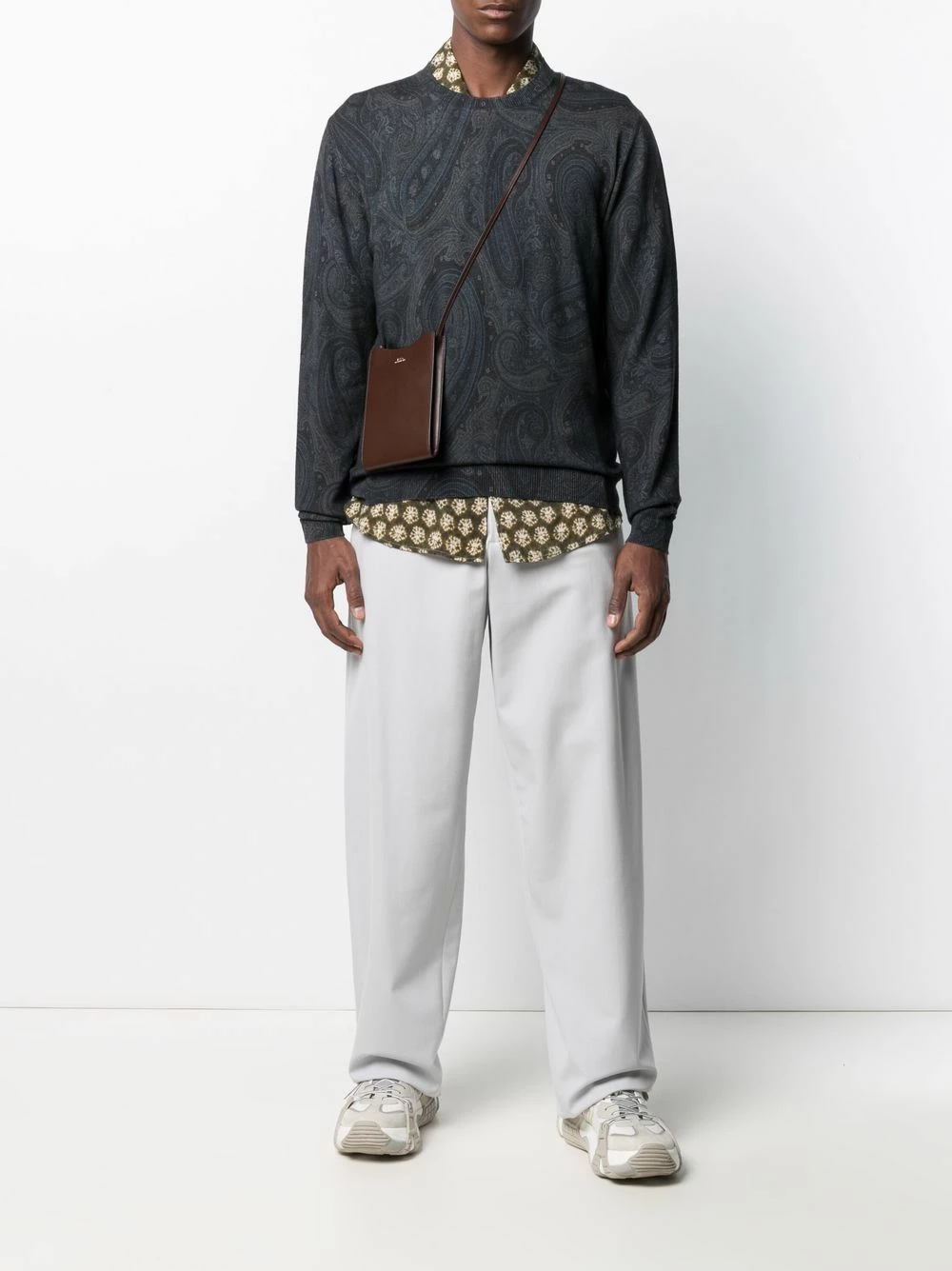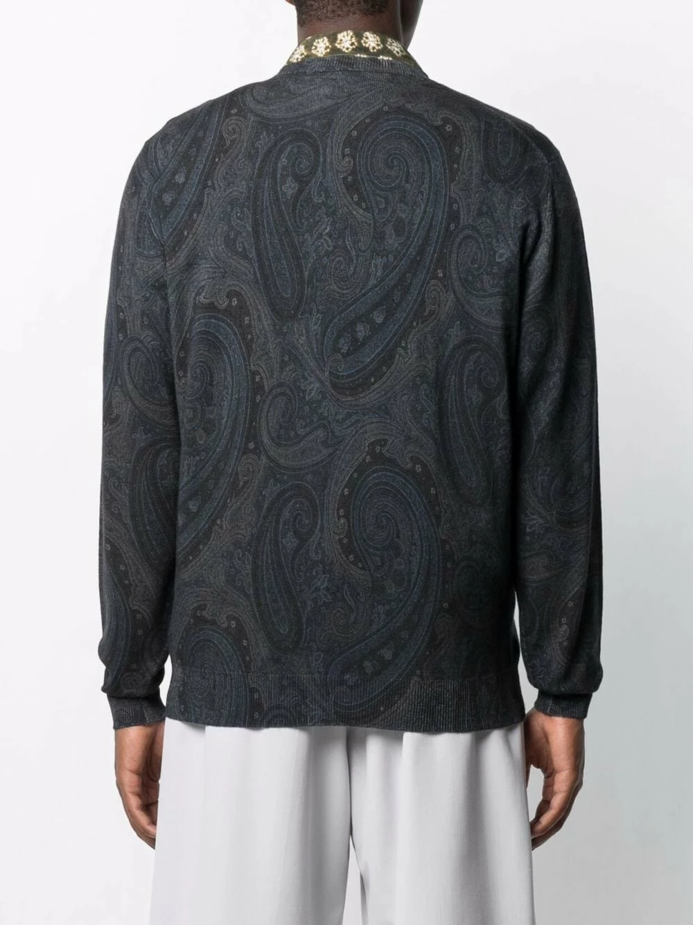 Motif cachemire, détail nervuré, encolure ronde, manches longues. Couleur : bleu. Matière : laine vierge.