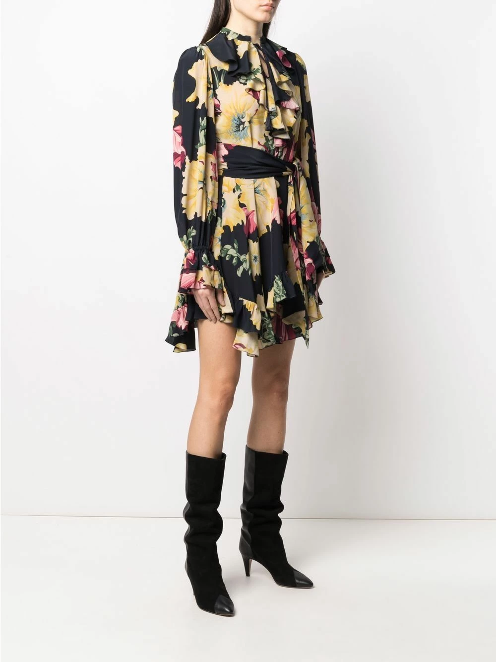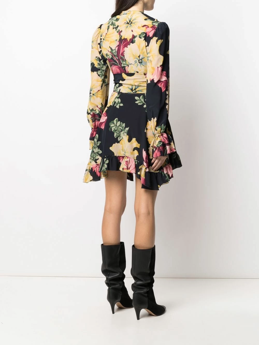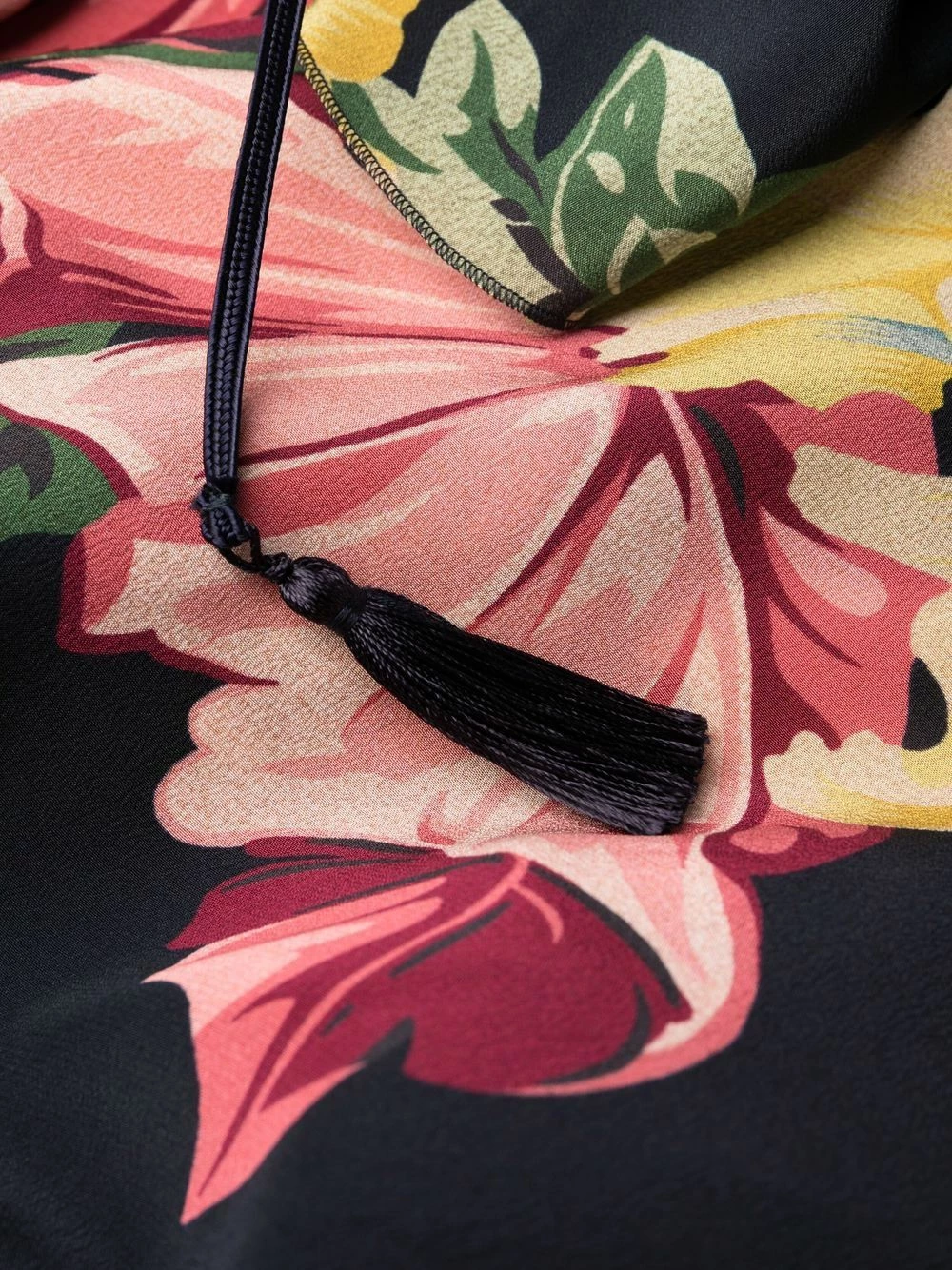 Motif de fleurs, détails de volants, fermeture à nouer sur le devant, manches longues, poignets élastiqués. Matière : soie.