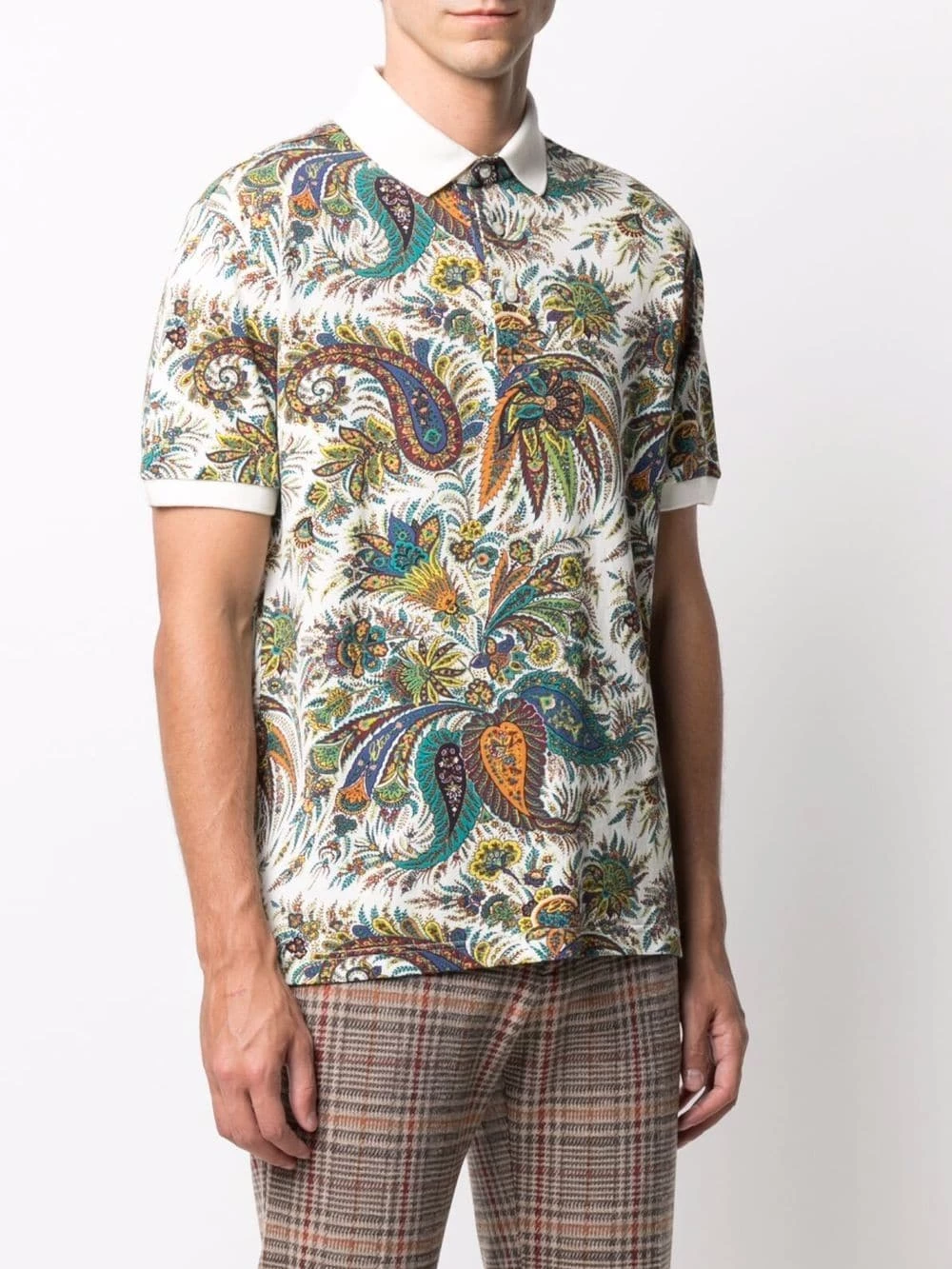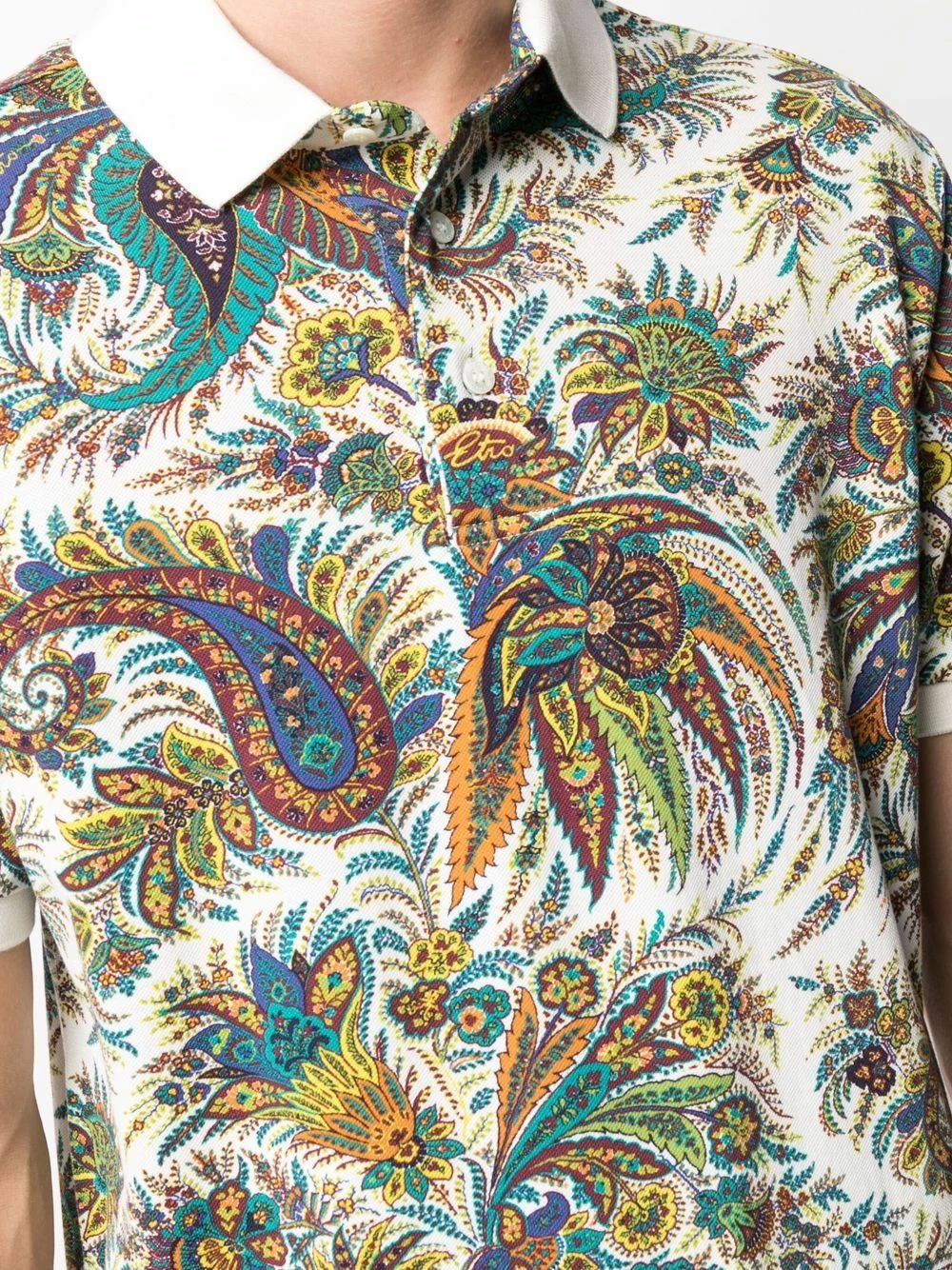 Motif cachemire, col polo, manches courtes, ourlet droit, patte de boutonnage sur le devant. Matière : coton.