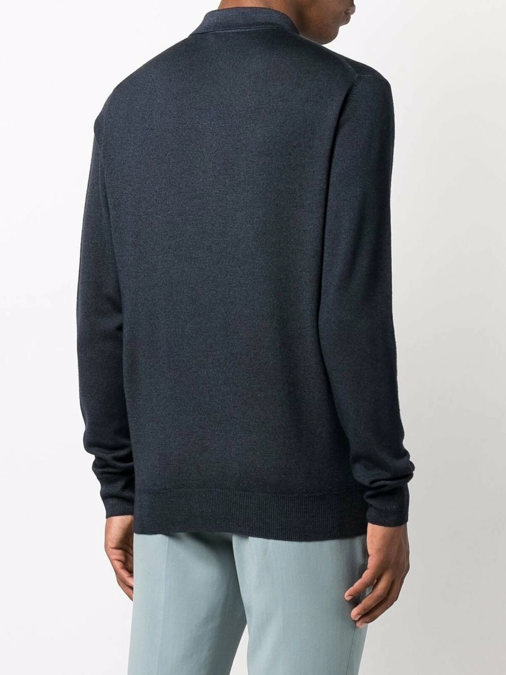 Ourlet élastiqué, col polo, boutonnière sur le devant, manches longues. Matière : laine vierge.