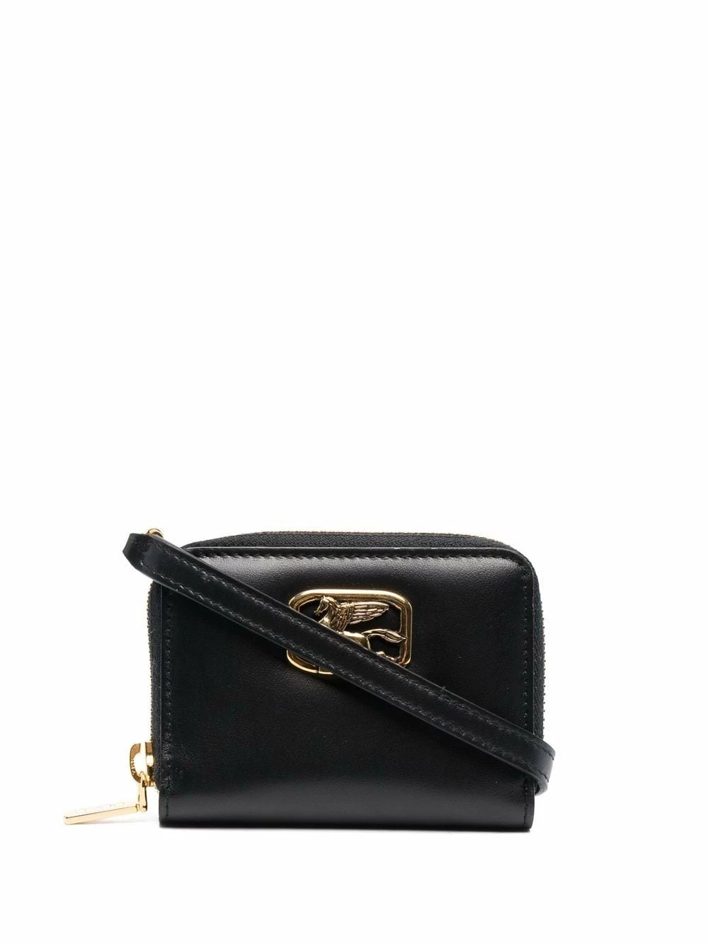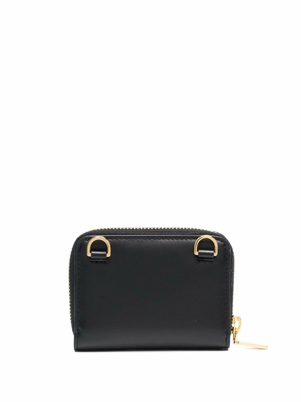 Finitions en métal doré, bride porté autour du cou détachable, fermeture zippée tout autour, logo imprimé à l’intérieur, fentes pour carte intérieures. Couleur : noir. Matière : cuir.