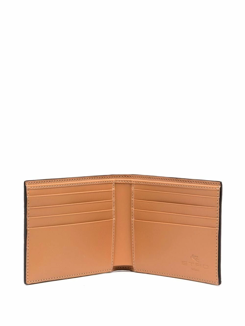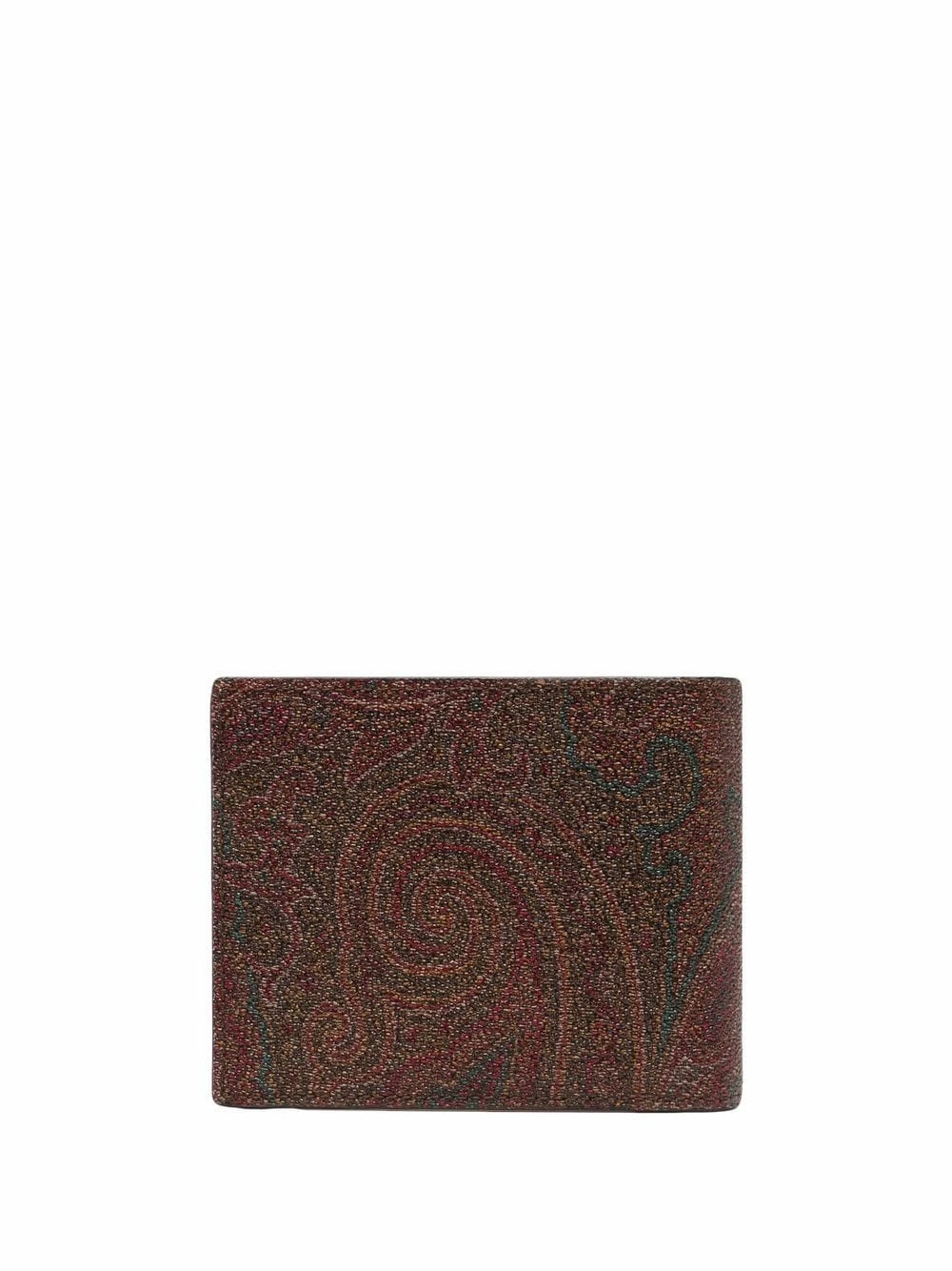 Motif cachemire, logo gravé, rabat sur le dessus, compartiments intérieurs pour carte, compartiment à billets. Couleur : marron. Matière : cuir de veau.