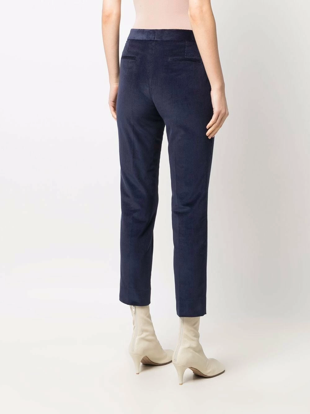 Velours côtelé, plis marqués, fermeture dissimulée sur le devant, coupe slim, deux poches latérales fendues, poches arrière passepoilées.