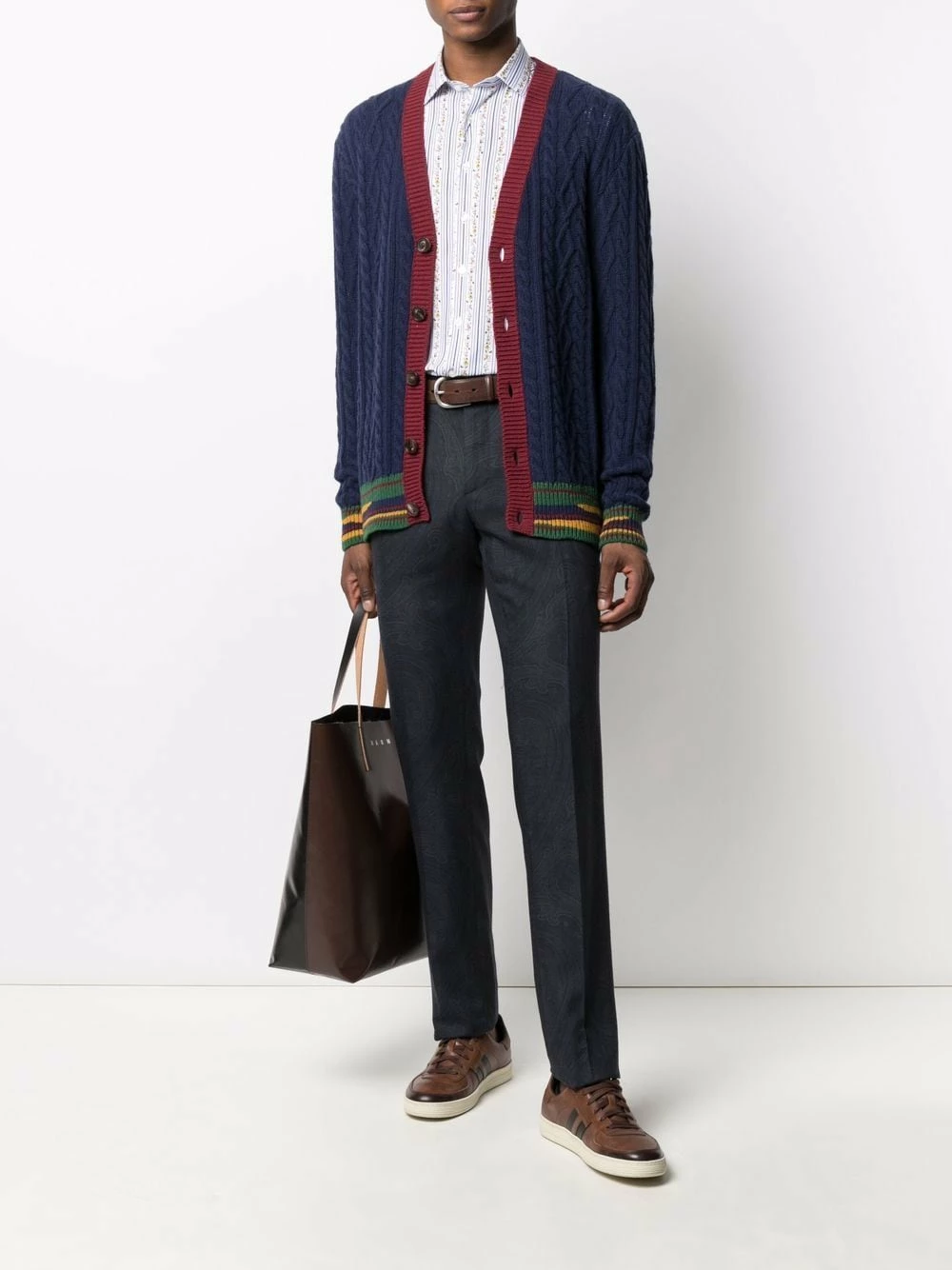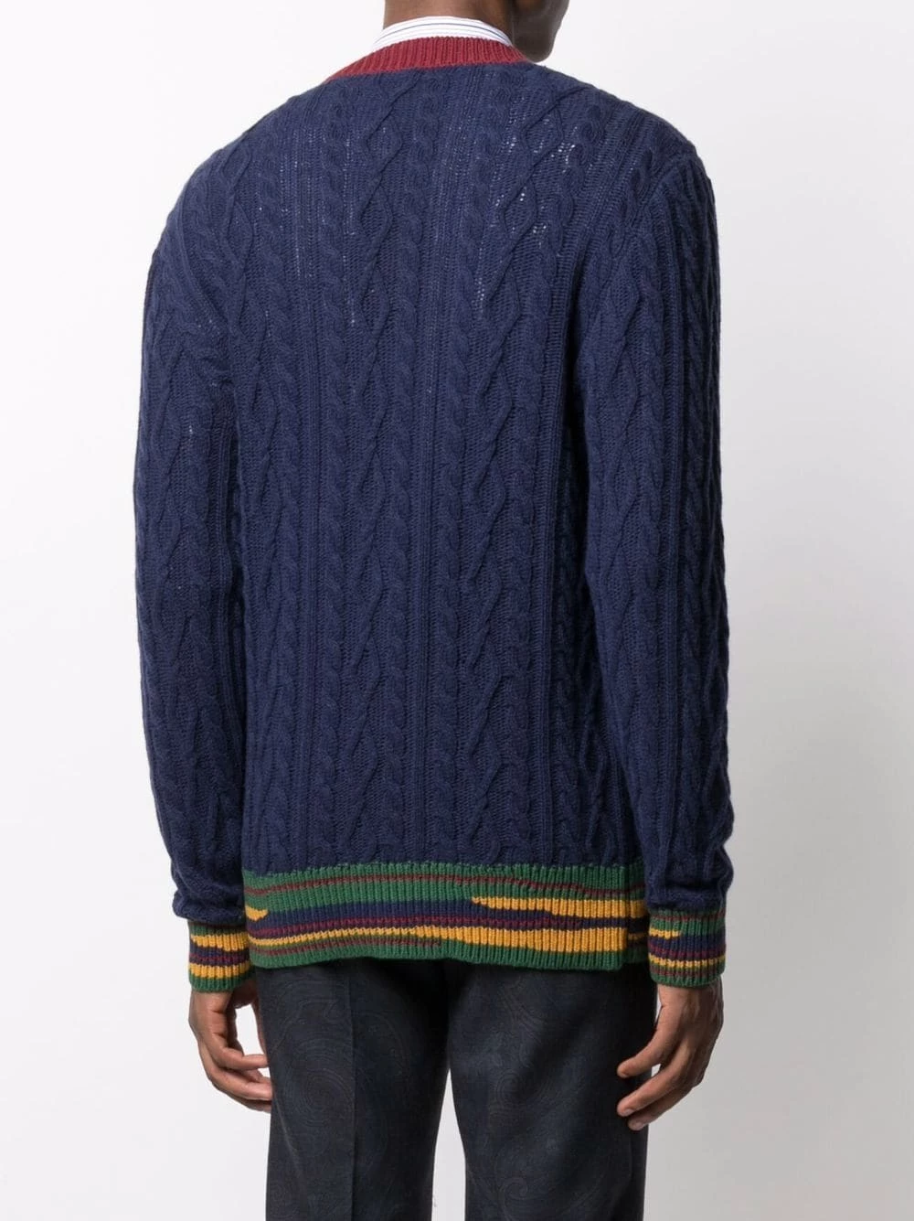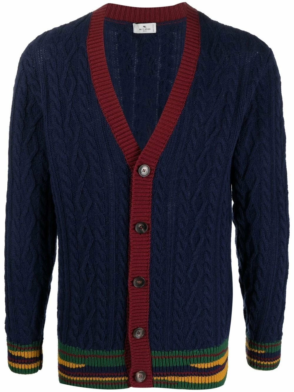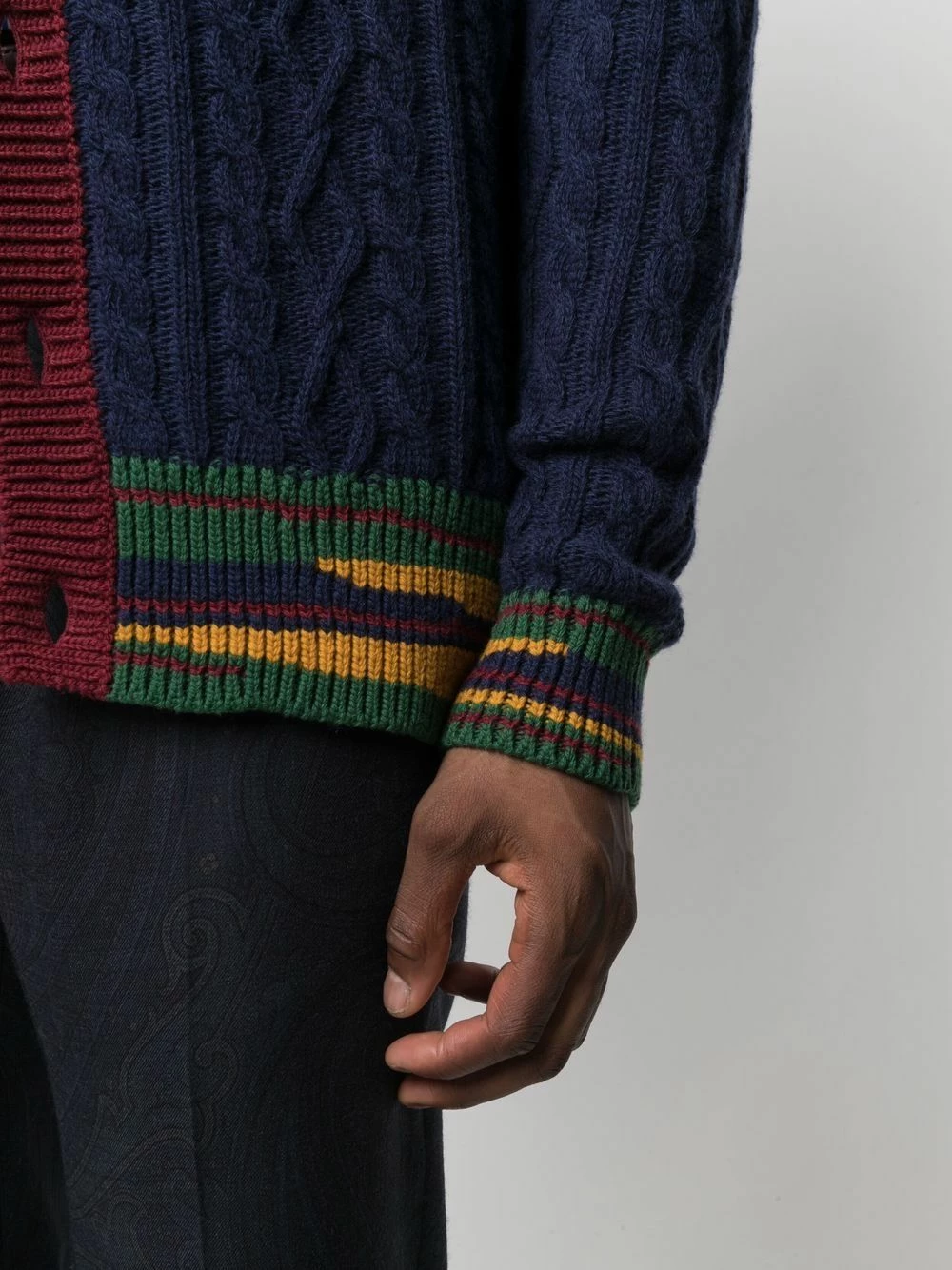Tricot torsadé épais, détail nervuré, design colour block, col v, boutonnière sur le devant, manches longues, bordure rayée. Matière : laine.